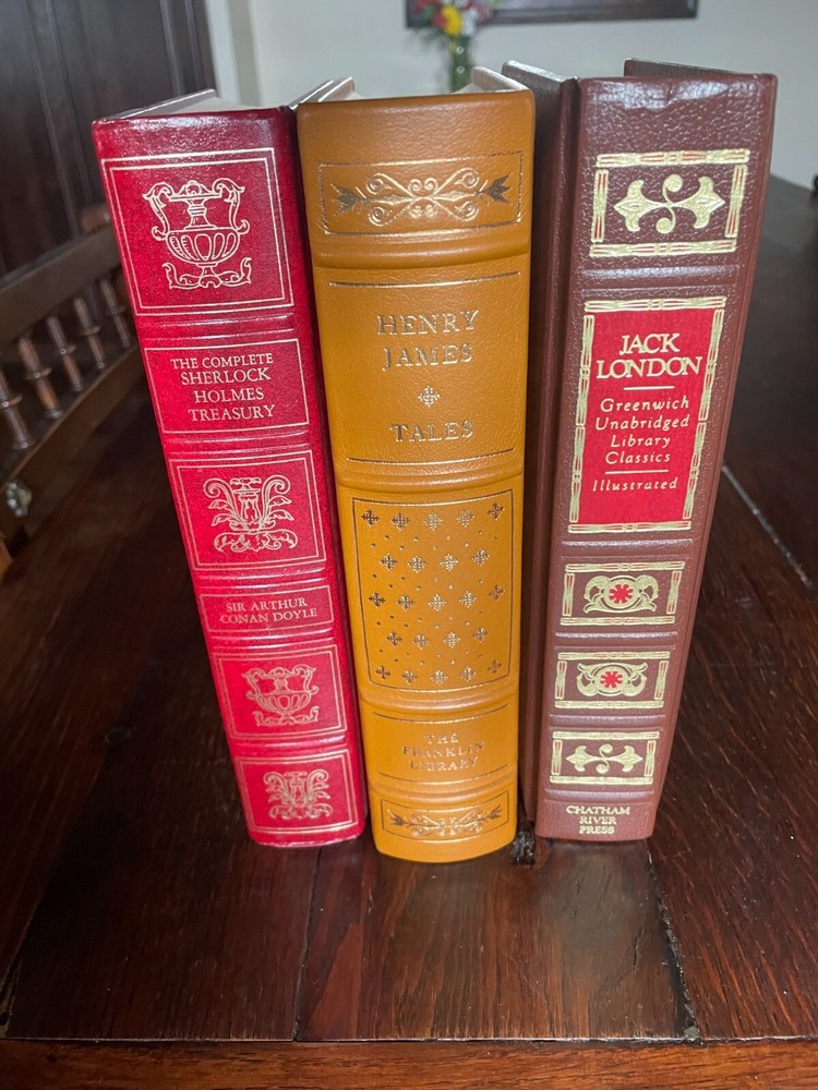 3 Franklin LibraryLeather Spines London 1980 James 1977 Sherlock Holmes 1976 Jack London Greenwich Unabridged Library Classics 1980 The Complete SHERLOCK HOLMES TREASURY 1977 Henry James Nine Tales 1977