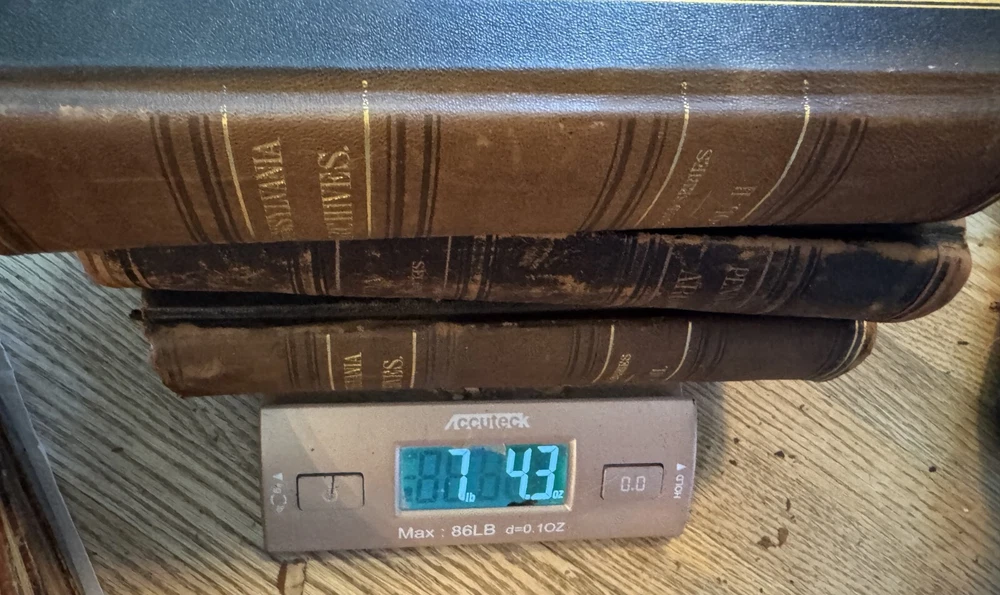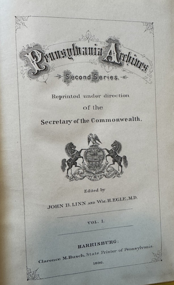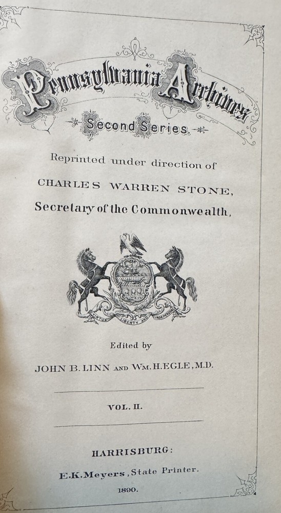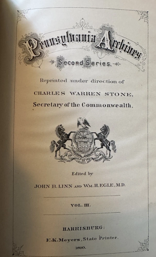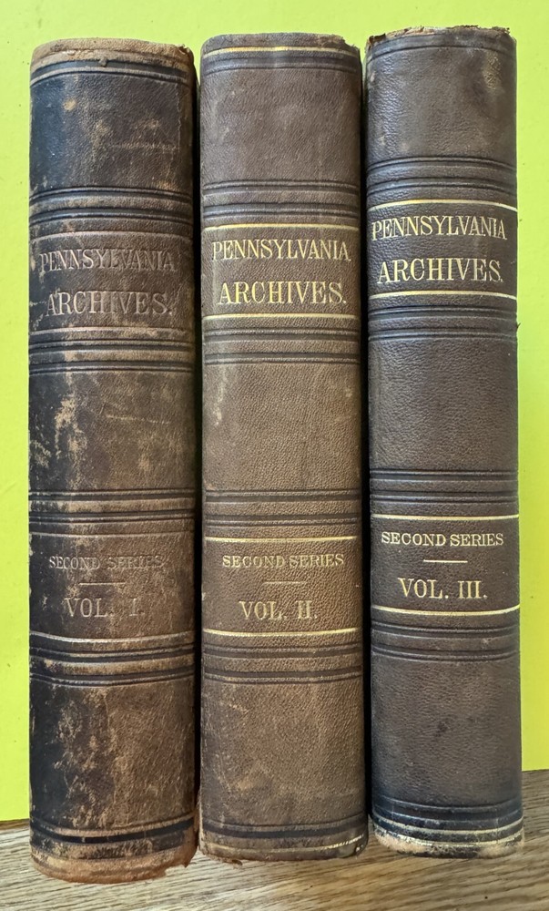Title : Pennsylvania Archives - Second Series Description: These books date to the late 1800s. The covers are 3/4 leather. The interiors are good. There is no writing or torn pages. All of the covers are firmly attached. None of the pages are loose. The hinges are broken in one of the volumes. The leather on the spines are worn. These books are dusty from storage. Please see the photos. Li(3/18/25) - G