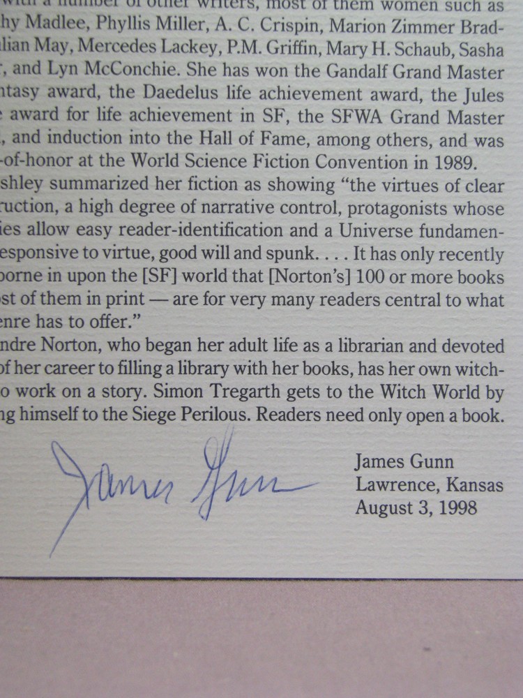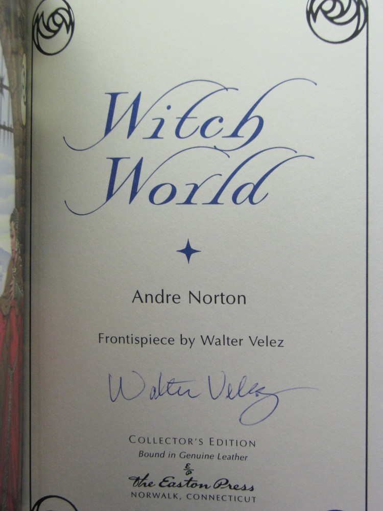 Witch World The First Witch World Novel by Andre Norton (signed photo) Frontispiece by Walter Velez (signed) Collector's Note by James Gunn (signed) Easton Press Collector's Edition Description: Leatherbound hardback book published by Easton Press. Bound in top grade dark blue leather with 22kt gold lettering and cover artwork. Hubbed spine, acid neutral paper with page edges gilded, special endpapers, and a satin ribbon book mark sewn in. Collector's note and unused publisher supplied bookplate laid in (not attached). Originally issued by Easton Press completely unsigned, we have gotten this copy signed as follows: Photo of the author signed by her in gold pen without inscription or personalization laid in; Signed by the frontispiece artist on the title page without inscription or personalization; Signed by the collector's note author on its last page without inscription or personalization. Part of the long out of print Easton Press Masterpieces of Fantasy series. We have many more books autographed by Andre Norton for sale, many are first editions with more than one signature, to see a list, click on the link below: Autographed Andre Norton items for sale Plot Summary (partial - from Wikipedia): During World War II, Simon Tregarth had risen from a common soldier to the rank of lieutenant colonel. In post-war Europe, he had become involved, almost accidentally, in the black market, only to be caught and discharged in disgrace from the military. He had also managed to anger a powerful criminal organization enough for it to send assassins to dispose of him. After months on the run, he knew his time was running out. Then, Tregarth is contacted by Dr. Jorge Petronius, a man with an amazing reputation for hiding men in dire straits. Petronius recounts a fantastic tale of a stone of power, the Siege Perilous of Arthurian legend, that has the power of opening a gateway to a world attuned to the person who sits on it. Disbelieving, but with little to lose, Tregarth gives up all the money he has left and is transported to a land where magic vies with more mundane swords and bows. He arrives in a nearly empty countryside, just in time to witness a savage hunt: a lone woman being chased down by hounds followed by two horsemen. Tregarth rescues the witch Jaelithe and enters the service of Estcarp, a land ruled by witches and threatened by many enemies. One of these is the land of Gorm, which was bloodily taken over by the far-off, mysterious realm of Kolder. Condition: Binding - fine, small amount of transferred gold from sticking to other Easton Press books on the shelves (looks like tiny silver flecks on the leather), a couple of very slight flaws to the page edge gilding, otherwise like new. Dust jacket - none, as issued. Our Business Policies: Use the Contact Seller link near the top of this listing to see our FAQs, which should answer most questions about our business and listing policies. We have moved the extensive text we used to have here to those FAQs. Shipping and Packing: General Information: We always ship in sturdy new boxes with premium heavy duty packing tape, bubblewrap and filler to keep the item(s) away from the sides of the box. The pictures below show the boxes that we use for shipping. A Note On Customs: When customs forms are required for a shipment, we fill them out honestly, stating that the contents are merchandise and giving the price you paid for the item (not including the shipping) as the value. Please do not ask us to do otherwise. Take any customs duty that you will have to pay into consideration before making your purchase. Please note that many countries have restrictions on the import of certain goods and sometimes on the maximum value that can be shipped to the country by various shipping methods. Priority Mail International insurance cannot be purchased for all countries and some limit the amount of insurance that can be purchased (default indemnity coverage seems to apply to all countries). Details on shipping conditions by country can be found on the United States Post Office web site. signedbyAndreNorton