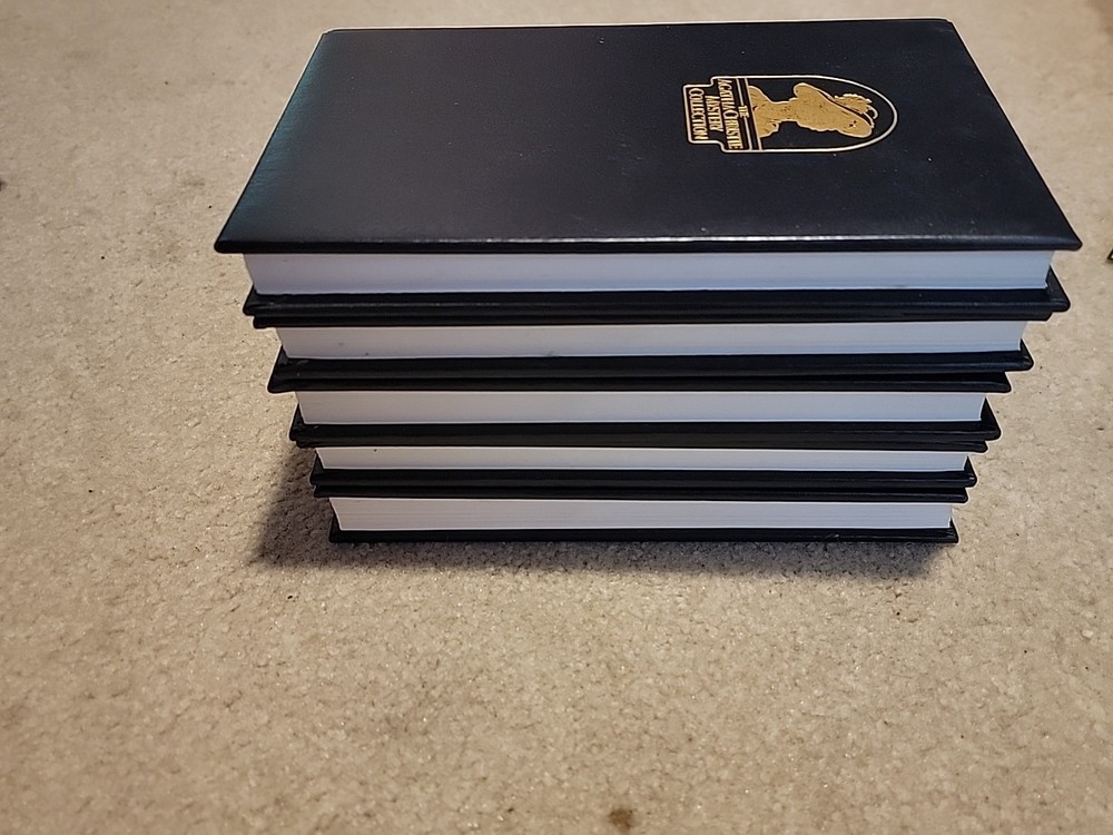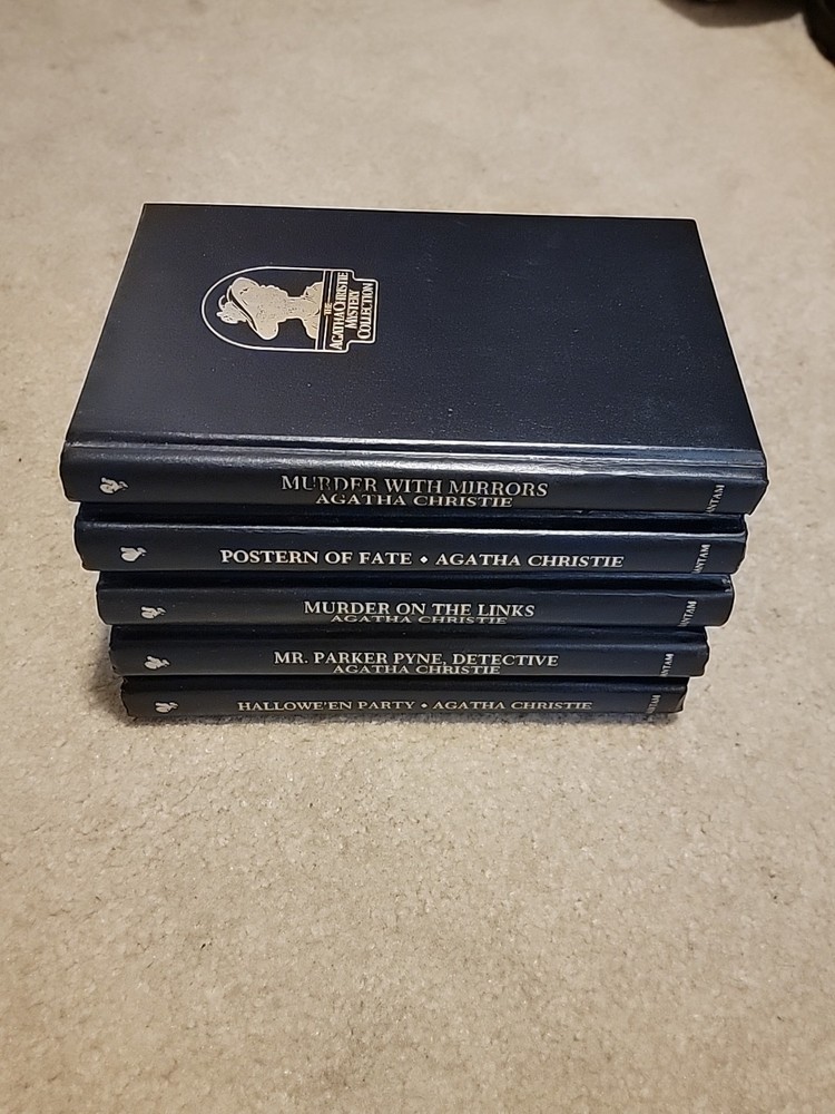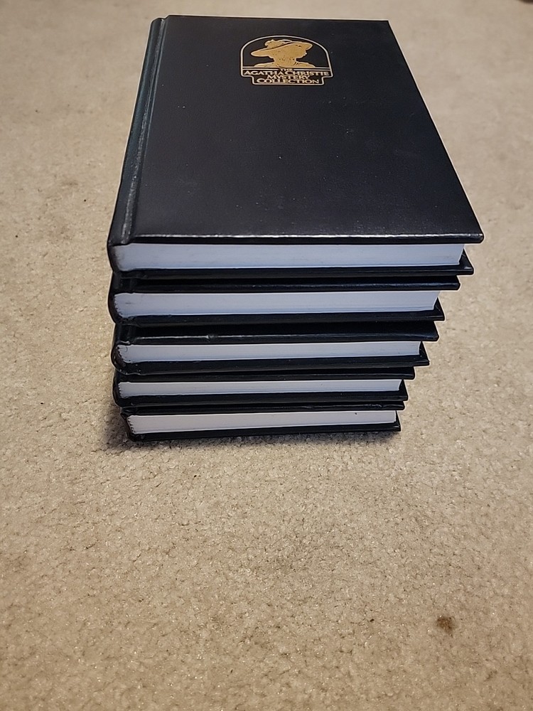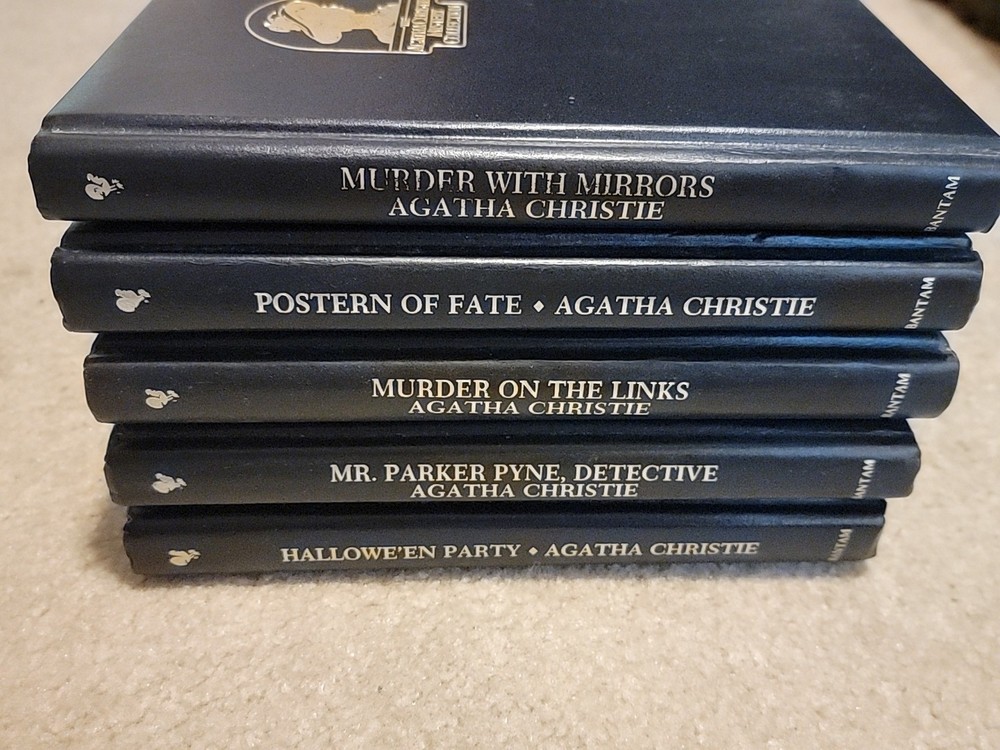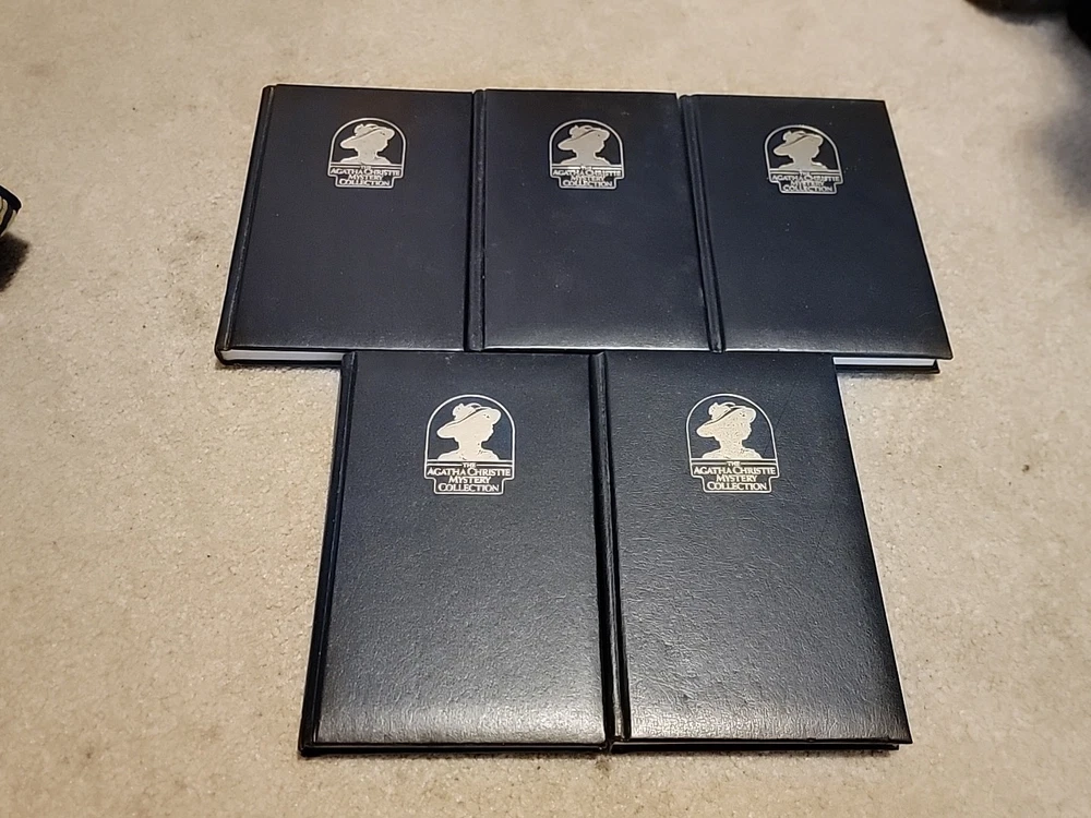 The product is a lot of five leatherette hardcover novels from The Agatha Christie Mystery Collection, published by Bantam Books. These vintage special collector's editions are bound in faux leather, featuring classic mysteries by the renowned author Agatha Christie. With a captivating narrative type of fiction and a genre of mystery, these novels are a must-have for any fan of the genre and collector of Agatha Christie's works. The compact size of 8.75 inches in length, height, and 5.75 inches in width makes them perfect for reading on the go or displaying on a bookshelf.