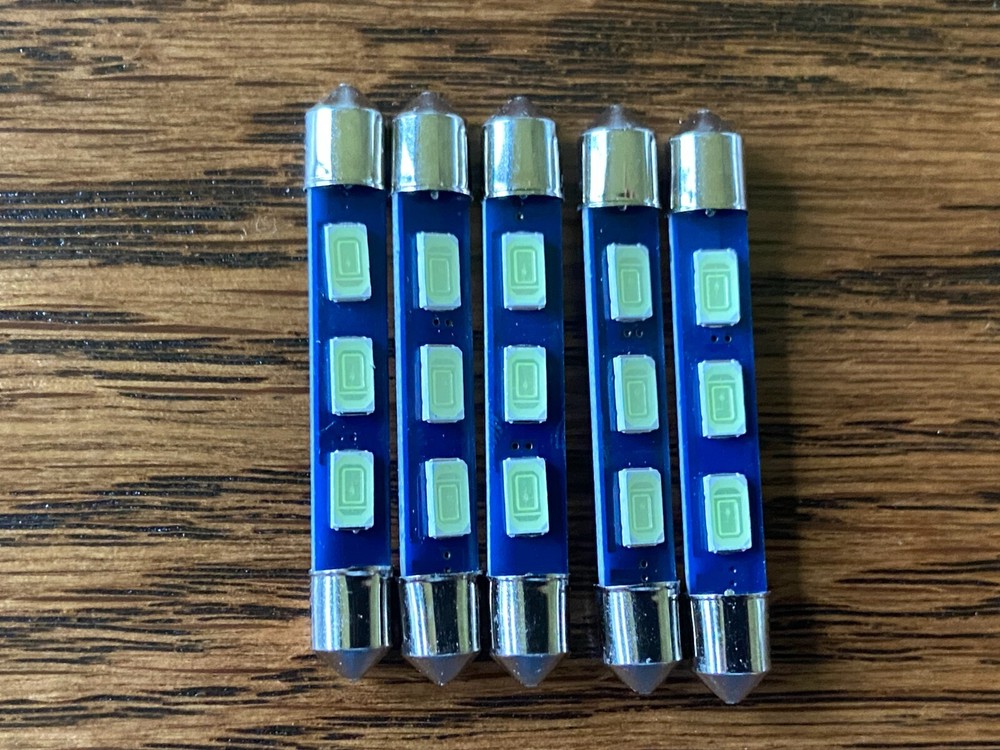 Up for sale here is this set of 5 new 6.3v 43mm snap-in cool blue LED festoon lamps. These are perfect for replacing any of the 43mm festoon lamps found in vintage gear, usually in the Fisher tube receivers like the 400, 500B, 500C, 600, 800B, and 800C. These are 43mm long and will fit nicely in the old holders. LEDs run cooler, last almost forever, and draw much less current than the old incandescent bulbs. These are brand new bulbs and are guaranteed to work great for you. Specs: Voltage: 6.3v AC/DC Current Draw: 70mA Color: Cool Blue Length: 43mm Diameter: 6mm Polarity: Non-polar Please see my pictures for details. US shipping and handling is $5, and international is $18, no matter what quantity you buy. All my small parts are set up for combined shipping, so just use the "add to cart" feature and then check out all at once, and it will combine shipping. If you have any questions, please ask. Looking for more parts? I have power switches , feet , pushbuttons , top case screws , bottom screws , faceplate screws , white LED fuse lamps , blue LED fuse lamps , 6.3v bi-pin bulbs , 8v bi-pin bulbs , 12v bi-pin bulbs , wired 8v 60ma bulbs , new power cords , new main capacitors for the Marantz 1060/2230 , wired Pioneer speaker plug replacements , new 630v yellow film capacitors at 30 different values , a large variety of transistors for vintage stereo repair, new Wima film capacitors for stereo repair , new 250v yellow film crossover capacitors, and more. Just use "add to cart" on everything you want and then check out for combined shipping.