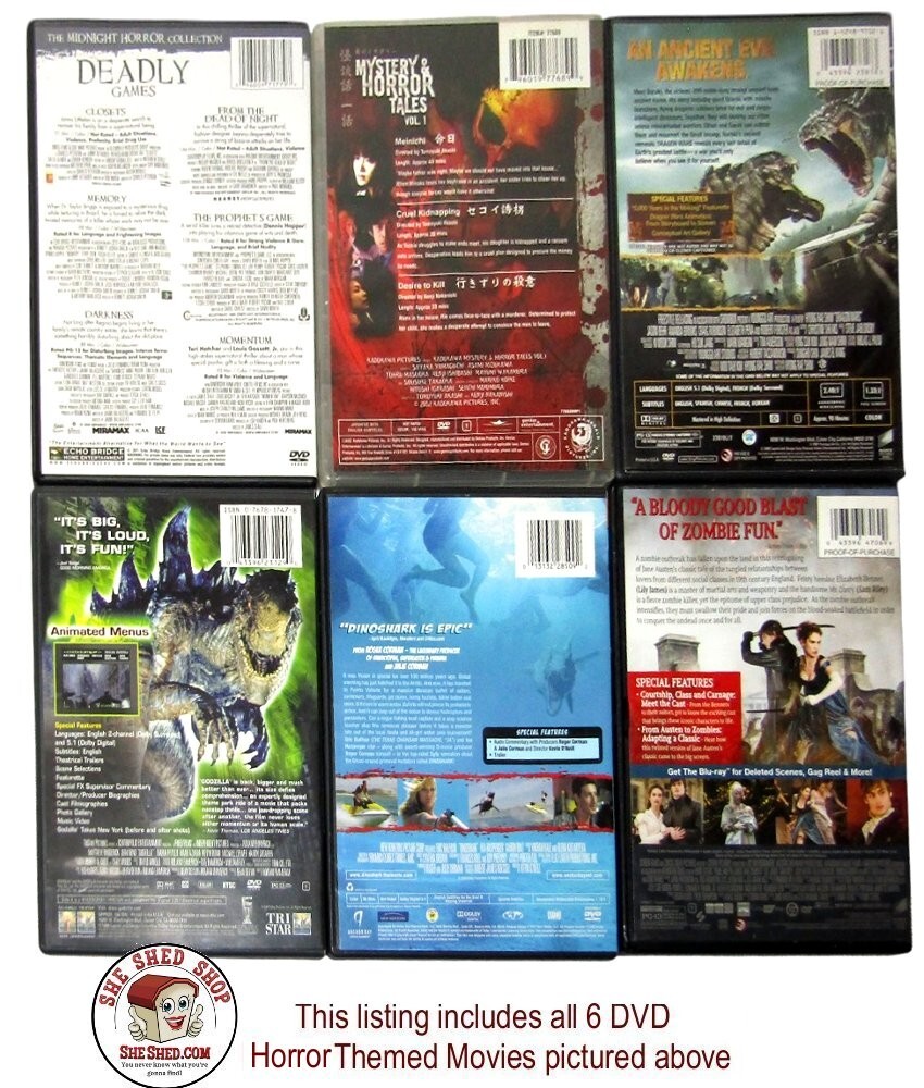 If you purchase more than one item from our She Shed Shop on the same day, (if possible) we will combine shipping and refund any overpaid shipping fees. Bundle of 6 DVD Horror - Thriller Themed Movies - 6 DVDs included - 4456-CBS Deadly Games Collection - Closets, Memory, Darkness, Dead Night, Prophet's Game, Momentum - 096009717797 - 2011 - 10 hours 20 minutes - Widescreen - Echo Bridge Mystery & Horror Tales Volume 1 - 796019776899 - 2002 - 105 minutes - Full Screen - Genius Dinoshark - 013132285092 - 2011 - 90 minutes - Widescreen - Anchor Bay DinoWars - 043396238183 - 2007 - 90 minutes - Widescreen - Sony Godzilla - 043396231290 - 1998 - 139 minutes - Widescreen - Tristar Pride, Prejudice & Zombies - 043396470699 - 2016 - 107 minutes - WIdescreen - Sony Pictures These 6 DVD Disc's are pre-owned, previewed from a private collection and in very good used condition. This item will be shipped via US Post Office with tracking and insurance.