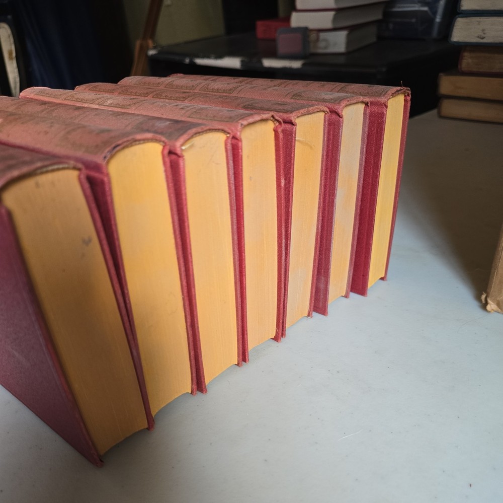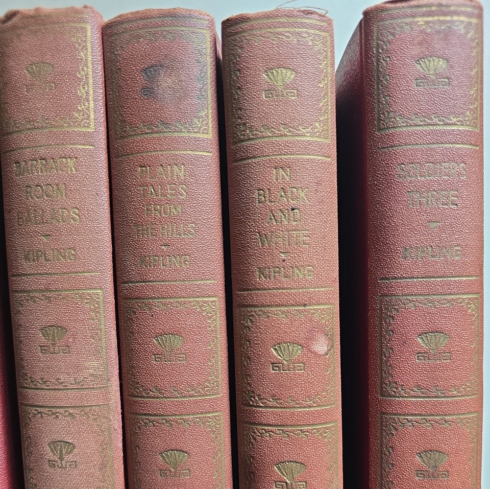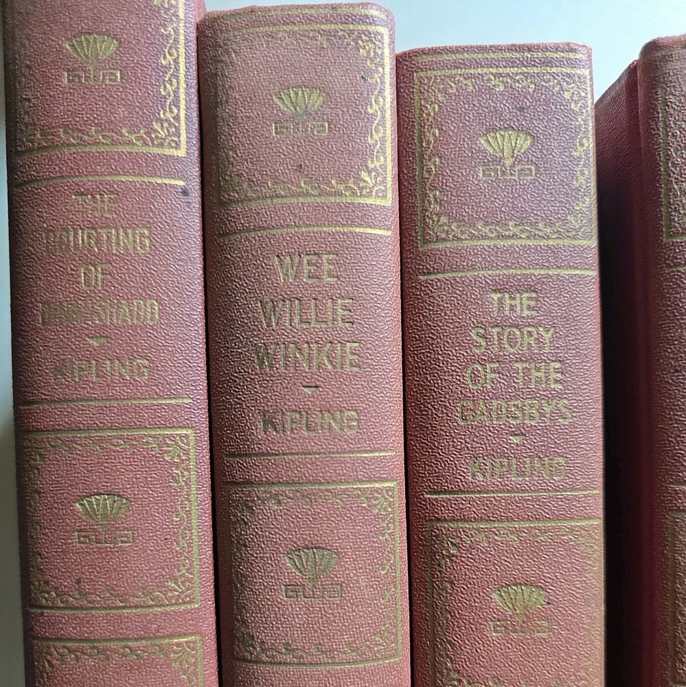 This product is a collection of 7 vintage Rudyard Kipling books published by Standard Book Co. in 1930. "The Courting of Dinah Shadd", "Wee Willie Winkle", The Story of the Gadsbys", "Barrack Room Ballads", "Plain Tales from the Hills", "In Black and White", and "Soldiers Three". The books are bound in leather and printed in English. They were published in London and New York by the Standard Book Company. The literature and fiction works by Rudyard Kipling are a valuable addition to any collector's library, especially for fans of classic British authors like Kipling.