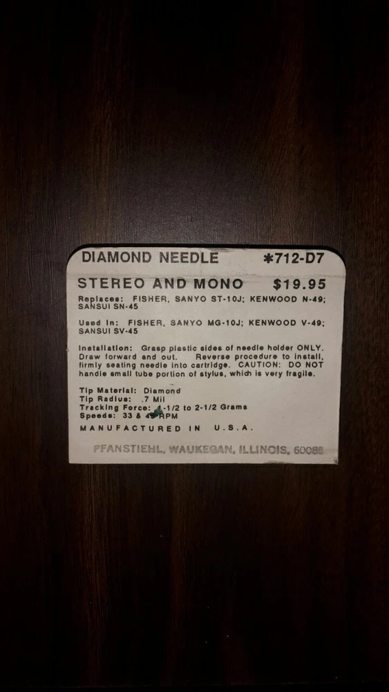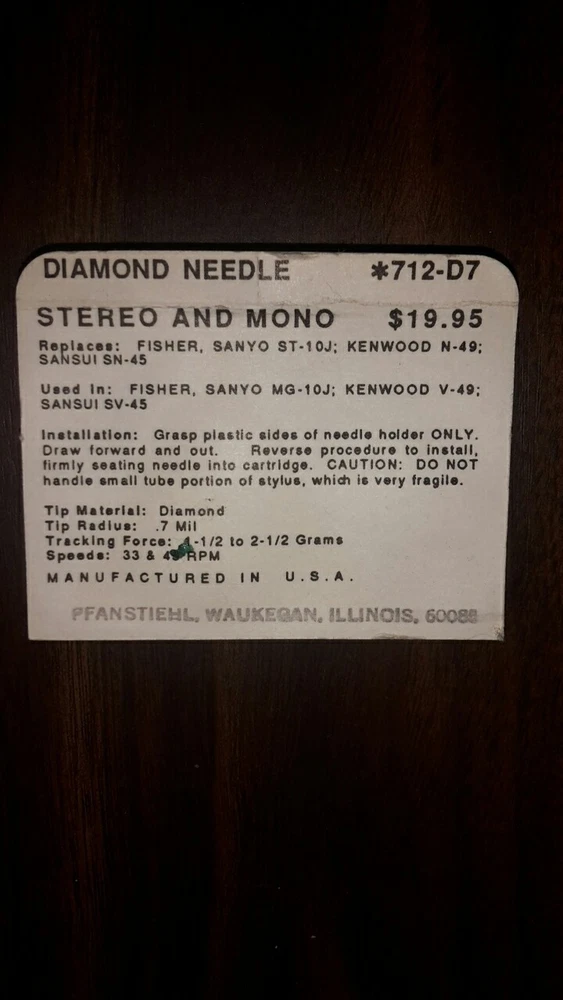 INNER SOUND ELECTRONIC SERVICE 712-D7 Diamond Pfanstiehl Turntable Needle 33 & 45 RPM...