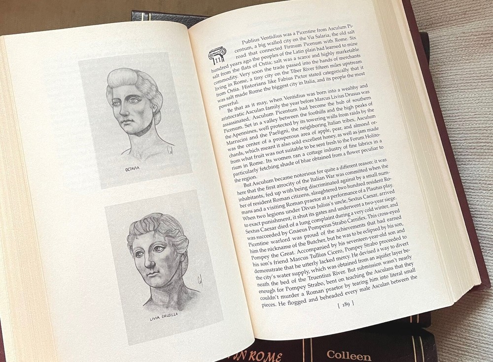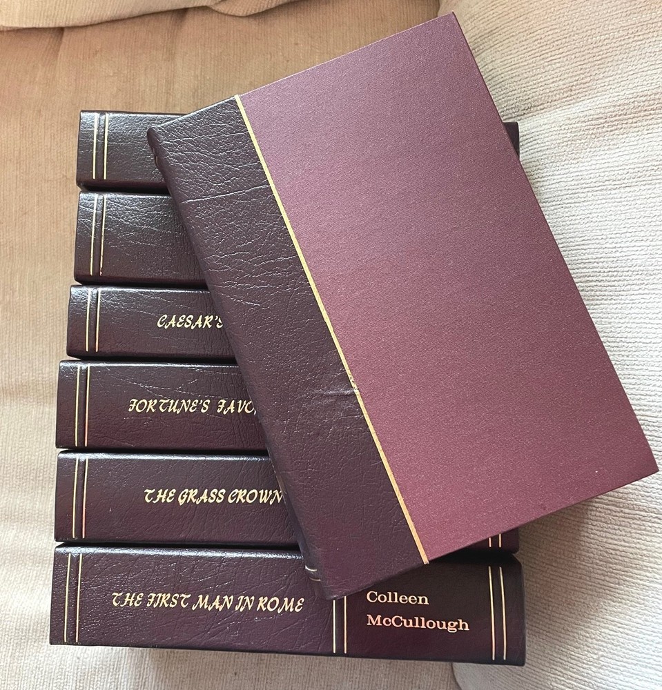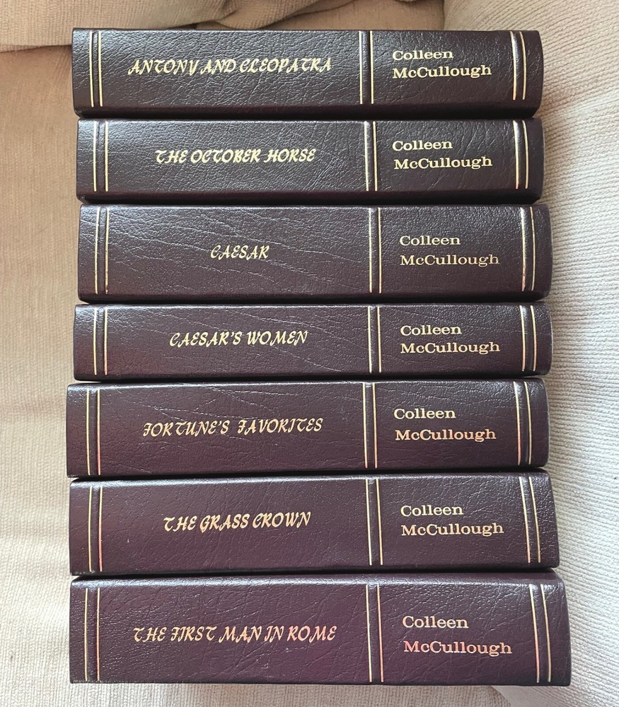 THE MASTERS OF ROME by Colleen McCullough Hilarious and poignant, McCullough's majestic series of novels about ancient Rome stands as her masterpiece -- much more so than The Thorn Birds . With extraordinary narrative power, New York Times bestselling author Colleen McCullough sweeps the reader into a whirlpool of pageantry and passion, bringing to vivid life the most glorious epoch in human history. When the world cowered before the legions of Rome, two extraordinary men dreamed of personal glory: the military genius and wealthy rural "upstart" Marius, and Sulla, penniless and debauched but of aristocratic birth. Men of exceptional vision, courage, cunning, and ruthless ambition, separately they faced the insurmountable opposition of powerful, vindictive foes. Yet allied they could answer the treachery of rivals, lovers, enemy generals, and senatorial vipers with intricate and merciless machinations of their own—to achieve in the end a bloody and splendid foretold destiny . . . and win the most coveted honor the Republic could bestow. TITLES INCLUDE: The First Man in Rome The Grass Crown Fortune's Favorites Caesar's Women Caesar The October Horse Antony and Cleopatra Masters of Rome is a series of historical novels by Australian author Colleen McCullough , set in ancient Rome during the last days of the old Roman Republic ; it primarily chronicles the lives and careers of Gaius Marius , Lucius Cornelius Sulla , Pompey the Great , Gaius Julius Caesar , and the early career of Caesar Augustus . It spans from January 1, 110 BC through to January 16, 27 BC. Other major historical figures who appear and play prominent parts in the series include Mithridates VI of Pontus , Marcus Aemilius Scaurus , Publius Rutilius Rufus , Quintus Sertorius , Marcus Livius Drusus , Jugurtha of Numidia , Spartacus , Marcus Licinius Crassus , Marcus Tullius Cicero , Marcus Calpurnius Bibulus , Marcus Porcius Cato , Publius Clodius , Titus Annius Milo , Vercingetorix , Marcus Junius Brutus , Gaius Cassius Longinus , Mark Antony , Cleopatra VII of Egypt , Caesarion and Marcus Vipsanius Agrippa . Each book in the series features a detailed glossary, hand-drawn illustrations of the major characters, and notes by McCullough detailing her reasoning for portraying certain events in certain ways. As Rome became more powerful within the Mediterranean world, the old ways of doing things – through the deliberation of various interests, mainly aristocratic and mercantile – became impossibly cumbersome. It became more and more difficult to govern an empire with institutions originally designed to administer a city-state. Certain powerful leaders (especially Marius, Sulla, and Caesar) tried to create a state in which they had autocratic power but also preserved the externals of the old ways. They were opposed by the conservatives (called the optimates by classical historians, though they themselves preferred the title boni or "good men"). The result was the birth of an imperial monarchy , and a radically different organization of power McCullough portrays Caesar as an autocrat, great military man, populist , and controversial reformer. She does not portray the death of the Republic as positive but rather portrays Caesar as a great man and his crossing of the Rubicon as inevitable, given that the alternative was exile, disgrace, and the violation of his dignitas , which was an unthinkable anathema to a Roman Patrician of consular rank. According to McCullough's portrayal, Caesar's crossing of the Rubicon was his last option, his last roll of the dice, as best illustrated by the timeless quote from Caesar: "The die is cast." McCullough points out that the translation of the alternative Greek version of his words is "Let the dice fly high," which characterizes not fatalism (as with the former) but rather risk-taking. THESE BOOKS HAVE ALL BEEN PROFESSIONALLY REBOUND IN QUARTER LEATHER. THEY LOOK GREAT ON THE SHELF NEXT TO EASTON PRESS AND FRANKLIN LIBRARY EDITIONS. THIS IS A ONE-OF-A-KIND set. The books are solid. Questions please email me. USPS media mail shipping with delivery confirmation. US buyers only.
