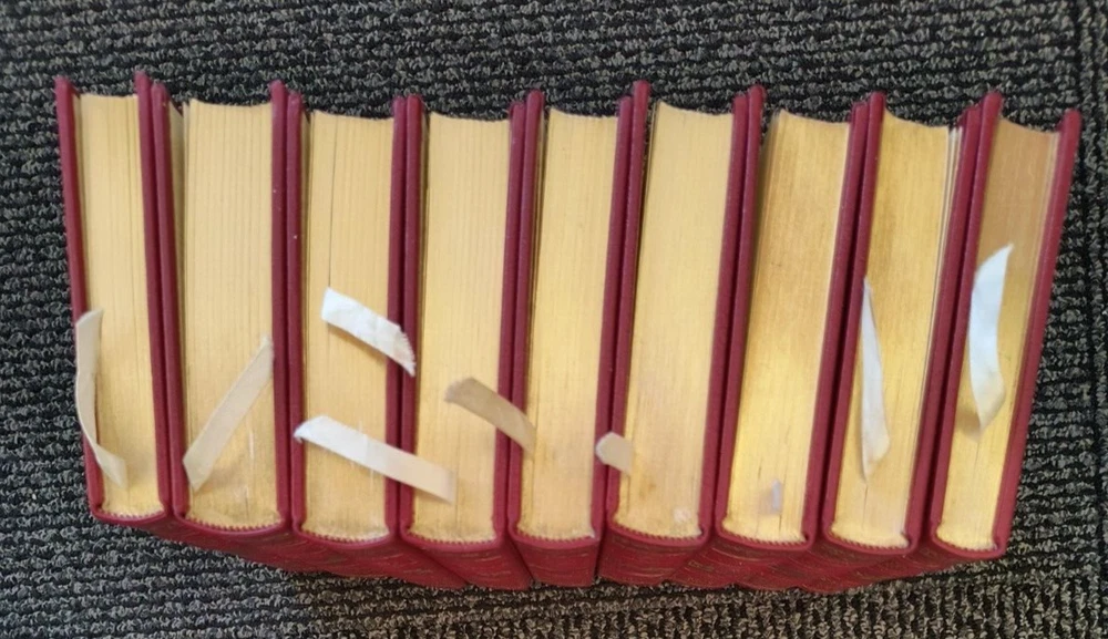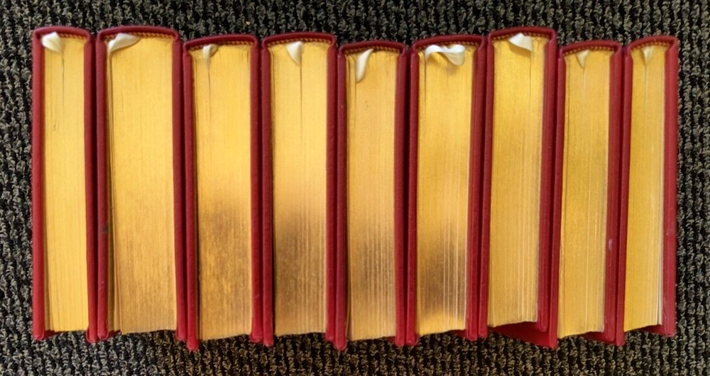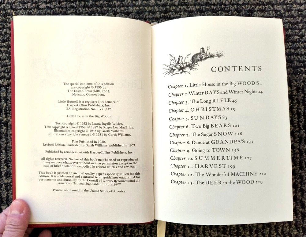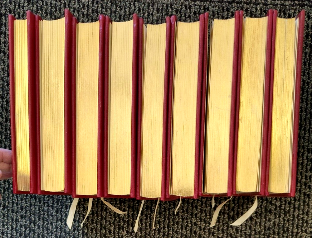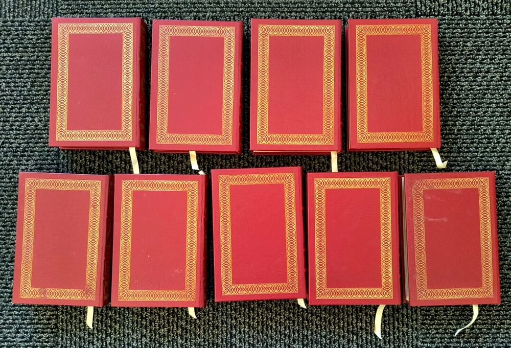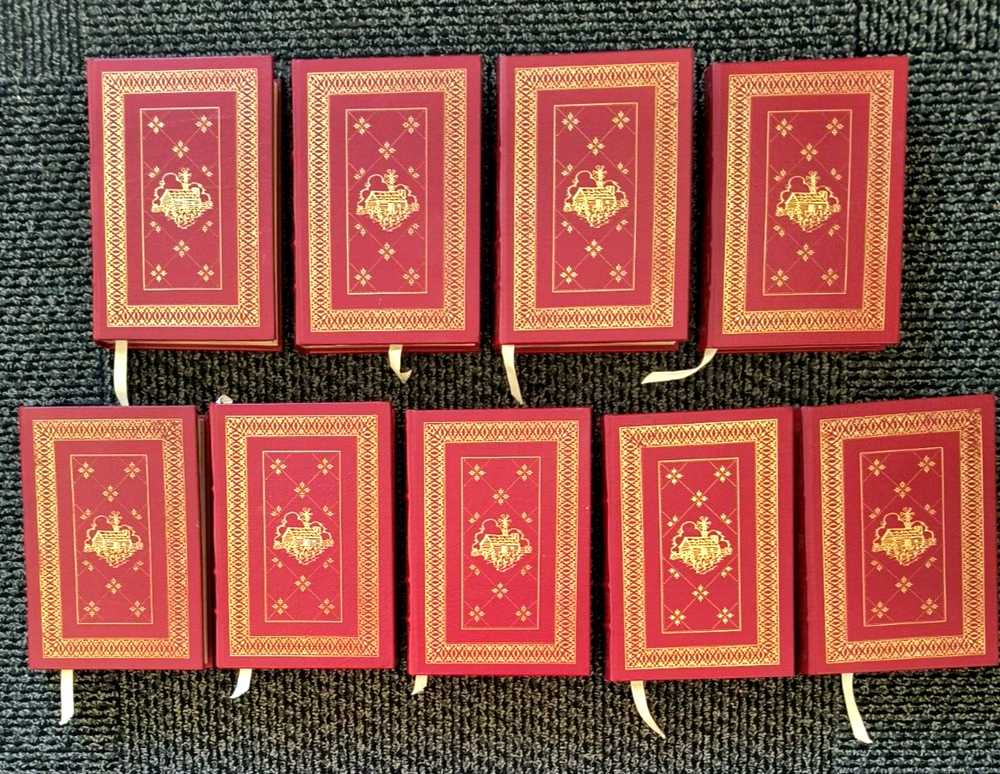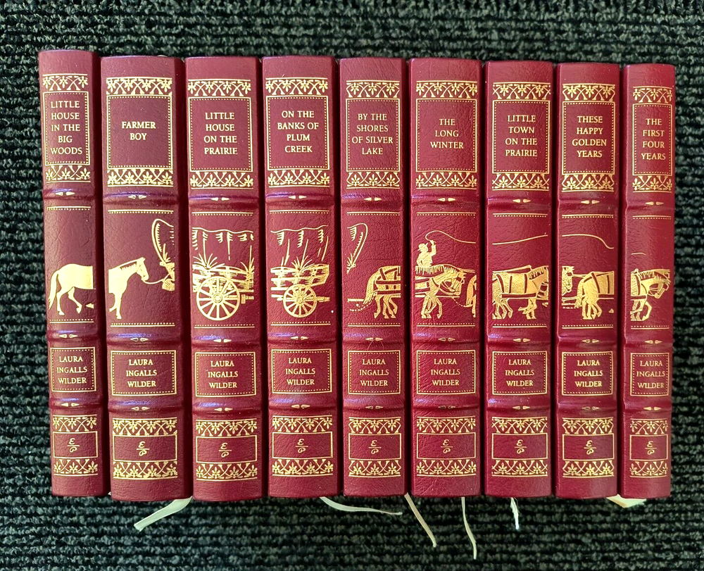 Here is a complete set of nine very good to good condition leather/hardcover books, each with attached silky bookmark - each book is approx. 5 3/4 x 8 1/4 inches THE COMPLETE LITTLE HOUSE SERIES BY LAURA INGALLS WILDER ILLUSTRATED BY GARTH WILLIAMS COLLECTOR'S EDITION BOUND IN GENUINE LEATHER THE EASTON PRESS 1995 (PLEASE SEE PHOTO OF LHITBW COPYRIGHT PAGE - ALL THE OTHER COPYRIGHT PAGES ARE SIMILAR) ALL BOOKS HAVE A GLOSSY COLOR ILLUSTRATED FRONTISPIECE, SEVERAL INTERNAL B/W ILLUSTRATIONS "Bound in Genuine Leather Easton Press sells the world's greatest books, bound in genuine leather and accented with 22kt gold, with rich moire fabric endpapers, gilded edges, spine is stamped in 22kt gold. Attached to spine is a satin-ribbon page marker." 1 Little House in the Big Woods - hardly any wear 2 Farmer Boy - wrinkled bookmark, light scratches to bottom gilt page edges 3 Little House on the Prairie - slight scratches to bottom gilt page edges, faint scratches to top gilt page edges 4 On the Banks of Plum Creek - hardly any wear 5 By the Shores of Silver Lake - slight staining along top area inside front cover/front endpaper (see photo), stain shows up on top corner area of next page (see photo), first several pages are very slightly wavy along top - no odor, possibly water, but again, it's slight. Back cover has some small areas of soiling or rubbing along the gilt designs in two areas along bottom, and to a lesser degrees along sides. Front cover also has a few areas of soiling, but less than back cover. 6 The Long Winter - two small light stains along bottom edge inside front cover/front endpaper (see last photo), faint scuffing along bottom gilt page edges, a few small spots of soiling on back cover 7 Little Town on the Prairie - light scratches along bottom gilt page edges 8 These Happy Golden Years - slight scuffing along bottom gilt page edges, small spot along top edge of back cover 9 The First Four Years - slight scuffing along bottom page edges, some soiling to back cover Most books are in very good condition with hardly any wear. Some appear to have never been read. A few have slight wear. All are firmly bound with covers/pages looking good, no markings. All bookmarks are attached with little wear. Please contact me if you would like more pictures or more info on condition of a particular book. Beautiful collector editions of a beloved classic girls series! Track Page Views With Auctiva's Counter