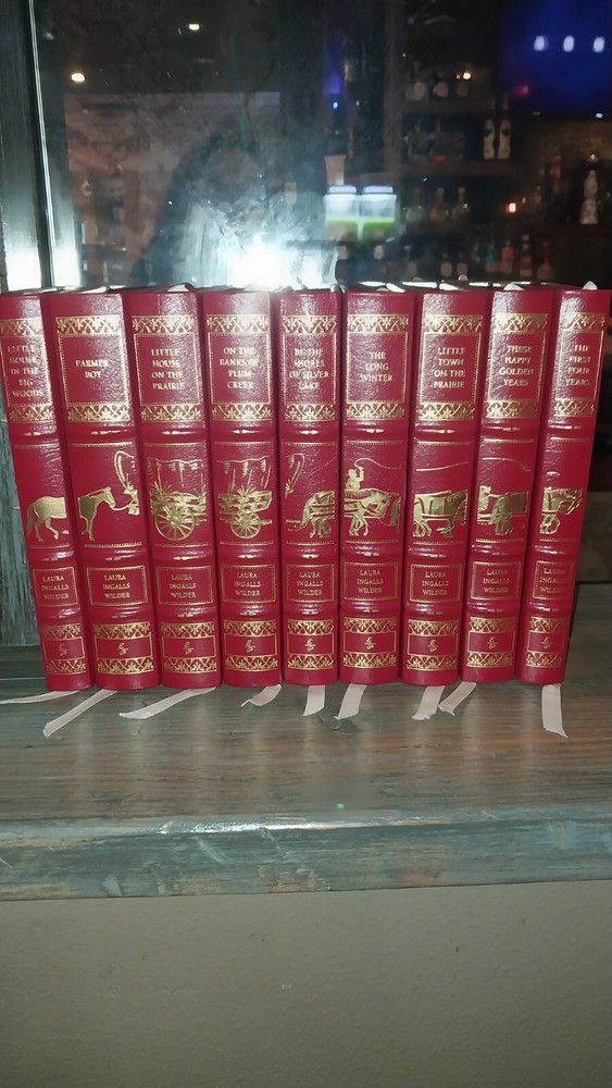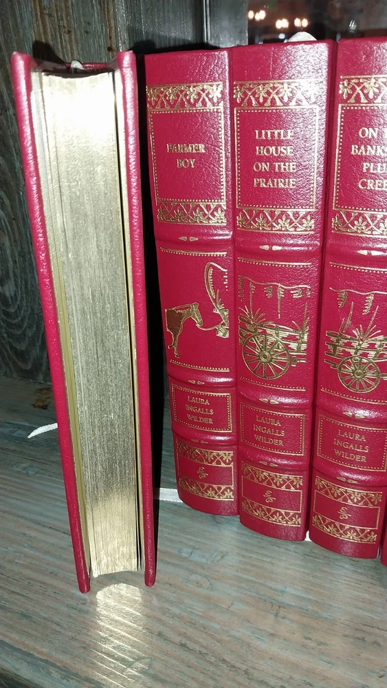 This is a collector's set of the complete collection of Laura Ingalls Wilder's classic series, Little House on the Prairie. This beautiful book set is bound in genuine leather and features gold leaf pages, and each book has a silk ribbon bookmark. The books are all beautifully illustrated by Garth Williams. Bound in premium leathers, distinctive cover design, hubbed spine accented in 22-karat gold End sheets of rich moiré fabric, permanent satin ribbon page marker Thread sewn pages for strength and durability, gilded page edges for beauty and protection Handsome readable typefaces, beautiful illustrations, archival-quality acid-neutral paper. TITLE LITTLE HOUSE ON THE PRAIRIE collection in 9 vols AUTHOR Laura Ingalls Wilder MORE DETAILSLITTLE HOUSE stamped on the front WAGON, HORSES & DAD stamped on the spine illustrated by Garth Williams with frontispiece in color, and many inside in black & white 1. THE FIRST FOUR YEARS 2. THESE HAPPY GOLDEN YEARS 3. LITTLE TOWN ON THE PRAIRIE 4. THE LONG WINTER 5. BY THE SHORES OF SILVER LAKE 6. ON THE BANKS OF PLUM CREEK 7. LITTLE HOUSE ON THE PRAIRIE 8. FARMER BOY 9. LITTLE HOUSE IN THE BIG WOODS DESCRIPTION Very good condition, tight hardcover binding SHIPPING Books will be packed safely, and shipped via USPS Media Mail with tracking number.