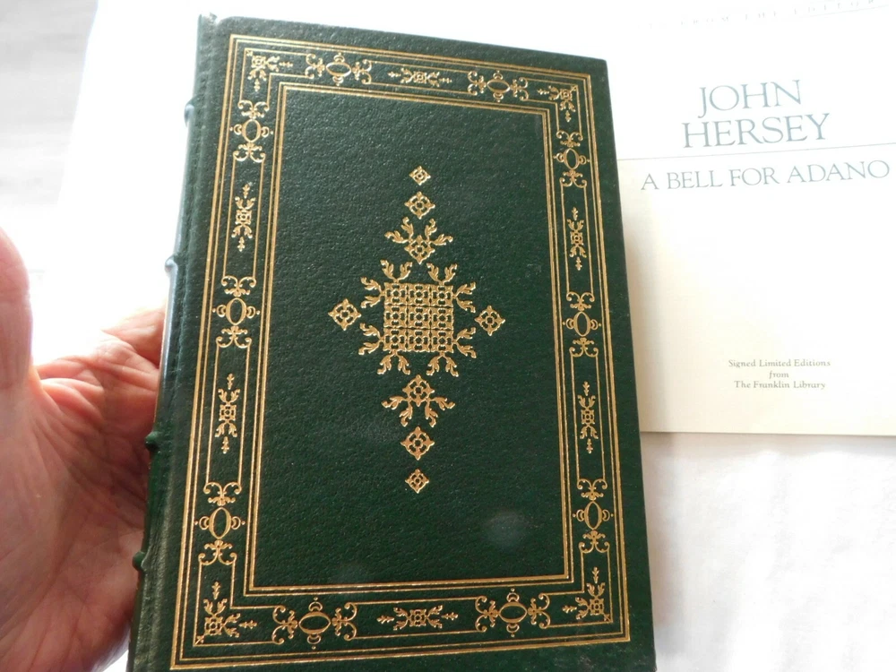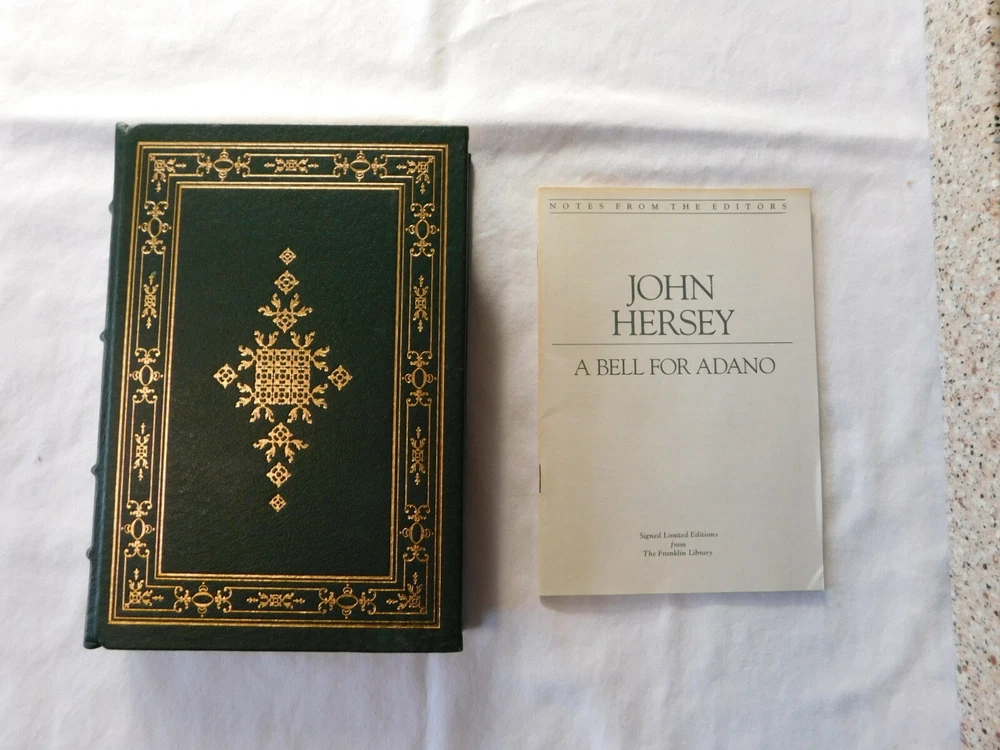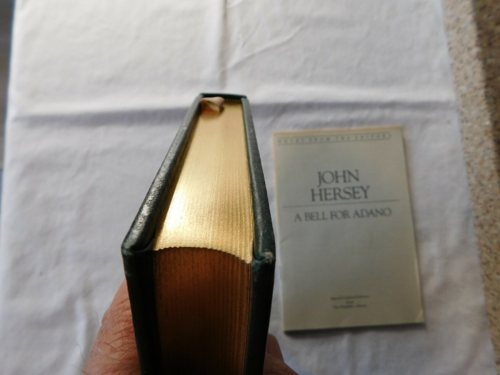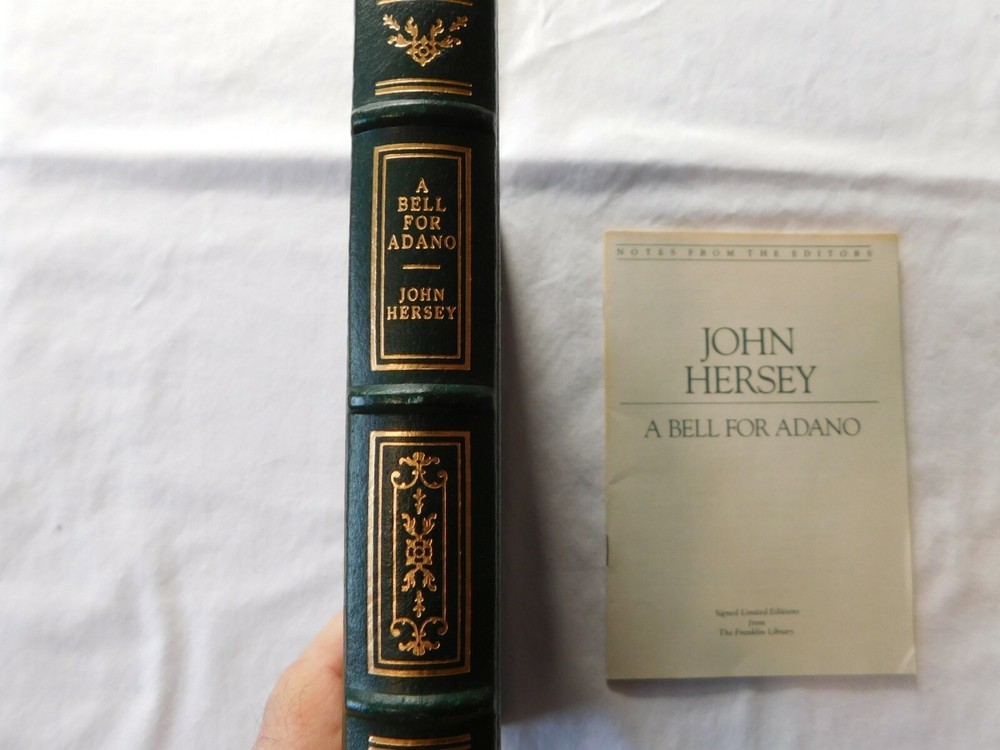 A Bell for Adano by: John Hersey- SIGNED by Author- Franklin Library- Leather. UNREAD FRANKLIN LIBRARY 100 Series ... Leather Hardback with Gold Edging and Attached Ribbon Book Mark THIS BOOK IS SIGNED BY THE AUTHOR !! Protective Tissue Guard for Author’s Signature Page INCLUDES: “Notes From The Editors” booklet CONDITION: Very Good- Appears Unread. Note: I only partially opened the book to take pictures very carefully- This book was purchased, put on a bookshelf for display with others and never read. Shipping is via USPS Media Mail in a Book Box, Wrapped, Sealed and Taped A RARE BEAUTIFUL BOOK WITH EXQUISITE ILLUSTRATIONS - PERFECT FOR THAT GIFT THAT WILL LAST FOR GENERATIONS TO ENJOY!