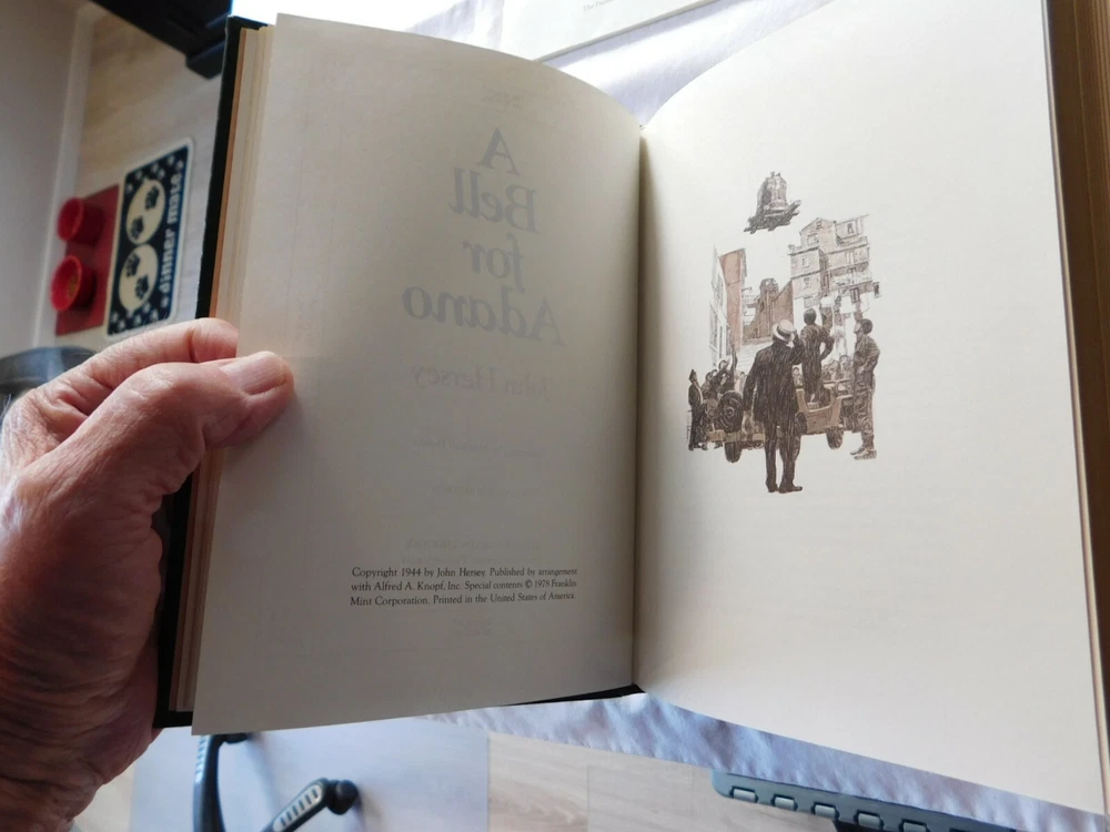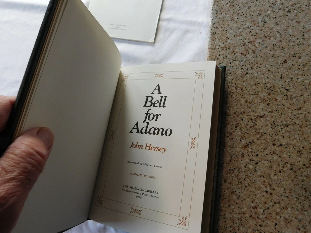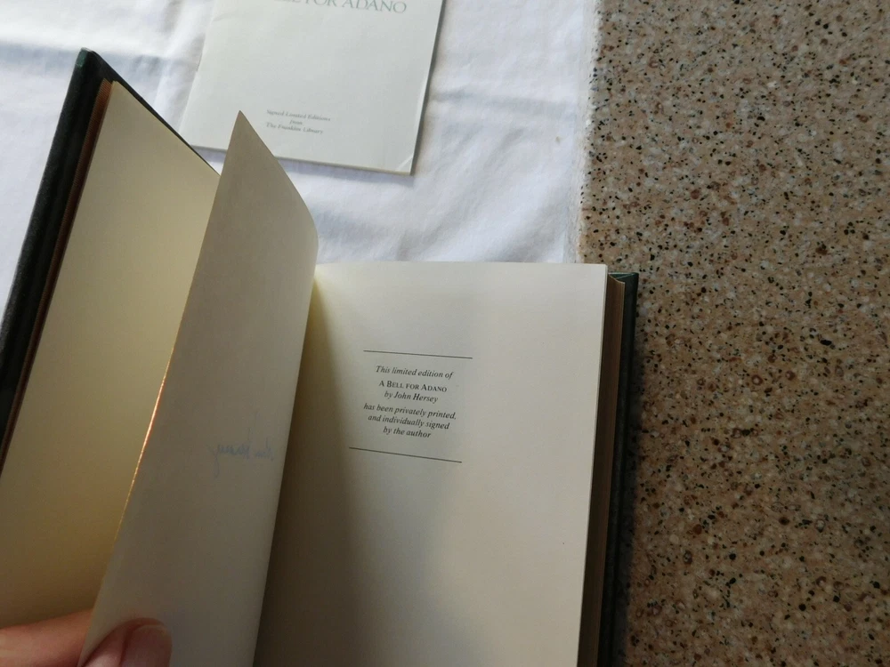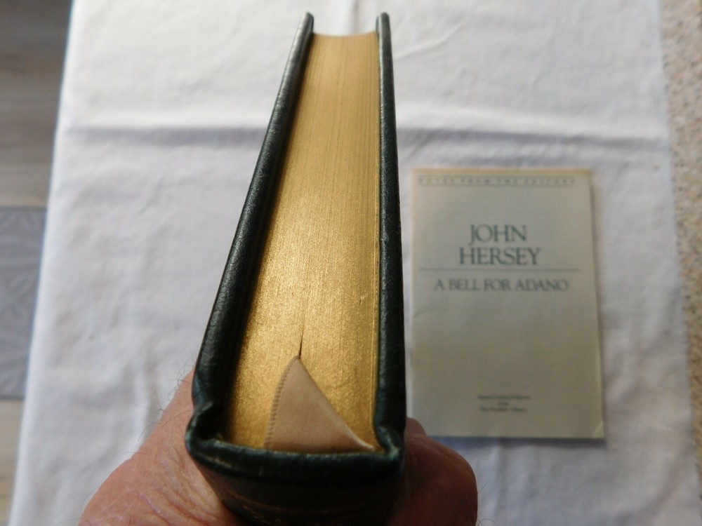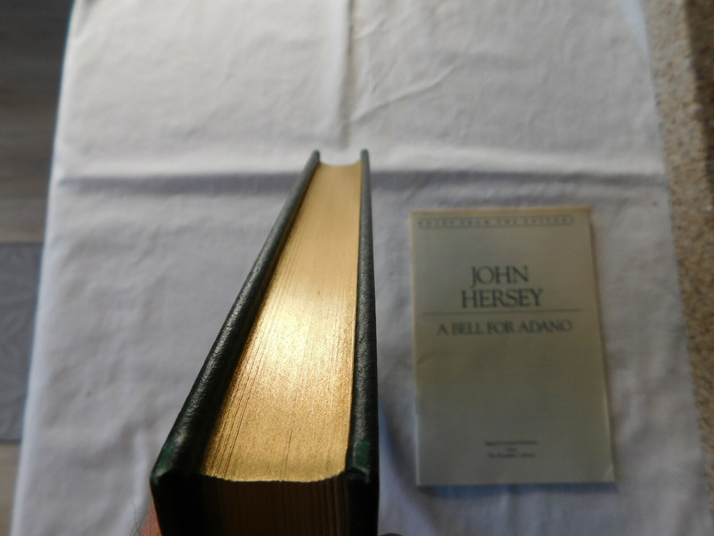 A Bell for Adano by: John Hersey- SIGNED by Author- Franklin Library- Leather. UNREAD FRANKLIN LIBRARY 100 Series ... Leather Hardback with Gold Edging and Attached Ribbon Book Mark THIS BOOK IS SIGNED BY THE AUTHOR !! Protective Tissue Guard for Author’s Signature Page INCLUDES: “Notes From The Editors” booklet CONDITION: Very Good- Appears Unread. Note: I only partially opened the book to take pictures very carefully- This book was purchased, put on a bookshelf for display with others and never read. Shipping is via USPS Media Mail in a Book Box, Wrapped, Sealed and Taped A RARE BEAUTIFUL BOOK WITH EXQUISITE ILLUSTRATIONS - PERFECT FOR THAT GIFT THAT WILL LAST FOR GENERATIONS TO ENJOY!