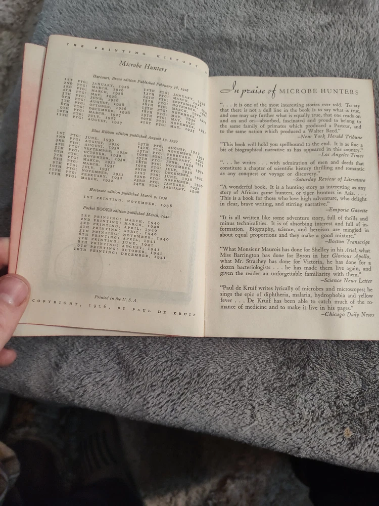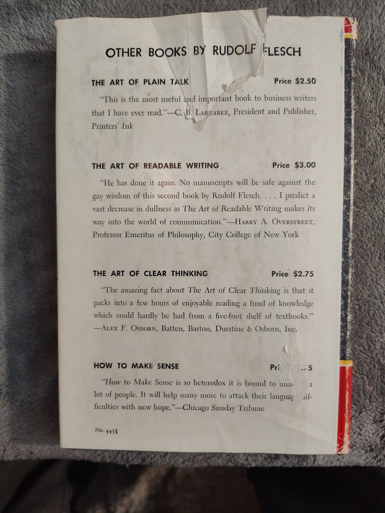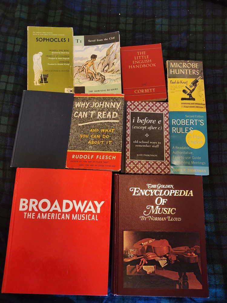 A Bundle of Educational Resource Materials, Some Vintage, Hardcover & Softcover Educator’s Bundle, Text Descriptions and Valuation These books have different shapes and sizes, and come from different authors. See individual text descriptions for more details. Since there are only 24 pictures allowed, these books only have a few included in the lot. Feel free to send a message with any questions. Broadway: The American Musical by Maslon, Laurence, Kantor, Michael, 1st ed./prt This is a heavy, gorgeous, stopsign-red textbook about the Broadway musical, and its central status in American culture. The book tracks how the American musical develops, and provides much glamorous exposition into varying theatrical movements through the ages. It is a textbook, often sold and used on college campuses in varying theater departments; especially those with a musical theater focus. Cornell College out of Mount Vernon, Iowa uses this book. This edition does not have a dust jacket. Otherwise it is in pristine condition, and the original owner took excellent care of it. Single Price: $199.99 Building Library Collections, Fourth Edition, Cartter, Bonk, & Magrill This is a first edition/printing of the fourth edition of "Building Library Collections" by Carter, Bonk, and Magrill. This book has no dust jacket, there is exceptionally mild wear around the end-caps of the spine, otherwise the book appears essentially unblemished. 415 Numbered Pages. Single Price: $18.55 I Before E (Except after C) : Old-School Ways to Remember Stuff, Judy Parkinson The book "i before e (except after c), old-school ways to remember stuff" by Judy Parkinson, provides some insight into simple life hacks. This book features illustrations, and is in like new condition. It has 167 pages and is a first edition, first printing copy. Single Price: $15.55 Microbe Hunters, Paul de Kruif 1942 Softcover, Fair Condition, bacteriologists This is the first text edition, fifty-second printing of popular Microbe Hunters by Paul de Kruif. This is the complete and unabridged pocket book edition. Says the Los Angeles Times of this printing, "The book will hold you spellbound to the end." This particular copy has some spotty discoloration on the right side of the front cover, and some creasing. Pages have a cherry red coloration on edges, this coloration has faded on some pages. There is some evidence of moisture proximity, but the book has no smell beyond that of books generally. There are two or three doodles in pen on the inside pages of the book. A collectible, rare, and vintage work. 400 Numbered Pages. Single Price: $14.99 Robert's Rules in Plain English, Doris Zimmerman, 2nd Edition, 14th Printing This book is in essentially like new, perfect condition, and certainly useful to any involved in official meetings, as well as their associated procedure. 171 Numbered Pages. Single Price: $24.99 Saved From the Cliff, John Downing, the Downing Readers, Collectible Educational The Downing Reader collection is a vaunted selection of educational materials aimed at primary and junior high school students. This particular copy was published in 1965 and is quite rare; certainly a collector's item for those who acquire vintage educational resources. Single Price: $49.99 Sophocles I: Oedipus the King, Oedipus at Colonus, Antigone - Intr. David Grene Sophocles is the Greek playwright who provided the world his tragic visions through Oedipus, Oedipus at Colonus, and Antigone. This collection, as edited by David Greene, is a University of Chicago Press edition featuring all three plays, and is the first of two volumes. Only the first is presently available in this collection. This particular copy has some scuffing around the edges of the cover, most notably a small tear on the right side of the cover, and a notable scoff on the bottom left. On the bottom right of the cover is the remainder of a sticker. On the back cover, there are several discolorations and the odd circular impression, see pictures. The text has a handful of markings from previous students or academics. 205 Numbered Pages. Single Price: $14.99 The Golden Encyclopedia Of Musi, Norman Lloyd, 1968, 1st Ed., early Print., VGC This is the first edition, and an early printing (perhaps the first) of a classic educational resource about music. Norman Lloyd's The Golden Encyclopedia of Music is an in-depth examination of music exploring the extent of historical understanding during one of the most productive musical eras. This copy is in very good to fine condition. There is wear around the spine's endcaps, there is some wear around edges of the hardcover. This copy does not feature a dust jacket. All pages sit firmly in a strong binding, the book seems to have only one interior marking, a number four on a title page. 720 Numbered Pages. Single Price: $70.55 Little English Handbook, Corbett, 3rd Edition, 1st Printing, Vintage Collectible This is a copy of The Little English Handbook in the first printing of its third edition. A previous owner has printed their name on the top right of the title page. There are several spots on the "proofreader's marks" page, they don't occlude any text. Otherwise the book is in excellent condition with expected shelf wear. All pages sit firmly in the binding. 259 Numbered Pages. Single Price: $14.99 Why Johnny Can't Read and What You Can do About It, Rudolf Flesch 1st Ed/Unk prt This book was quite impactful upon its initial release. Comedian Jerry Clower had an entire routine focused on the "meme" of the time which involved this book's title. "Why Johnny Can't Read," Clower repeated, then explained why humorously. So this is an important book. This is a first edition, the print run is unknown. The information available in the book itself advertises 1955, and nothing later. Online research indicates this was the book's publication year. The book's appearance matches such an age, as does its printing and associated style. There is nothing to indicate which print run 