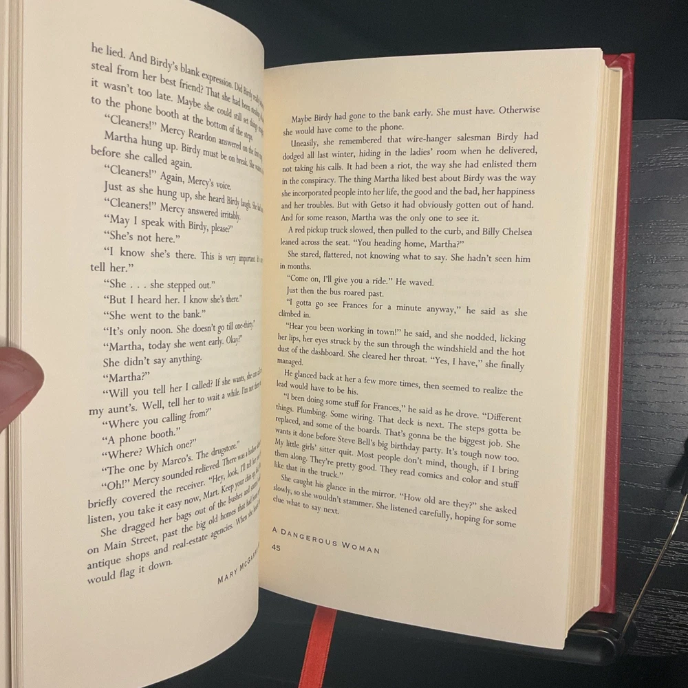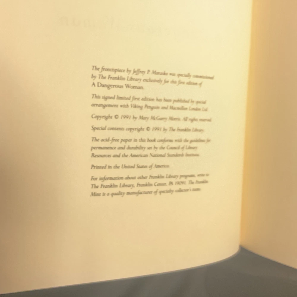 The product is a limited first edition of the book "A Dangerous Woman" by Mary McGarry Morris, published by Franklin Library in the United States in 1991. It is a luxury edition with special attributes such as being illustrated, signed by the author, and considered a classic in literature and fiction. The binding is leather, and it is an original printing in English. This collectible book is a valuable addition to any book lover's collection, particularly for those interested in North American literature and signed editions.