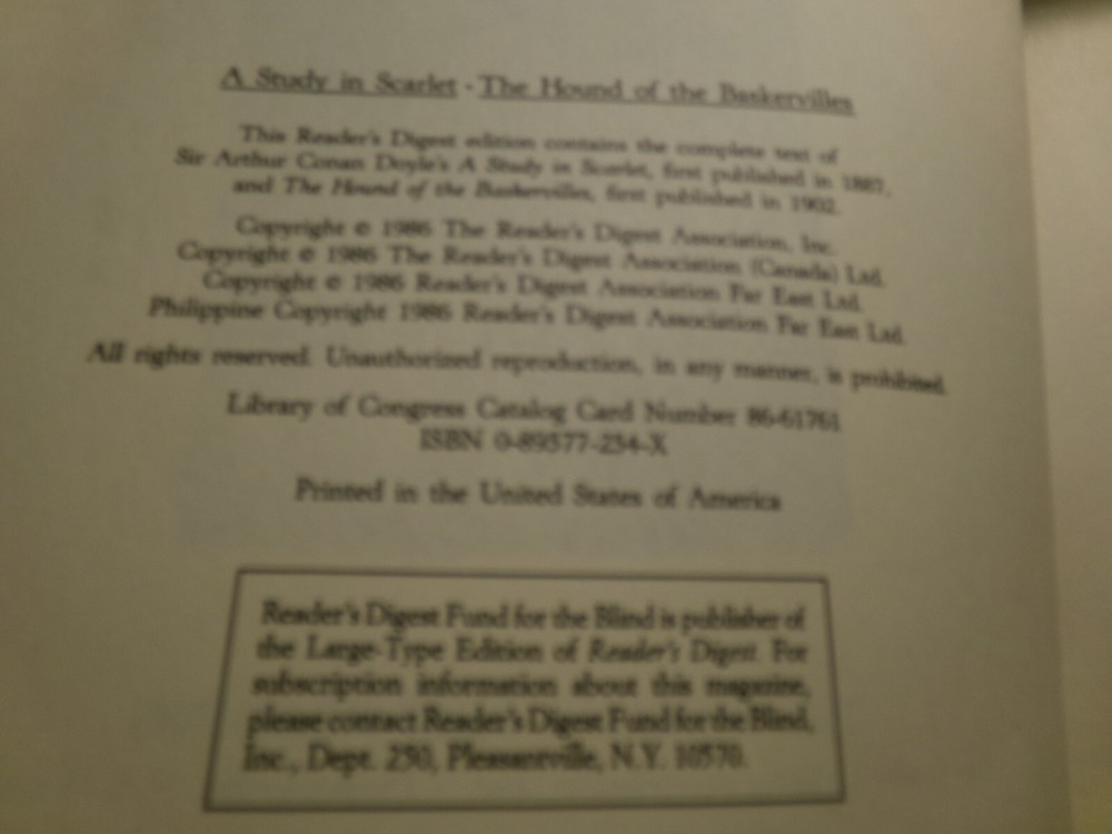 Do not be off put by this being a Reader's Digest publication. The two novellas are the complete, original works of the author. "A Study in Scarlet" tells of the meeting and beginning of the friendship between Sherlock Holmes and Doctor Watson and "The Hound of the Baskervilles" is a story of superstition and mystery.