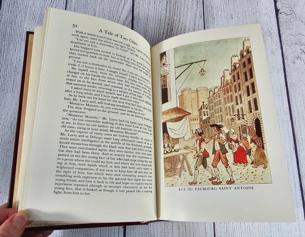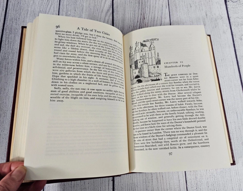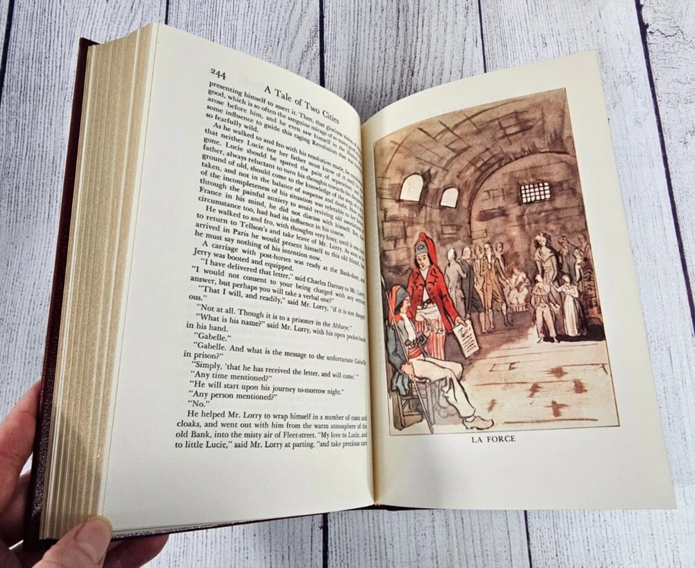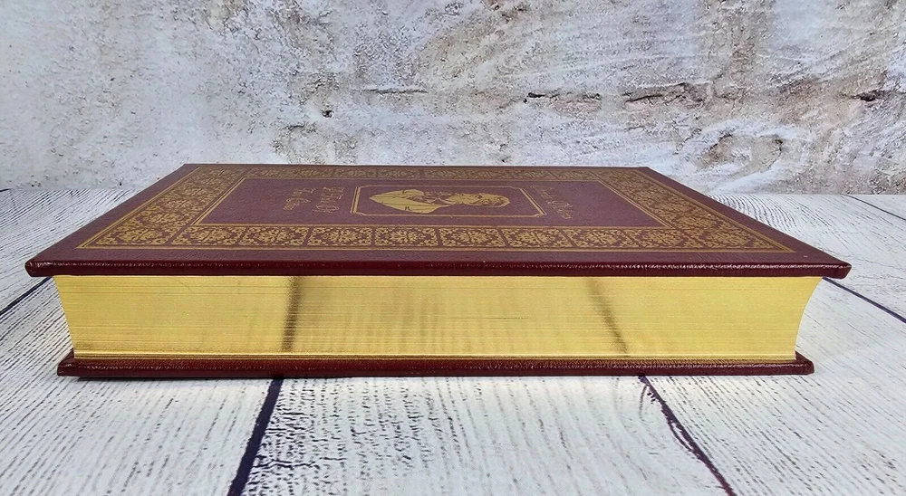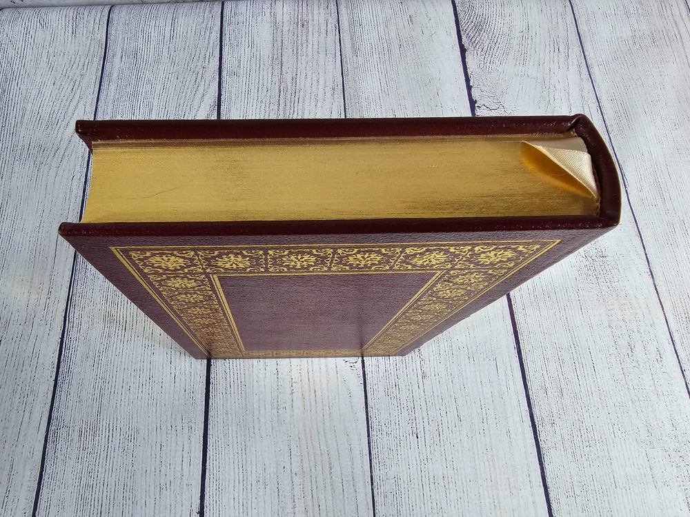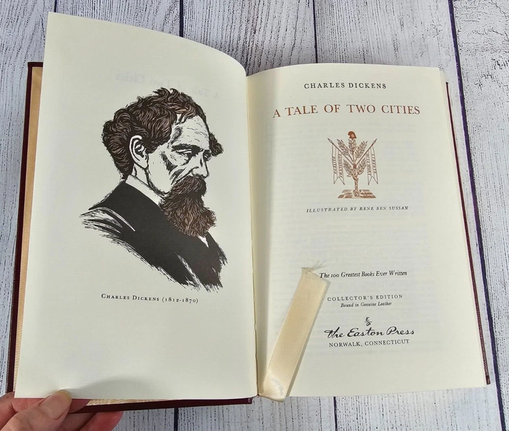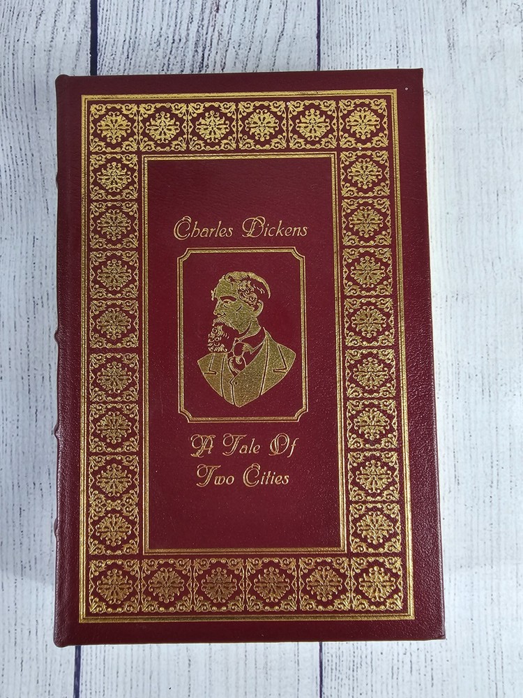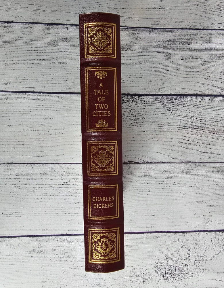 A Tale of Two Cities by Charles Dickens, Easton Press, Gold Embossed, Leather Hardcover, Collector's Edition 100 Greatest Books Ever Written Collection Book Size: 9.25" x 6.25", 371pp Features include: - Fully bound in genuine leather. - 22kt gold deeply inlaid on the “hubbed” spine. - Superbly printed on acid-neutral paper that lasts for generations. - Sewn pages – not just glued like ordinary books. - Satin-ribbon page marker. - Gilded page ends. - Superb craftsmanship and commitment to quality . Please let me know if you have any questions. Thank you for looking!