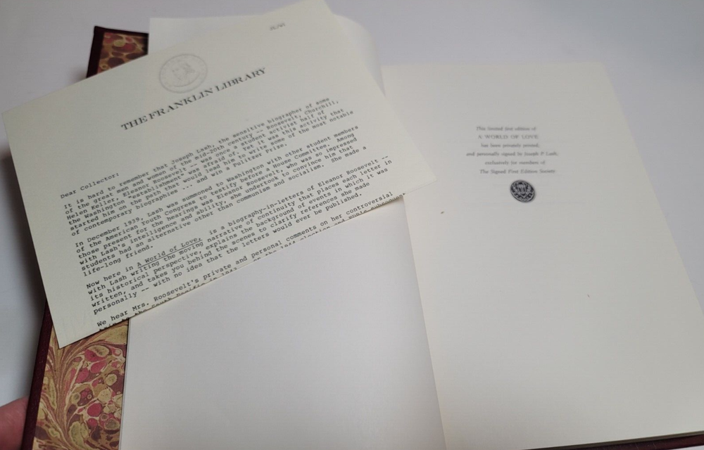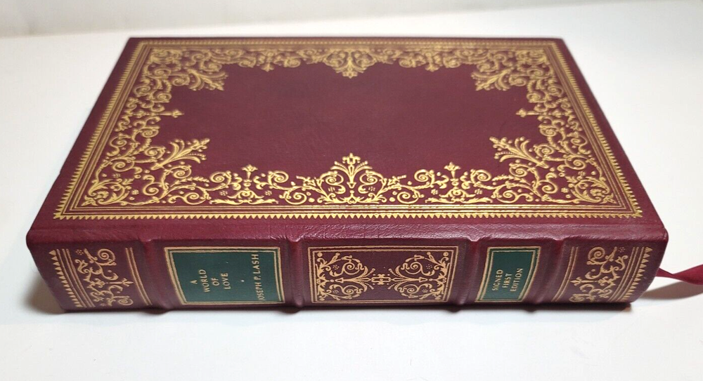 This rare and collectible book titled "A World Of Love" by Joseph P. Lash is a first edition signed by the author and published by The Franklin Library in Pennsylvania in 1984. The book is bound in high-quality leather and features gilt edges, making it a beautiful addition to any collection. Its subject matter, history, and Europe as its region, make it an excellent choice for those interested in the topic of world history. This book is part of the Franklin Library series and features illustrations and special attributes that make it unique. Whether you're a collector or a lover of history, this signed first edition is a must-have. Don't miss out on the opportunity to own a piece of history. Thanks for looking. I want you to be a satisfied customer. If you don't like it, just return it within 30 days of receipt, shipping costs not included. Item must be in the same condition as received. I do my best to describe items accurately, but if something was missed please let me know immediately as I would like to find a solution together. Your satisfaction is important to me. 23-2