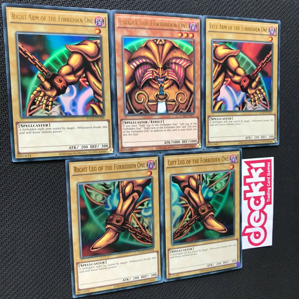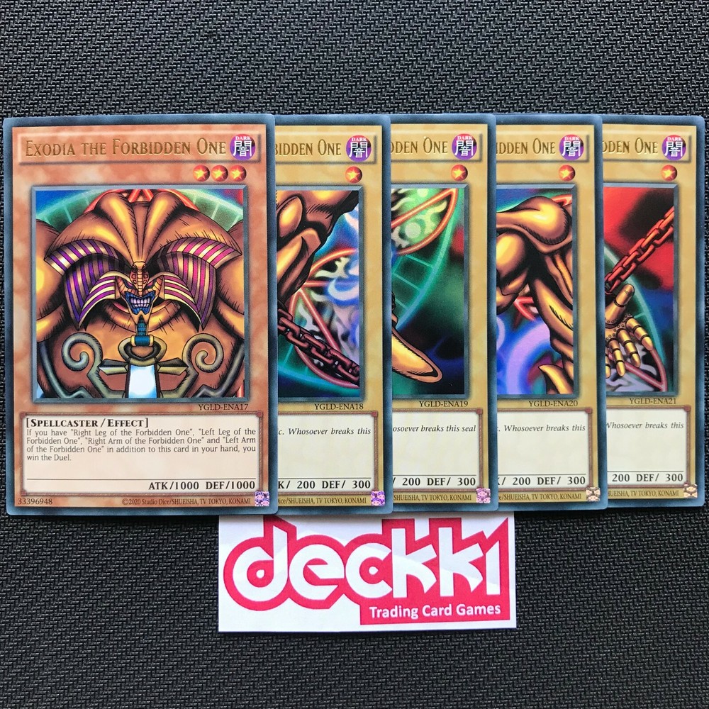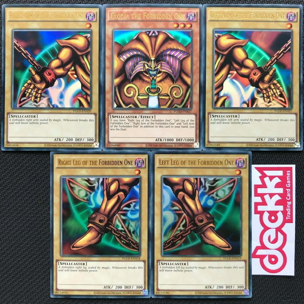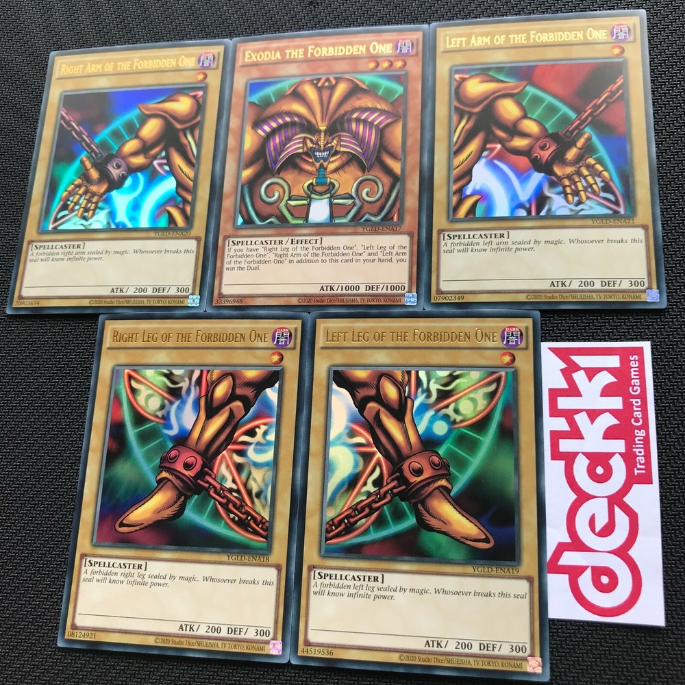 YuGiOh! Trading Card Game ALL 5 EXODIA PIECE CARDS - New, NM/Mint Condition, Ultra Rare: YGLD-ENA17 Exodia the Forbidden One YGLD-ENA18 Right Leg of the Forbidden One YGLD-ENA19 Left Leg of the Forbidden One YGLD-ENA20 Right Arm of the Forbidden One YGLD-ENA21 Left Arm of the Forbidden One Shipped in a Card Sleeve & Card Holder for safety. Grading Scale (M) : Mint: New Condition, with virtually no damages. We very rarely apply this grading scale. (NM/M) : Newer Near Mint Condition, may have feint scratches/marks and factory lines. (NM) : Lightly used Near Mint condition, with light scratches and minor edge and corner marks. (EX) : Excellent Condition, generally clean, with surface scratching, possible minor dings and edge wear. (LP) : Lightly Played Condition, clearly used and shows edge whitening and scratching. (P) : Played Condition, heavily scratched, with front and back edge whitening, corner dings and/or creases/bends. (HP) : Heavy Played Condition, shows significant edge wear, damaged corners, and possibly heavy creasing/bends. (D) : Damaged Condition, heavily worn with weakened structural integrity and possible water damage or stains. Please note: Whilst we take great care to grade cards this is only a guideline, as grading is subjective, and we always provide a generous number photographs to help you decide the condition for yourself before purchase. Deckki-TCG Established in 2010, Deck ki is a supplier of YuGiOh! and Pokemon Trading Cards, and Trading Card Accessories. Trusted seller with over 5000 reviews, selling collectibles for over 10 years, buy with confidence. Based in the United Kingdom and ships worldwide. Postage FREE 1st Class Delivery in the UK. Same-day dispatch aim. Worldwide shipping available. Returns 30 day returns for faulty/incorrect orders. Returns only accepted in original condition.