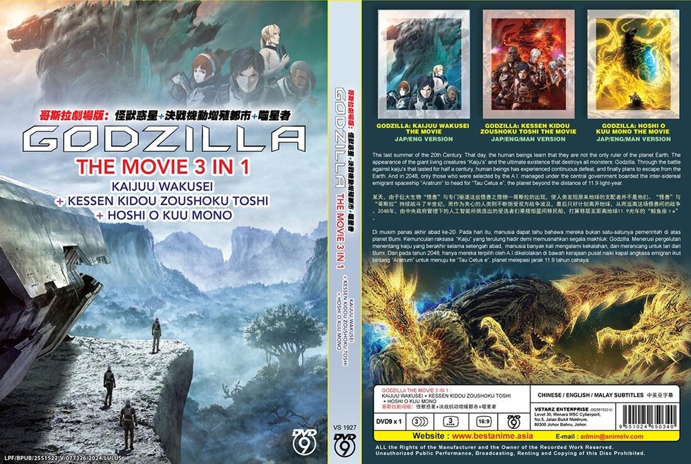 TITLE : GODZILLA THE MOVIE 3 IN 1 * ENGLISH DUBBED * Part 1 - Kaijuu Wakuse! Part 2 - Kessen Kidou Zoushoku Toshi Part 3 - Hoshi O Kuu Mono DESCRIPTION No of Disc : 1 No of Episode : 3 In 1 Movie Language : Japanese / English Subtitle : English / Chinese Format : DVD / NTSC & All Region Code (16.9) WE SELLING ALL ORIGINAL PRODUCT AND SIRIM MALAYSIA APPROVE BY GOV DEPARTMENT Shipping Time Tracking Number Provided To Track Your Shipment Delivery 10 to 18 Days Without Sat & Sun Working Days Payment Paypal Accepted Contact US Any Problems Or Enquiries Please E-Mail US Thanks Feedback Should Any Problem Arise, Please E-Mail To Let US Know & We Will Do Our Best To Rectify Any Problems Return Within 14 Days No Questions, Ask Return. Buyer Will Need Pay Return Postage Thanks For Shopping Have a Nice Days