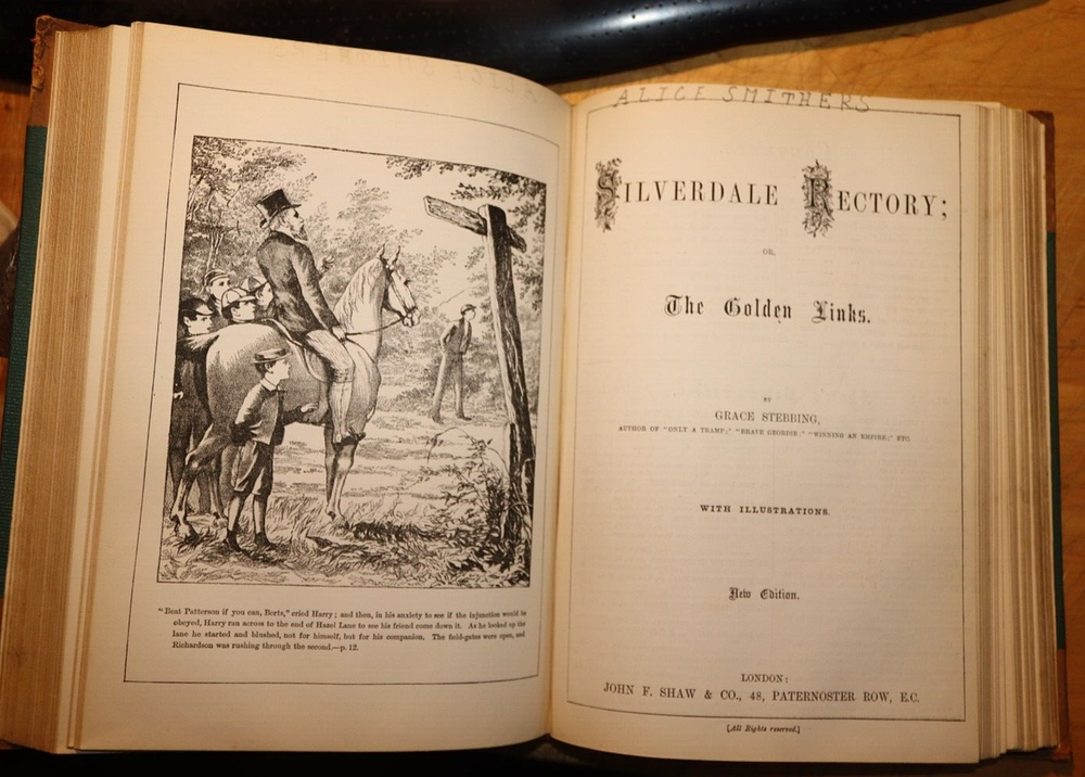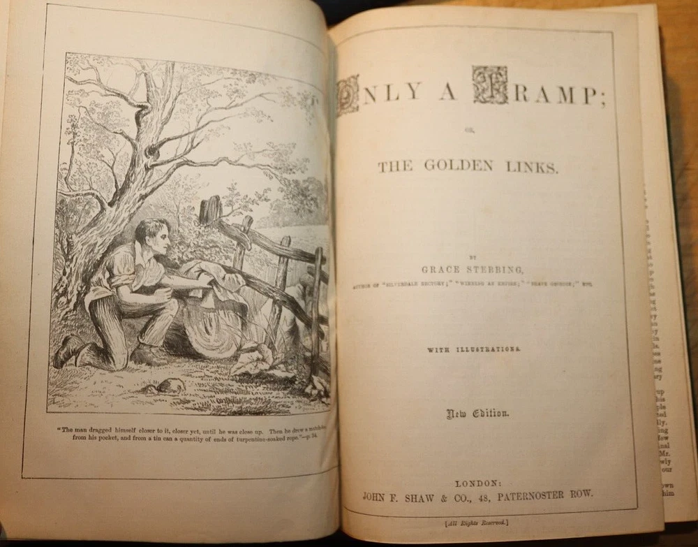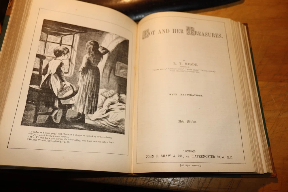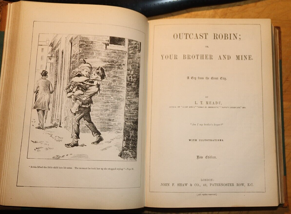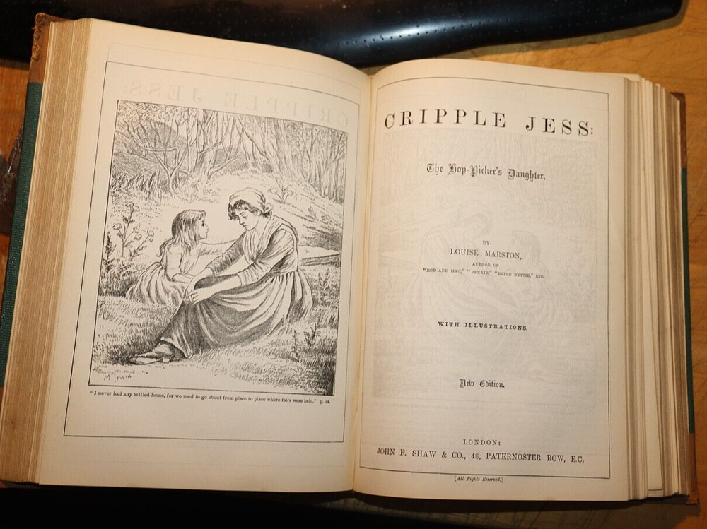 JOHN F SHAW HOME SERIES CHILDREN'S BOOKS BOUND TOGETHER LEATHER 1880's 3/4 LEATHER. THE HINGES ARE HOLDING BUT THE BOARDS MUST BE SUPPORTED. (I did not open the book without a support holding the board up a few inches). THEY ARE CLEARLY WEAKENING AND SINCE THE BOOK HAS LIKELY NOT BEEN OPENED IN THE PAST HUNDRED OR SO YEARS, I WOULD EXPECT THAT ANY USE WOULD RESULT IN A QUICKER FAILURE. THE EDGES OF THE LEATHER ON THE BOARD CORNERS IS WORN AND SCRAPED UP, BUT THE SPINE LOOKS GREAT. THE BOOKBINDER DID NOT KNOW HOW TO IDENTIFY THIS SO THE TITLE IS SIMPLY "MISCELLANEOUS". THIS CONSISTS OF ELEVEN BOOKS INDIVIDUALLY PURCHASED WITHOUT BOARDS AND BOUND TOGETHER FOR THE LITTLE OWNER, WHO PROBABLY PICKED HER ELEVEN FAVORITES. NO WRITING FOUND EXCEPT FOR AN OWNER NAME AT THE TOP OF ONE OF THE STORIES, IN PENCIL. EACH OF THE ELEVEN BOOKS IS ILLUSTRATED AND IS LISTED AS A "NEW EDITION". NO TEARS OR HARD CREASES FOUND. (PHOTO 1) shows the titles available as of the last story bound in this book. They give the prices but with "cloth extra", meaning that the purchase price was for a printed book with no covers. At that point, there were 38 stories, but there were only 15 stories available at the time that the first story in this volume "Only a Tramp" was printed. It appears that they published one story a month, so this collection was obtained over a period of a few years. Given that they could afford a leather binding, it appears that this may have been a monthly reading subscription list for little girls from at least moderately wealthy families. NOTHING HERE IS DATED AND I AM BASING THE DATE ON THE PUBLICATION DATES I WAS ABLE TO FIND FOR SOME OF THE STORIES IN THE LIST. Several of these authors wrote hundreds of books for girls and are very well known, though finding these stories physically in print anywhere is very difficult. THE ELEVEN BOOKS BOUND TOGETHER ARE: 1- ONLY A TRAMP by Grace Stebbing- first published by J.F Shaw in 1880 2- THE THREE CHUMS by M.L. Ridley 3- OUTCAST ROBIN; YOUR BROTHER AND MINE by L.T Meade (Elizabeth Thomasina Meade Smith) - first published by Shaw in 1878 4- THE LOST JEWEL by A.L.O.E (Charlotte Maria Tucker) - first published by Shaw in 1860 5- CRIPPLE JESS- THE HOP PICKER'S DAUGHTER by Louise Marston - first published by Shaw in 1882 6- ROB AND MAG - A LITTLE LIGHT IN A DARK CORNER by Louise Marston- first published by Shaw in 1881 7- SILVERDALE RECTORY or THE GOLDEN LINKS by Grace Stebbing- first published by Shaw in 1880- Owner name on top of title page. 8- DOT AND HER TREASURES by L.T Meade- first published by Shaw in 1879 9- THE EMPEROR'S BOYS by Ismay Thorn (Edith Carol Pollock) 10- MARJORIE AND MURIEL: TWO LONDON HOMES- by Evelyn Everett Green 11- DAVID'S LITTLE LAD by L.T Meade - first published by Shaw in 1877 THE LAST DATE THAT I FOUND, FROM THOSE WHERE I COULD IDENTIFY A DATE, WAS 1882. Several of these author's wrote hundreds of books for young girls during the latter quarter of the 19th Century and much of that work disappeared because they are often only found in these books that were sold without bindings. It is worth noting that every one of the stories in this volume was written by a woman. EACH STORY TENDS TO BE ABOUT 60 DOUBLE COLUMNED PAGES IN THIS 7" X 9.75" BOOK, WHICH WOULD TRANSLATE INTO ABOUT 175 PAGES IN A SMALL BOOK. OTHER THAN THE SCRAPED LEATHER ON THE BOARD CORNERS AND THE QUICKLY WEAKENING HINGES, THIS BOOK IS EXTREMELY WELL MAINTAINED WITH VERY SCARCE ORIGINAL STORIES. PLEASE USE ZOOM FUNCTION ON ALL PHOTOS. denglass PLEASE NOTE: For book sales, I virtually always include a vinyl bag tightly wrapped on the exterior. This is an attempt to prevent any USPS employee from opening the package for inspection as it would be time consuming for them to repackage it. This is done simply because my packaging is done more carefully than their repackaging and also to protect the book from the elements. The vinyl bag covers cardboard protection and you can simply cut the bag open (carefully) and remove the contents. The cardboard protection is also typically held with tape and cutting in the obvious places will allow the cardboard to pop right open, exposing the book (in another protective vinyl bag). Using this method, you should be able to open any book I send in under a minute. No "buzz saw" is required. Thank you