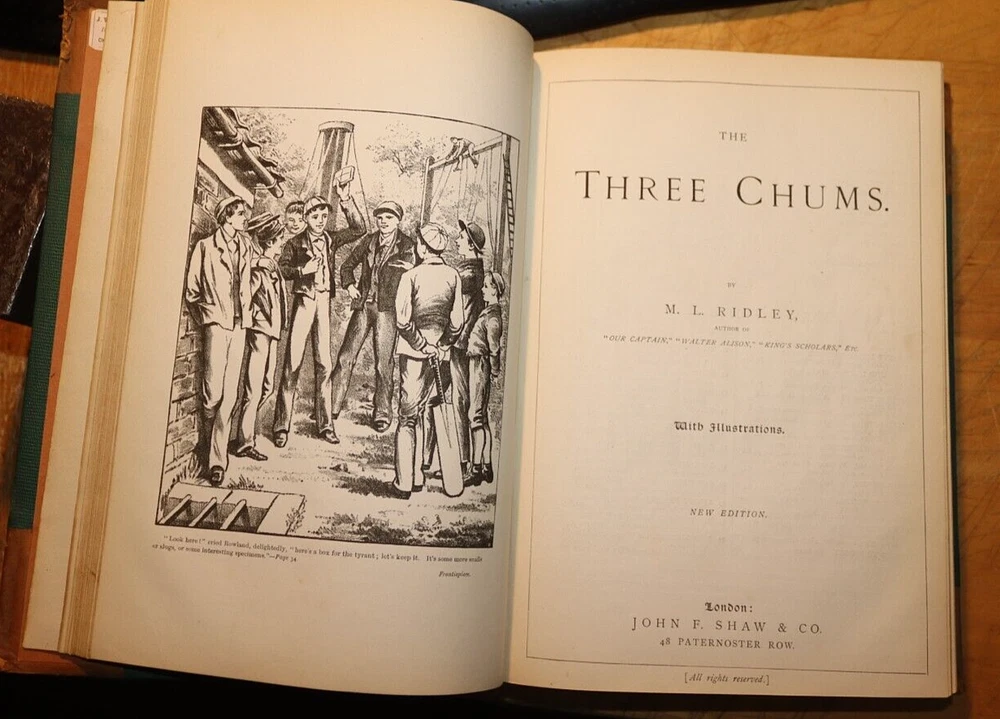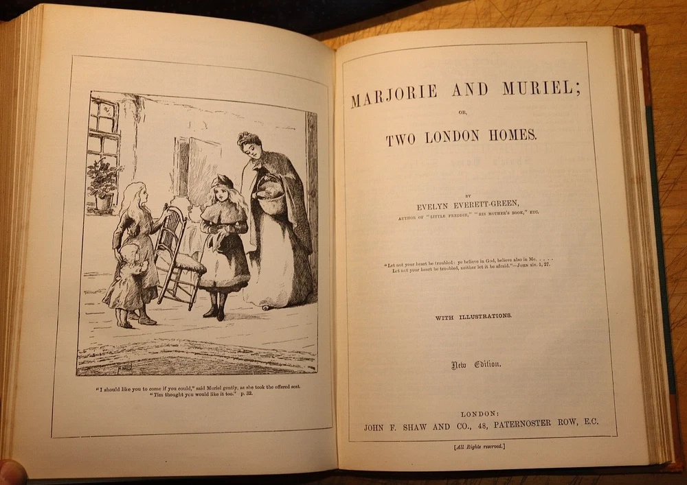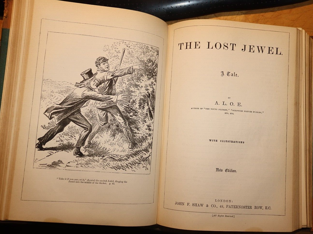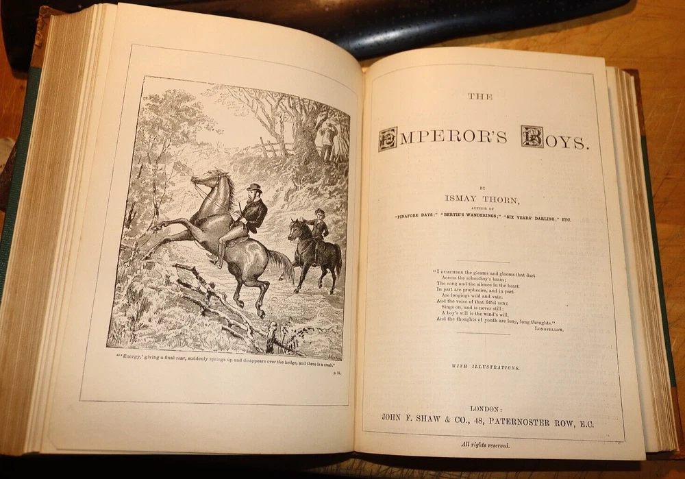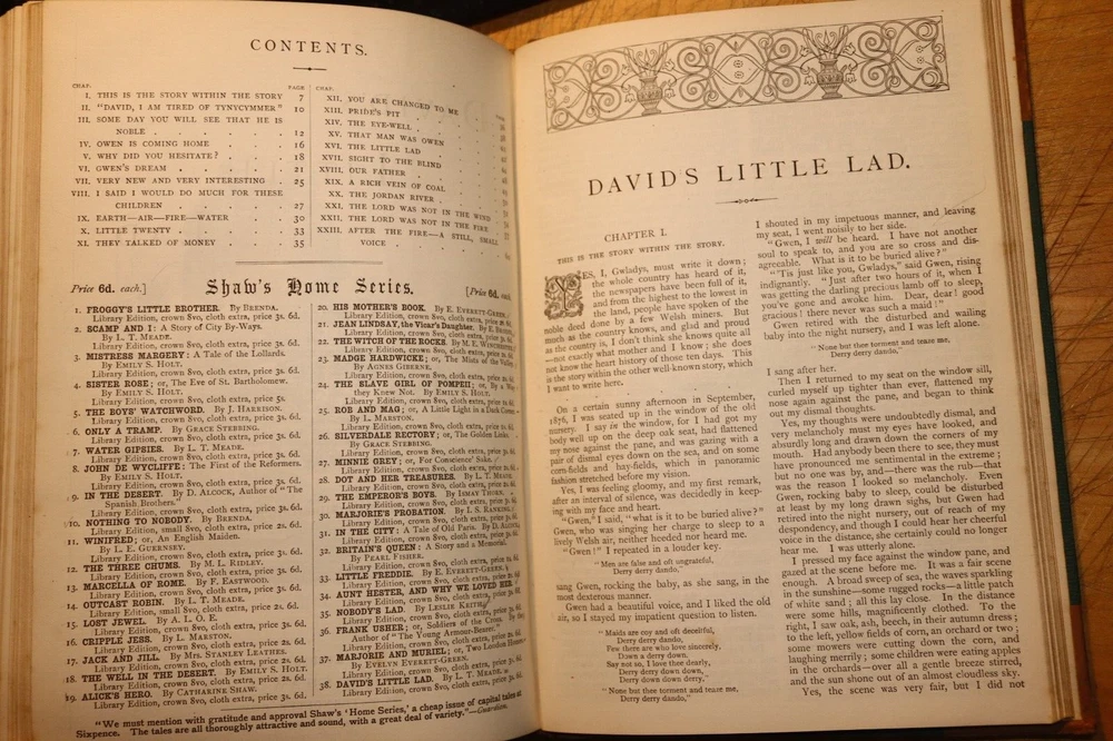 JOHN F SHAW HOME SERIES CHILDREN'S BOOKS BOUND TOGETHER LEATHER 1880's 3/4 LEATHER. THE HINGES ARE HOLDING BUT THE BOARDS MUST BE SUPPORTED. (I did not open the book without a support holding the board up a few inches). THEY ARE CLEARLY WEAKENING AND SINCE THE BOOK HAS LIKELY NOT BEEN OPENED IN THE PAST HUNDRED OR SO YEARS, I WOULD EXPECT THAT ANY USE WOULD RESULT IN A QUICKER FAILURE. THE EDGES OF THE LEATHER ON THE BOARD CORNERS IS WORN AND SCRAPED UP, BUT THE SPINE LOOKS GREAT. THE BOOKBINDER DID NOT KNOW HOW TO IDENTIFY THIS SO THE TITLE IS SIMPLY "MISCELLANEOUS". THIS CONSISTS OF ELEVEN BOOKS INDIVIDUALLY PURCHASED WITHOUT BOARDS AND BOUND TOGETHER FOR THE LITTLE OWNER, WHO PROBABLY PICKED HER ELEVEN FAVORITES. NO WRITING FOUND EXCEPT FOR AN OWNER NAME AT THE TOP OF ONE OF THE STORIES, IN PENCIL. EACH OF THE ELEVEN BOOKS IS ILLUSTRATED AND IS LISTED AS A "NEW EDITION". NO TEARS OR HARD CREASES FOUND. (PHOTO 1) shows the titles available as of the last story bound in this book. They give the prices but with "cloth extra", meaning that the purchase price was for a printed book with no covers. At that point, there were 38 stories, but there were only 15 stories available at the time that the first story in this volume "Only a Tramp" was printed. It appears that they published one story a month, so this collection was obtained over a period of a few years. Given that they could afford a leather binding, it appears that this may have been a monthly reading subscription list for little girls from at least moderately wealthy families. NOTHING HERE IS DATED AND I AM BASING THE DATE ON THE PUBLICATION DATES I WAS ABLE TO FIND FOR SOME OF THE STORIES IN THE LIST. Several of these authors wrote hundreds of books for girls and are very well known, though finding these stories physically in print anywhere is very difficult. THE ELEVEN BOOKS BOUND TOGETHER ARE: 1- ONLY A TRAMP by Grace Stebbing- first published by J.F Shaw in 1880 2- THE THREE CHUMS by M.L. Ridley 3- OUTCAST ROBIN; YOUR BROTHER AND MINE by L.T Meade (Elizabeth Thomasina Meade Smith) - first published by Shaw in 1878 4- THE LOST JEWEL by A.L.O.E (Charlotte Maria Tucker) - first published by Shaw in 1860 5- CRIPPLE JESS- THE HOP PICKER'S DAUGHTER by Louise Marston - first published by Shaw in 1882 6- ROB AND MAG - A LITTLE LIGHT IN A DARK CORNER by Louise Marston- first published by Shaw in 1881 7- SILVERDALE RECTORY or THE GOLDEN LINKS by Grace Stebbing- first published by Shaw in 1880- Owner name on top of title page. 8- DOT AND HER TREASURES by L.T Meade- first published by Shaw in 1879 9- THE EMPEROR'S BOYS by Ismay Thorn (Edith Carol Pollock) 10- MARJORIE AND MURIEL: TWO LONDON HOMES- by Evelyn Everett Green 11- DAVID'S LITTLE LAD by L.T Meade - first published by Shaw in 1877 THE LAST DATE THAT I FOUND, FROM THOSE WHERE I COULD IDENTIFY A DATE, WAS 1882. Several of these author's wrote hundreds of books for young girls during the latter quarter of the 19th Century and much of that work disappeared because they are often only found in these books that were sold without bindings. It is worth noting that every one of the stories in this volume was written by a woman. EACH STORY TENDS TO BE ABOUT 60 DOUBLE COLUMNED PAGES IN THIS 7" X 9.75" BOOK, WHICH WOULD TRANSLATE INTO ABOUT 175 PAGES IN A SMALL BOOK. OTHER THAN THE SCRAPED LEATHER ON THE BOARD CORNERS AND THE QUICKLY WEAKENING HINGES, THIS BOOK IS EXTREMELY WELL MAINTAINED WITH VERY SCARCE ORIGINAL STORIES. PLEASE USE ZOOM FUNCTION ON ALL PHOTOS. denglass PLEASE NOTE: For book sales, I virtually always include a vinyl bag tightly wrapped on the exterior. This is an attempt to prevent any USPS employee from opening the package for inspection as it would be time consuming for them to repackage it. This is done simply because my packaging is done more carefully than their repackaging and also to protect the book from the elements. The vinyl bag covers cardboard protection and you can simply cut the bag open (carefully) and remove the contents. The cardboard protection is also typically held with tape and cutting in the obvious places will allow the cardboard to pop right open, exposing the book (in another protective vinyl bag). Using this method, you should be able to open any book I send in under a minute. No "buzz saw" is required. Thank you