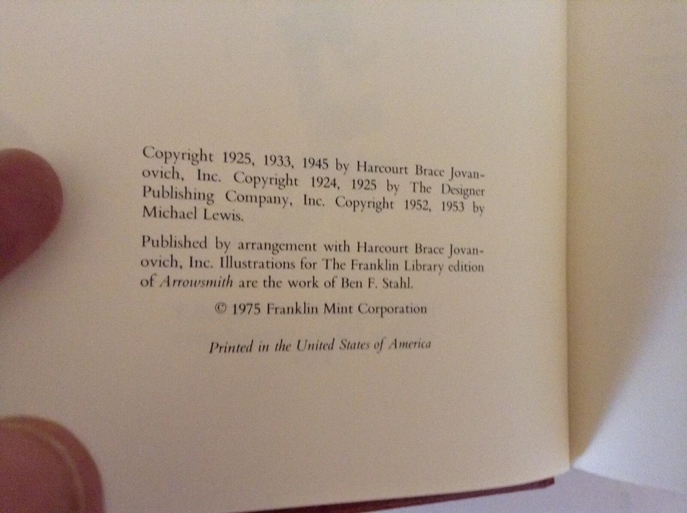For your collection: Collector's 1975 edition from the Franklin Library , "Arrowsmith" By Sinclair Lewis . This copy is leather bound, new and unread.