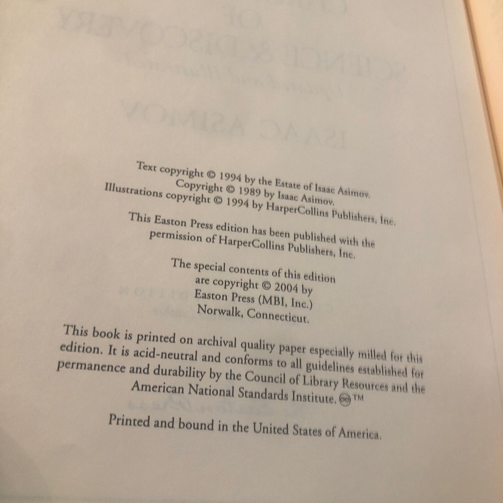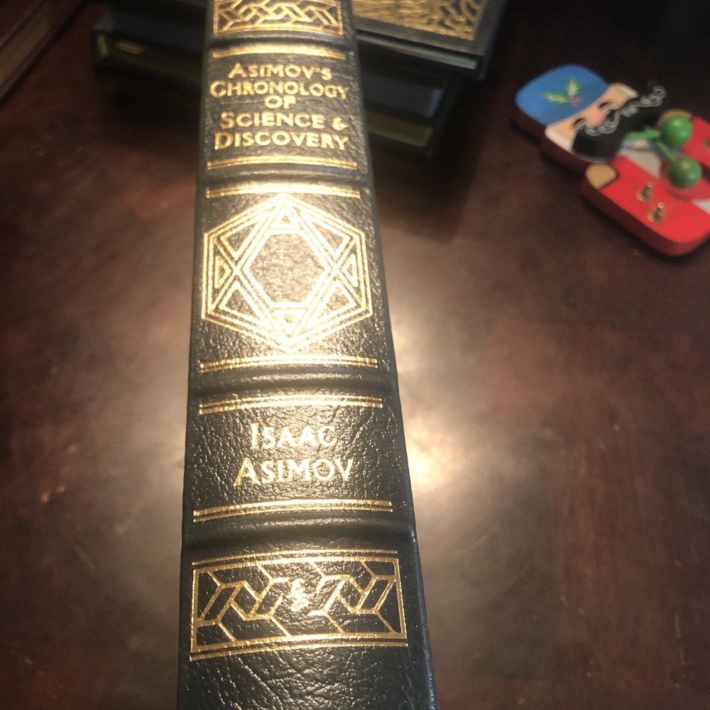 The product is a luxury edition collector's item titled "ASIMOV’S CHRONOLOGY of SCIENCE DISCOVERY" by Isaac Asimov, focusing on science fiction and fantasy topics. It is an illustrated Foundation Trilogy book published by Easton Press in 2004, featuring leather binding and originating from North America. This exclusive edition is a unique and valuable piece for fans of Asimov's work and collectors of science fiction literature. From a large estate of 1,000 Easton Press leather books being listing over next several weeks reasonably priced!! Non smoking & pet free estate. It has a bookplate in front - blank & not signed/filled out. NO Previous owner signature in front page, see pic. Very nice mint condition. Never read. They are all from 1 estate, see pics. Free shipping.