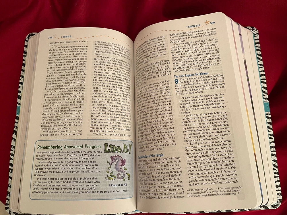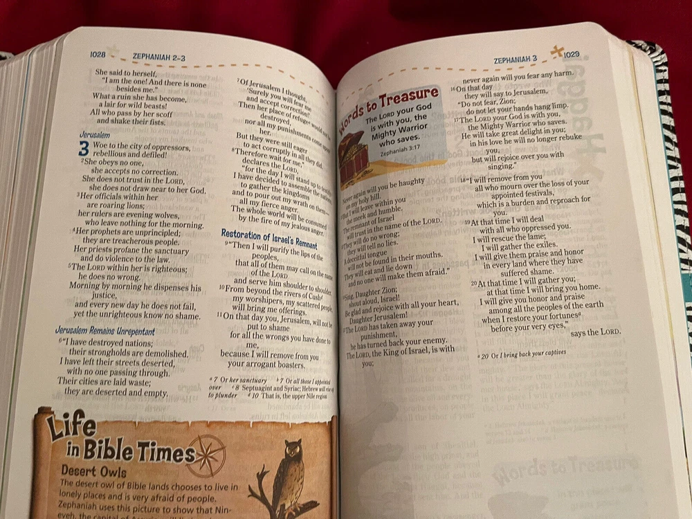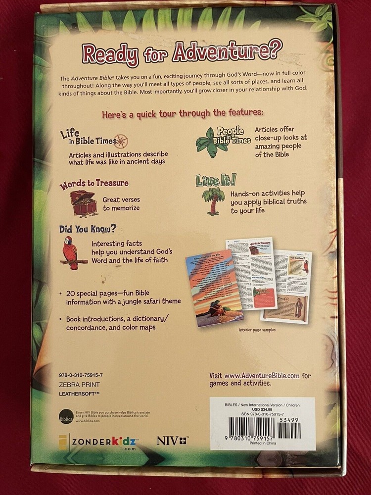 New! Adventure Bible Ser.: NIV Adventure Bible, Leather Soft, Zebra Print, Full Color. Zebra Print Leathersoft Ready for Adventure? Embark on a fun, exciting journey through God's Word with the NIV Adventure Bible, now in full color throughout! Along the way you'll meet all types of people, see all sorts of places, and learn all kinds of things about the Bible. Most importantly you'll grow closer in your relationship with God. Features include: Full color throughout---makes learning about the people, places, and culture of the Bible even more engaging Life in Bible Times---Articles and illustrations describe what life was like in ancient days Words to Treasure---Highlights great verses to memorize Did You Know?---Interesting facts help you understand God's Word and the life of faith People in Bible Times---Articles offer close-up looks at amazing people of the Bible Twenty special pages---Focus on topics such as famous people of the Bible, highlights of the life of Jesus, how to pray, and the love passage for kids, all with a jungle safari theme Book introductions with useful facts about each book of the Bible Dictionary/concordance for looking up tricky words Color map section to help locate places in the Bible Complete text of the New International Version (NIV) of the Bible PRODUCT INFORMATION▲ Title: NIV Adventure Bible, Imitation Leather, Zebra Print Format: Imitation Leather Number of Pages: 1488 Vendor: ZonderKidz Publication Date: 2017 ISBN: 0310759153 ISBN-13: 9780310759157 Ages: 8-12 Series: Adventure Bible Text Color: Black Letter Text Size: 8 Point Thumb Index: No Ribbon Marker: Yes Light Blue Spine: Sewn Page Gilding: None Page Edges: White Stock No: WW759157 Imprintable: Yes Listing and template services provided by inkFrog