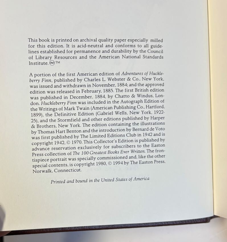 Adventures of Huckleberry Finn ~ Collector Edition 1994, Easton Press Leather Bound Book Measures: 9 1/2" x 6" x 1 1/2" ~ 396 Pages Very Good Condition - No rips or markings