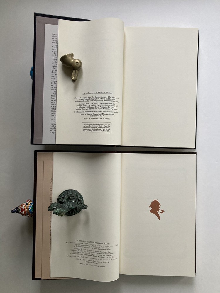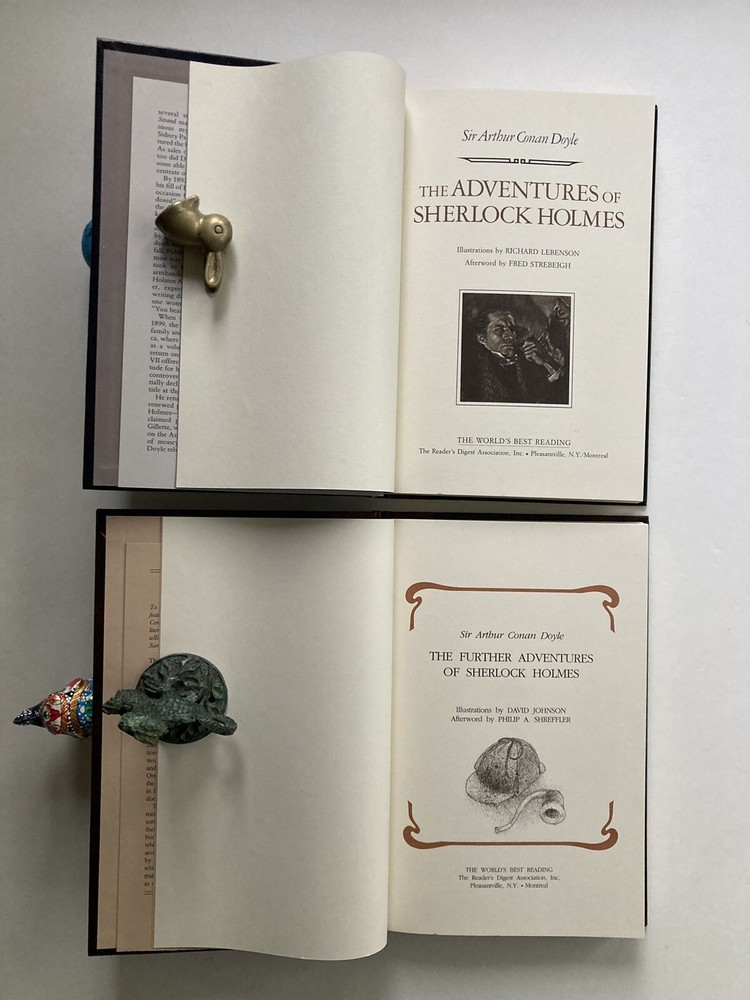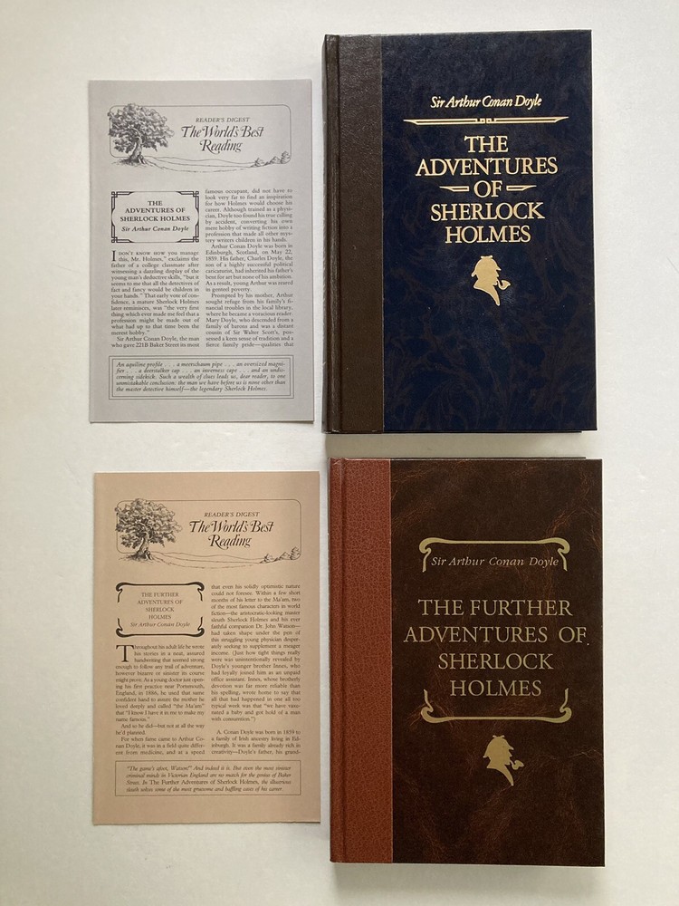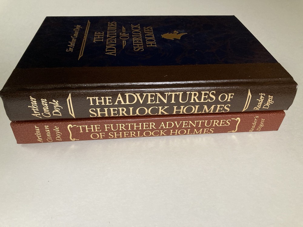 The Adventures of Sherlock Holmes (The World's Best Reading) and The Further Adventures of Sherlock Holmes (The World's Best Reading) by Arthur Conan Doyle The Adventures of Sherlock Holmes (The World's Best Reading) Full Leather Hardcover 270 pages. Condition Very Good Issued with NO Dust Jacket. Reader's Digest World's Best Reading Reprint edition 1987. Handsome black leather boards with 1/4 brown spine and gilt embossing shows off this Clean, tight, square copy with no marks, highlights or bookplates. Book Well kept and carefully stored in unread condition. Slight shelf wear - a small cut on front cover and a small scratch on back cover. Not an ex-library, book club or remainder copy. The Further Adventures of Sherlock Holmes (The World's Best Reading) Full Leather Hardcover 219 pages. Condition Fine Issued with NO Dust Jacket. Reader's Digest World's Best Reading Reprint edition 1993. Beautiful brown leather boards with 1/4 brown spine and gilt embossing shows off this Clean, tight, square copy with no marks, highlights or bookplates. Book Well kept and carefully stored in unread condition. No shelf wear. Not an ex-library, book club or remainder copy. Each with Laid in four page brochure. ==== The Adventures of Sherlock Holmes is a collection of twelve short stories by Arthur Conan Doyle, featuring his fictional detective Sherlock Holmes. It was first published on 14 October 1892; the individual stories had been serialised in The Strand Magazine between July 1891 and June 1892. The most recognized detective in all of literature, Sherlock Holmes emerged on the crime scene in A Study in Scarlet in 1887. His deductive reasoning, keen insight, skillful observations, and investigative tactics became the tools necessary to solve riveting and intriguing crimes that continue to delight generations of readers. Nothing compares to the original. If you really want to know Holmes and Watson, this is what you should read. The characterization and pacing is delightful. The insights into a London of trains and mail more than once a day, the manners of the time, the dialogue . . . this is a feast. ==== Collection of Sherlock Holmes stories which includes seven stories from His Last Bow and four additional non-canonical stories by Sir Arthur Conan Doyle. As Philip Shreffler points out in his afterword to this volume (1993) most Sherlock Holmes stories were written when the London they evoked was already passing away. Thus they appealed to the nostalgia of their readers. "His Last Bow", concerns Holmes' final adventure, which occurred in 1914. They are all top-notch, as were all Holmes stories in general. They make great reading, whether you are a real mystery fan or just enjoy very good writing. Includes: The Adventure of Wisteria Lodge The Adventure of the Bruce-Partington Plans The Adventure of the Devil's Foot The Adventure of the Red Circle The Disappearance of Lady Frances Carfax The Adventure of the Dying Detective His Last Bow The Story of the Man with the Watches The Story of the Lost Special The Field Bazaar How Watson Learned the Trick Afterword by Philip A. Shreffler, long-time member of the famous Sherlock Holmes society known as 'The Baker Street Irregulars'