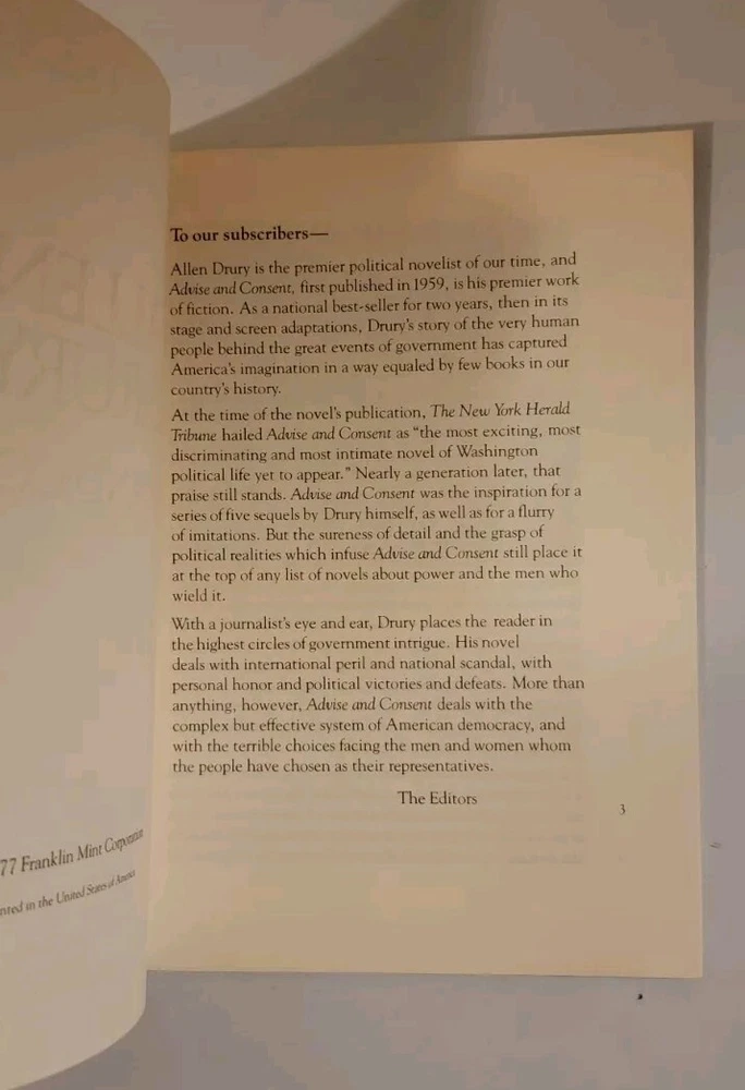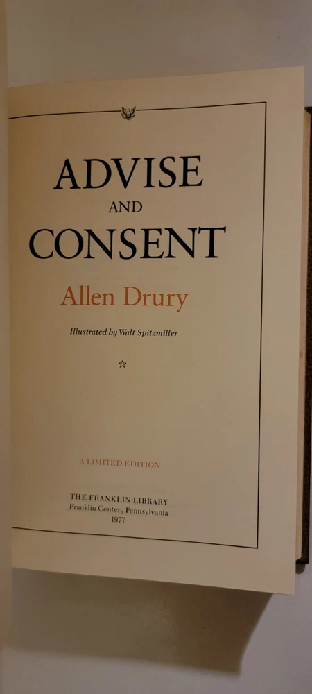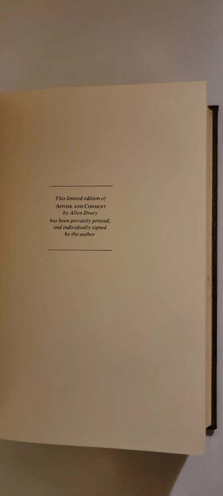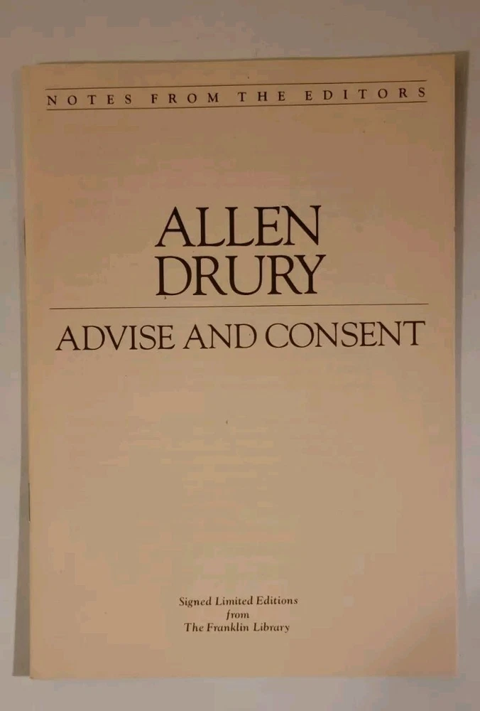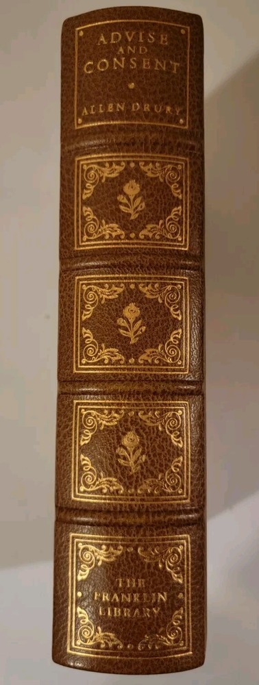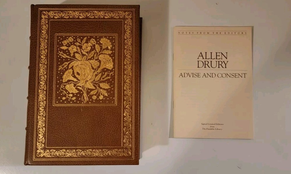 Very very good condition collectible book. Binding and pages are very stiff, never read. No marks, writing name plates etc inside and only a few minor blemishes marks on the outside edges of the pages. Leather cover/spine are blemish free and look great from what I can tell. Please ask for more pictures if you need to see anything else. The silk moire is in excellent condition without faded edges seen in some other postings. This book is signed by the author AND includes the original protective tissue paper over the signature. Please see pictures. Also included are the original Notes from the Editors which were available to Franklim Library subscribers. Feel free to ask if you have any questions or require additional pictures. Internet description below. This Franklin Library edition of "Advise and Consent" by Allen Drury is a rare find for any book collector. The leather bound book, originally printed in 1977, contains illustrations and notes from the editors. The book covers modern literature and fiction, with a focus on American origin. It is an original printing and written in English. The book's subject matter and special attributes make it a unique addition to any collection. The publisher, Franklin Library, is well-known for its high-quality publications, making this book a valuable item for any literature enthusiast. The book's region of manufacture is North America, specifically the United States. This item falls under the categories of Books & Magazines and Antiquarian & Collectible.