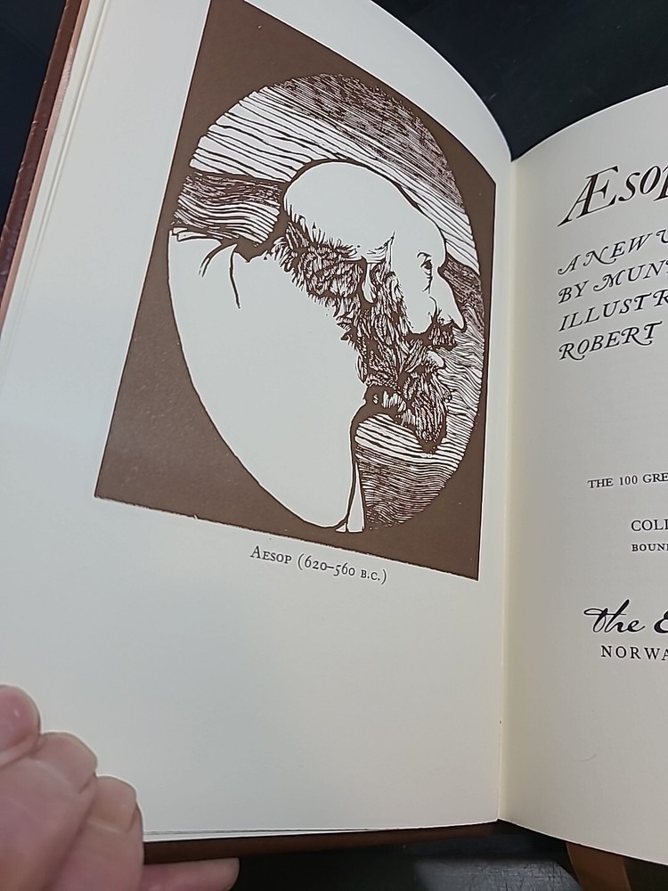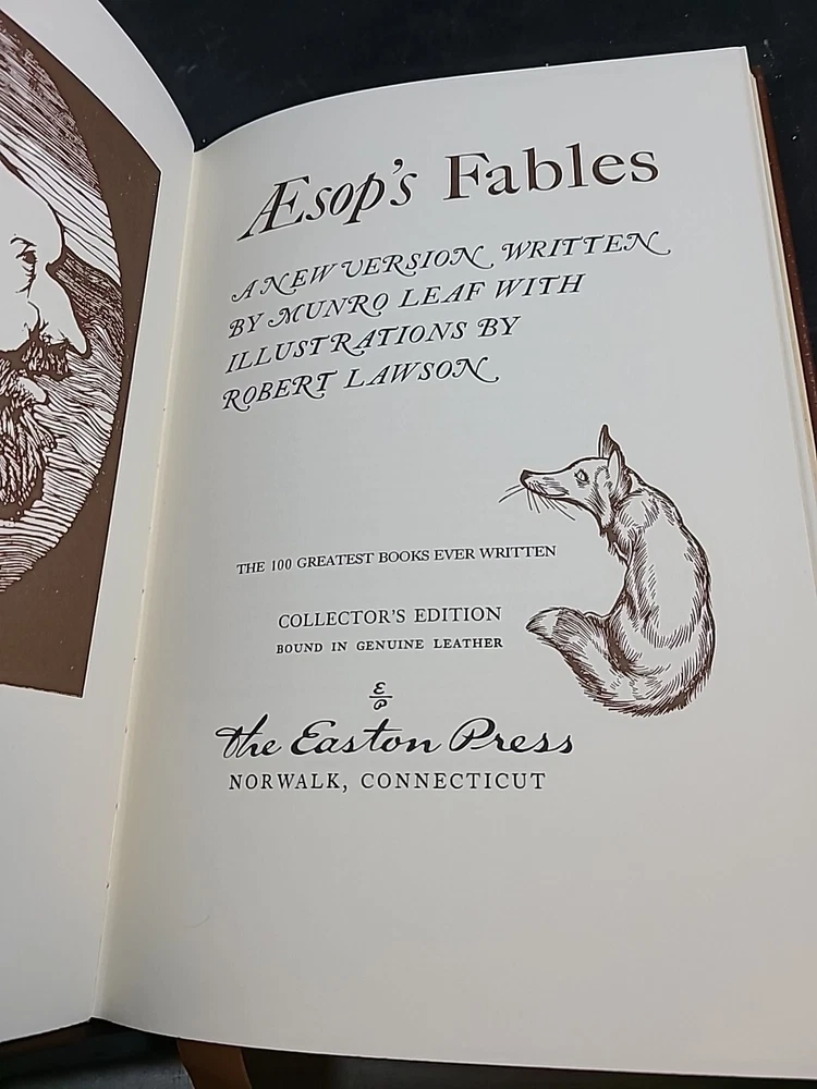 This is a rare and highly sought-after collector's edition of Aesop's Fables, published by Easton Press in 1979. The book is bound in leather and features 100 greates books in the series. The illustrations by Robert Lawson are stunning and make this edition a true gem for any literature or fiction collector. The book is in its original form and has not been personalized or signed by the author. It is a must-have for any fan of classics and is a great addition to any collection.