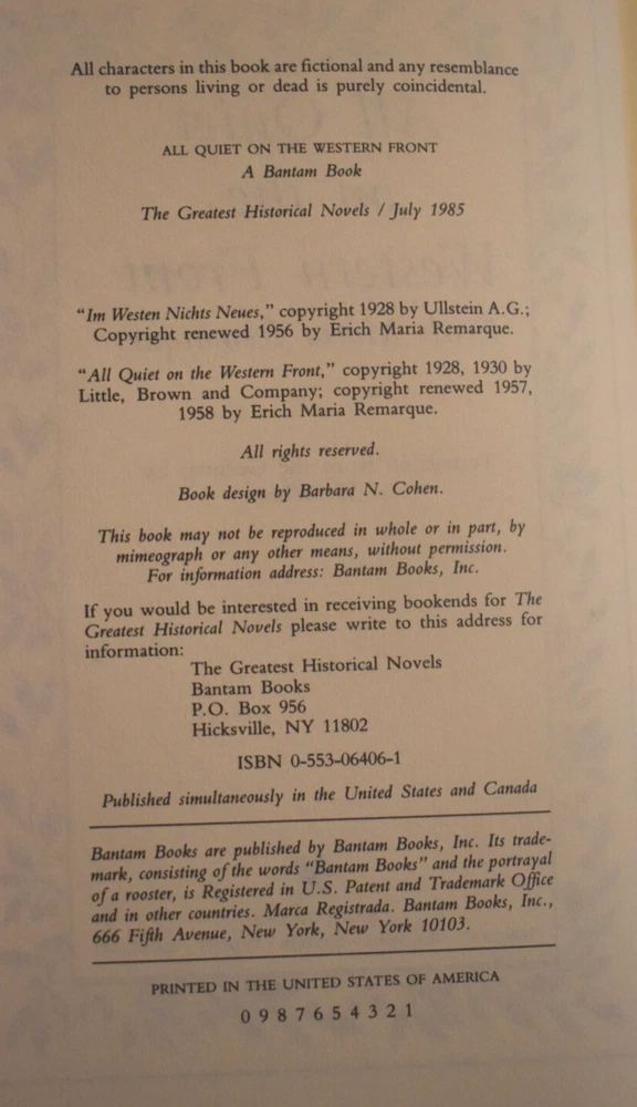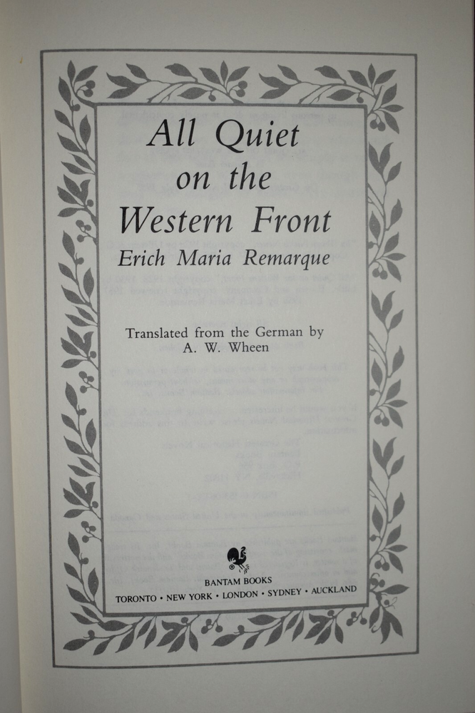 Immerse yourself in the poignant prose of Erich Maria Remarque with the Bantam Edition of "All Quiet on the Western Front," a seminal work that captures the brutality and human cost of war. Published in 1985, this hardcover copy is part of the Greatest Historical Novels series and comes elegantly bound in faux leather, adding a touch of classicism to your literary collection. This novel, set against the backdrop of World War I, is a powerful narrative that has stood the test of time. It offers readers a profound glimpse into the experiences of soldiers on the frontline, masterfully woven in the English language. A non-autographed treasure, this book is a testament to Remarque's enduring legacy and a must-have for enthusiasts of historical fiction. SEE PICS PLEASE EMAIL ME WITH ANY QUESTIONS WILL COMBINE SHIPPING