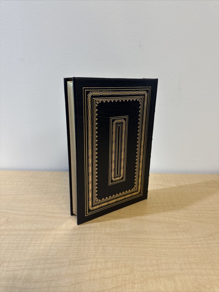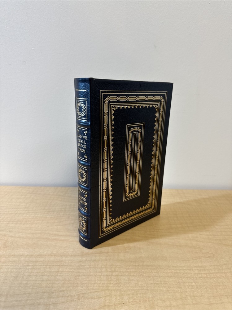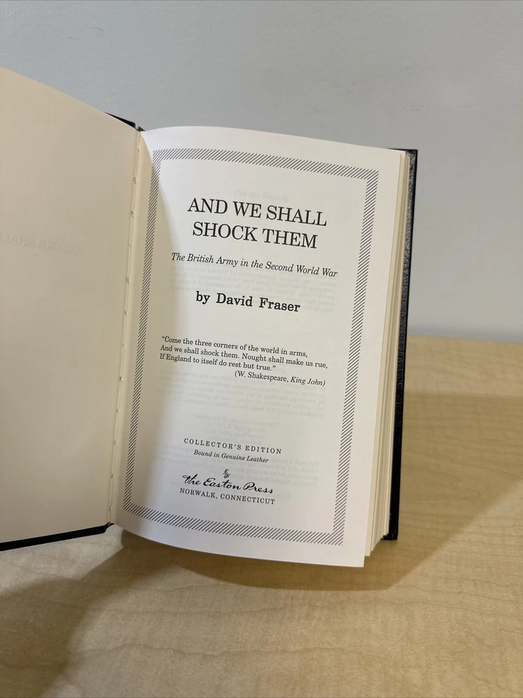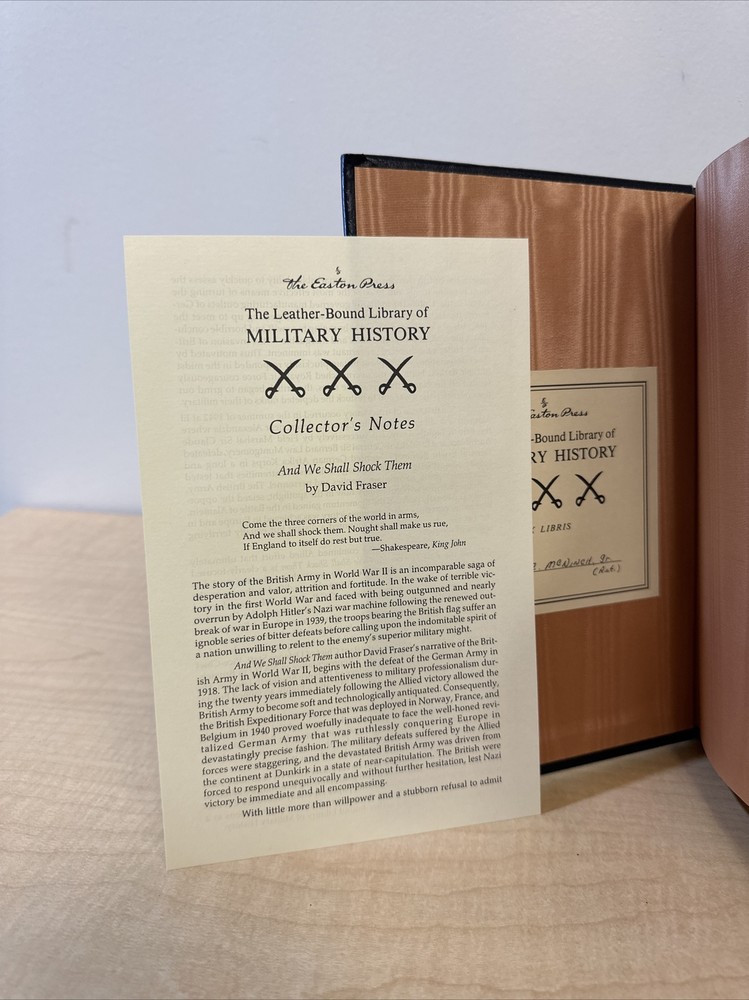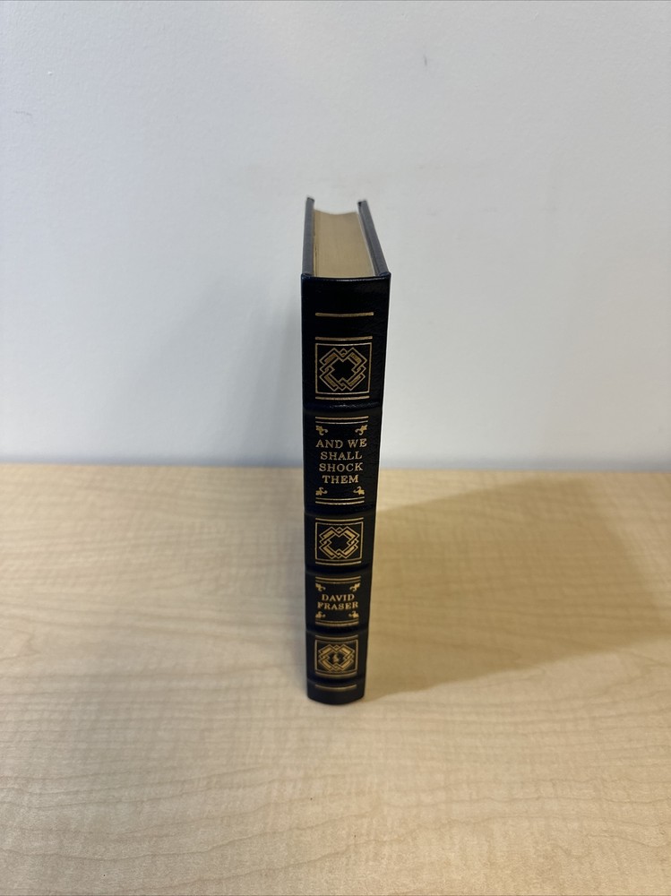 And We Shall Shock Them by David Fraser, Easton Press, 1997. Near fine condition. Collector's Edition. Leather bound. Full navy leather, title in gilt on spine. Decorative gilt illustrations on cover and spine. Gilt edges, silk bookmark, and silk endpapers. Small marks to edge gilt. Trace of dust on top edge. Previous owner's name on Easton Press bookplate affixed to front endpaper. Military History series, includes Easton Press Collector's Notes laid in. Book features photographs and maps. See photographs for more detail.