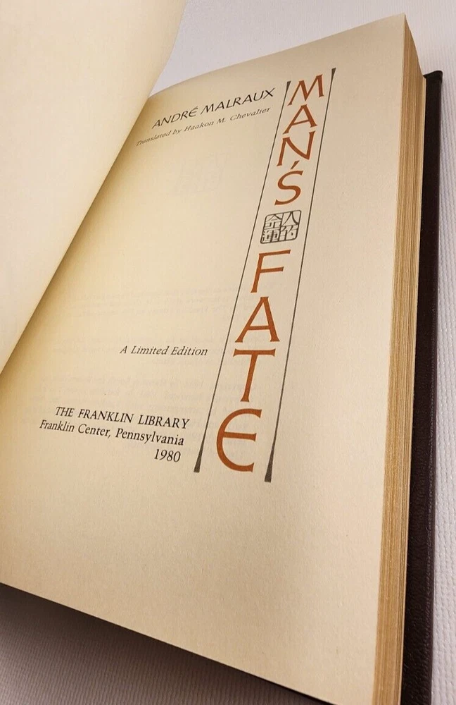 Man's Fate Andre Malraux Franklin Library Limited Edition Leather Bound 1980 Hardcover Very Good condition, appears unread, clean copy. Small scratch on front cover. View photos for details. International buyers, please note: Import duties, taxes, and charges (typically collected upon delivery or pickup) are the buyer’s responsibility and are not included in the item price or shipping charges. Please check with your country’s customs office prior to bidding/buying to determine what these additional costs will be.