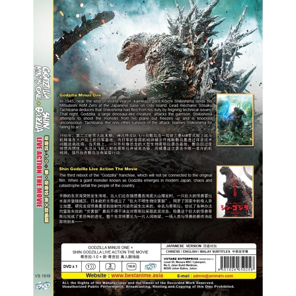 Anime DVD Godzilla Minus One + Shin Live Action Movies English Sub + FREE GIFT DESCRIPTION Synopsis: In 1945, near the end of World War II, kamikaze pilot Kōichi Shikishima lands his Mitsubishi A6M Zero at the Japanese base on Odo Island. Lead mechanic Sōsaku Tachibana deduces that Shikishima had fled from his duty by feigning technical issues. That night, Godzilla, a large dinosaur-like creature, attacks the garrison. Shikishima attempts to shoot the monster from his plane but freezes up and is knocked unconscious. Tachibana, the only other survivor of the attack, blames Shikishima for failing to act. Packing: • 1 Boxset in one package Item Details: Anime DVD Godzilla Minus One + Shin Live Action Movies English Sub + FREE GIFT • Condition: Authentic Brand NEW, Original Factory Sealed. • Language: Japanese • Subtitle: English / Chinese • Media Type: NTSC; Widescreen 16:9, All Region • No of CDs: DVD x 1 SHIPPING • We ship order everyday except Sat & Sun or Malaysia Public holidays. • Handling time is 1-3 working days. All products are packed, and layered with bubble wrap to reduce damages during shipment delivery. • The estimated time of arrival for ECONOMY SHIPPING is (11-23) business days, while for EXPEDITED SHIPPING it is (1-5) business days, applicable to major cities only. Deliveries outside major cities may incur additional days. • Product ship completed with tracking number. PAYMENT • WE ACCEPT ALL PAYMENTS MANAGED BY EBAY • Kindly ensure that your address on ebay is matched with your shipping address before you pay. RETURNS • Return within 30 Days from date received. • All things must be returned in their original condition, without being broken or changed. • If you have any problem with the order, do contact us via ebay message. We are glad to assist you and solving the problem as soon as possible. • You must also provide us with your shipping tracking information, and we will provide a refund within three business days of receiving the returned item. CUSTOMER SATISFACTION We try our very best to make sure every customer is completely satisfied. If there's a problem, message us! We're happy to help. Thank you for viewing our listing.