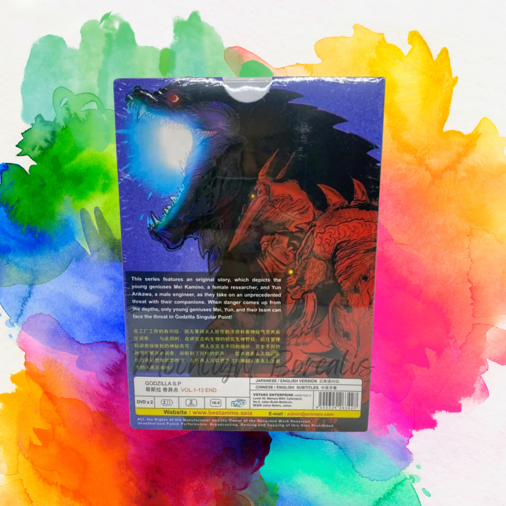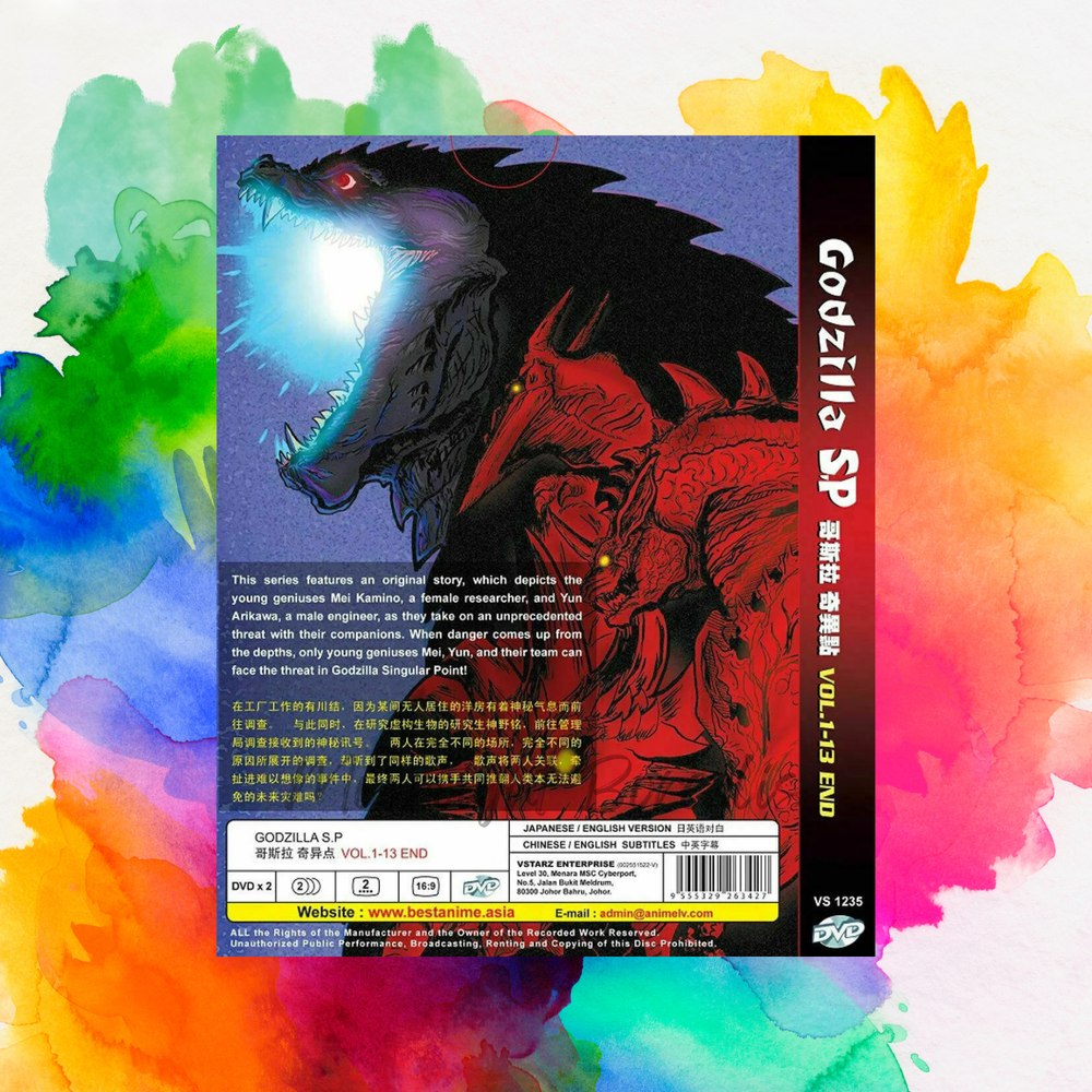 Created with Eselt - eBay Template Editor Created with Eselt - eBay Template Editor Anime DVD Godzilla S.P. (Singular Point) (Vol 1-13 End) Story Synopsis : This series features an original story, which depicts the young geniuses Mei Kamino, a female researcher, and Yun Arikawa, a male engineer, as they take on an unprecedented threat with their companions. When danger comes up from the depths, only young geniuses Mei, Yun, and their team can face the threat in Godzilla Singular Point! TV Series (Episodes): A Distant Road Home Haruka naru Ieji (はるかなるいえじ) Midsummer Oni Festival Manatsu Oni Matsuri (まなつおにまつり) Tigerish Nobae no Kyoufu (のばえのきょうふ) The Future Not Yet Seen Mada Minu Mirai wa (まだみぬみらいは) Theorist / Early Wind Hayaki Koto Kaze no (はやきことかぜの) Enfatico Riron Naki Suuji (りろんなきすうじ) Omniarch Jikan no Gimonfu (じかんのぎもんふ) Graftage Maboroshi no Sugata (まぼろしのすがた) Erumpent Taore Yuku Hito no (たおれゆくひとの) Encipher Rikigaku no Genri (りきがくのげんり) Relaunch Rifujin na Gakufu (りふじんながくふ) Explorer Tatakai no Owari (たたかいのおわり) Together Hajimari no Futari (はじまりのふたり) Product specification : Title name: Godzilla S.P. (Singular Point) No. of disc : 2 Discs Version : Japanese / English Subtitles : English / Chinese Format : DVD / NTSC & All Region Code Aspect Ratio : 16:9 Product dimension (approx.) : Width : 12.0 cm Thickness : 1.2 mm How to care for CDs / DVDs : Keep the discs away from heat and out of direct sunlight. Store discs in a cool, dark place if possible. Be careful to no bend the discs when removing from the case. Avoid humid storage conditions. Store the discs in upright cases when not in use. Handle the discs carefully. Avoid scratching the discs, especially the top surface of the discs. Note : The real color of the item may be slightly different from the pictures shown on website caused by many factors such as light or your monitor brightness. Please allow slight manual measurement deviation for the data. Payment Currently, we accept payments through eBay - managed payment. Shipping We are using standard shipping from the USA. Handling time is 1-3 working days. Your goods will be shipped with a valid tracking number. All products are packed, and layered with bubble wrap to reduce damages during shipment delivery. Estimate delivery is between 4 to 7 business days. Returns If you have any problems with the order, please contact us via eBay message. We are glad to assist you and resolve the issue as soon as possible. Items can be returned within 30 days in good condition. Other Note: Import duties, taxes, and additional charges are not included in the item price or shipping charges. Please be aware that custom import duties and taxes are the buyer's responsibility. Created with Eselt - eBay Template Editor