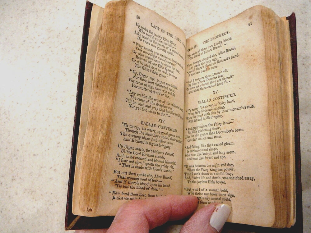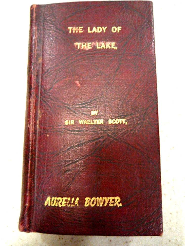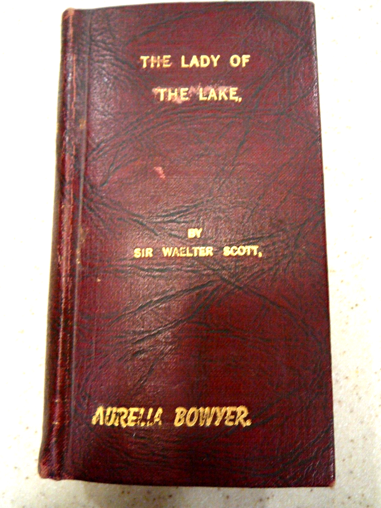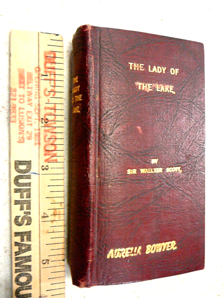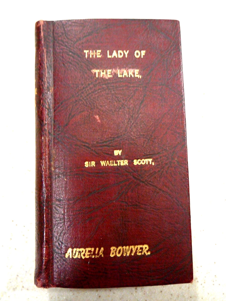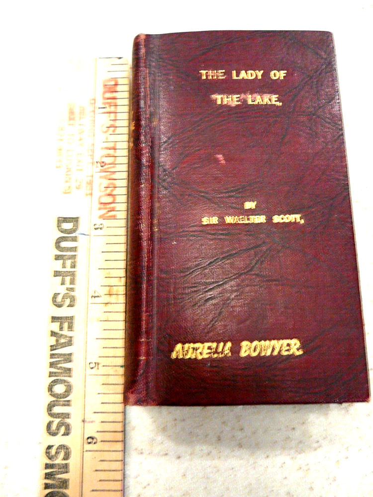 Rare 1831 "The Lady of the Lake" by Sir Walter Scott. Completely Leather Bound in Maroon/Wine Color With Gold Lettering. Pocket-Sized Edition 5 1/4"h x 3"w x 3/4"thick. Published by John Lomax 1831. There Is No Copyright Date. Copyrighting in Early Stages Assume Was Not Filed. Imprinted on Front Cover in Gold & Written Inside Name, Aurelia Bowyer. Assume Aurelia Was A Previous Owner. Book Found In Box After Mom, Born 1913 Had Passed. Where/How She Came By, Unknown. USPS Ground Advantage is Cheaper & Faster Than Media Mail for Light Wgt Items