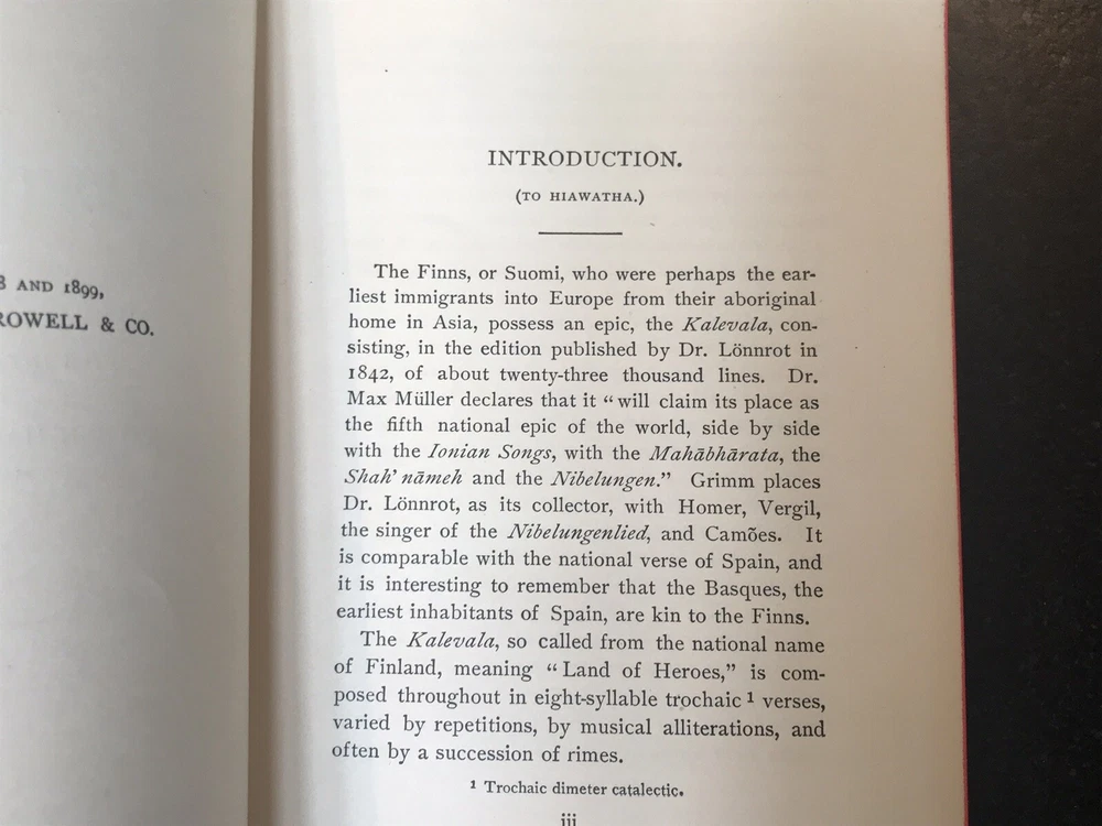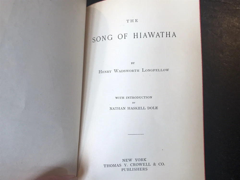 The Song of Hiawatha by Henry W. Longfellow With introduction by Nathan Haskell Dole New York - Thomas Y Crowell and Company Publishers Copyright, 1898 and 1899 This book is in good condition for its age. The cover shows wear but is solid and the pages are bright and clear. Nice copy!