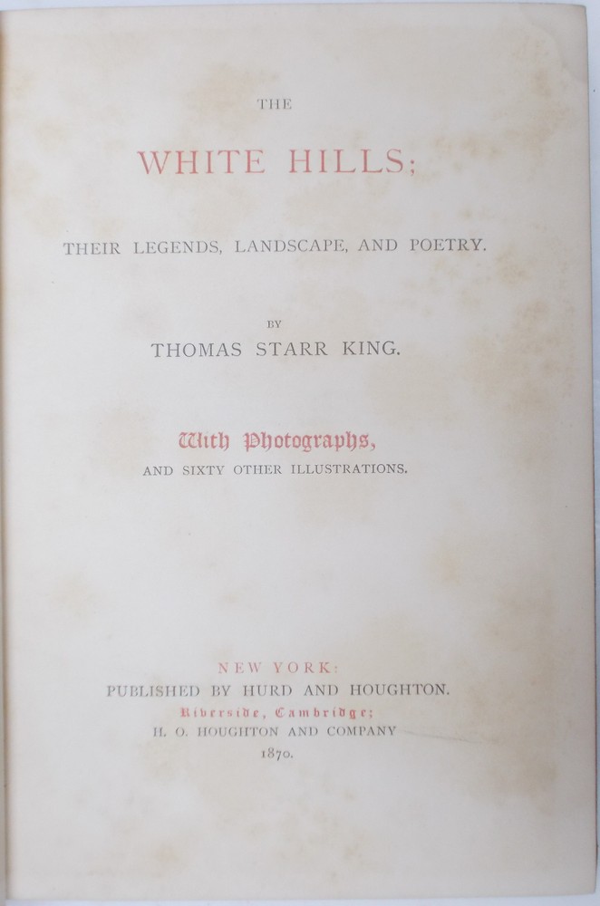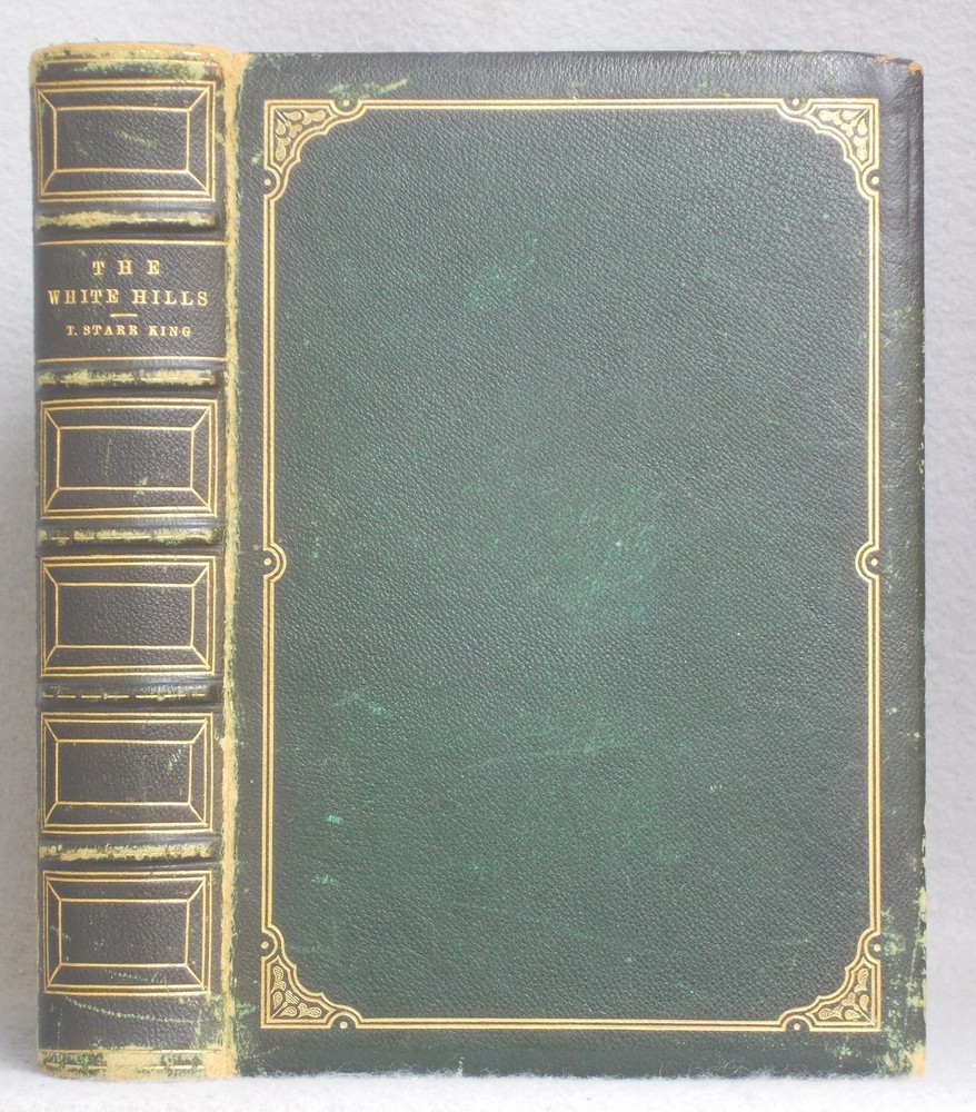 King, Thomas Starr. The White Hills: Their Legends, Landscape, and Poetry. Hurd and Houghton, 1870. Leather: VG. Handsomely bound in full morocco with gilt lettering and ornamentation, marble endpapers and all edges in gilt. Some scuffing to the leather and foxing to the leaves. An unusually nice copy in a wonderful leather binding. We can quote priority or international postage rates. We're happy to combine purchases to save you shipping fees. All items are guaranteed as described, feel free to contact us with any questions. We buy & sell books in all subjects The Book Rack 300 Oak St. #1110 Pembroke, MA Powered by eBay Turbo Lister The free listing tool. List your items fast and easy and manage your active items.