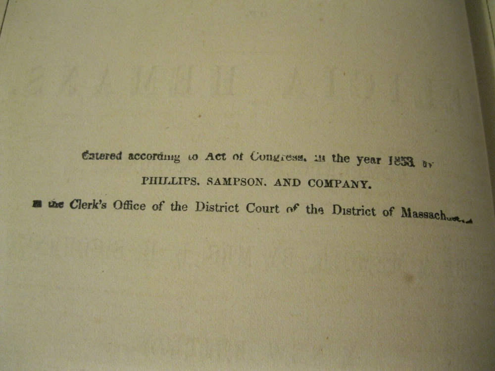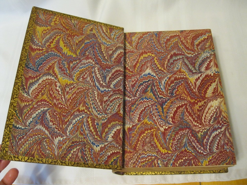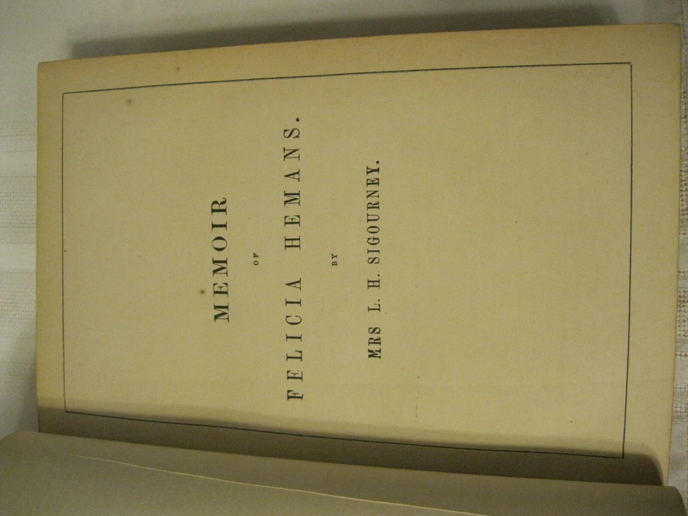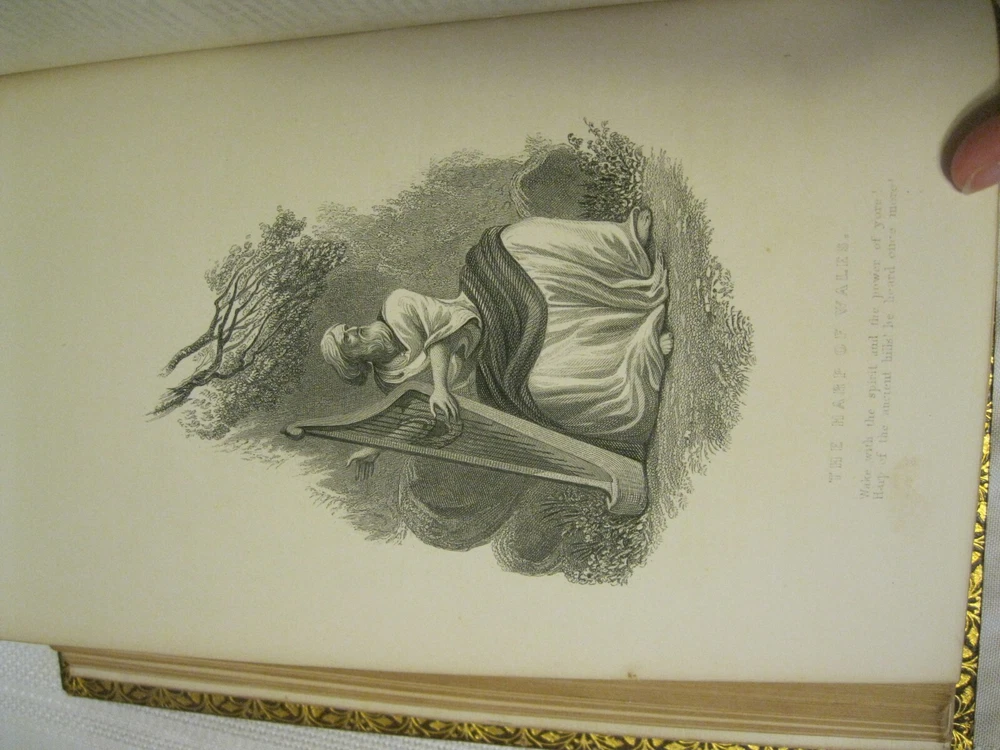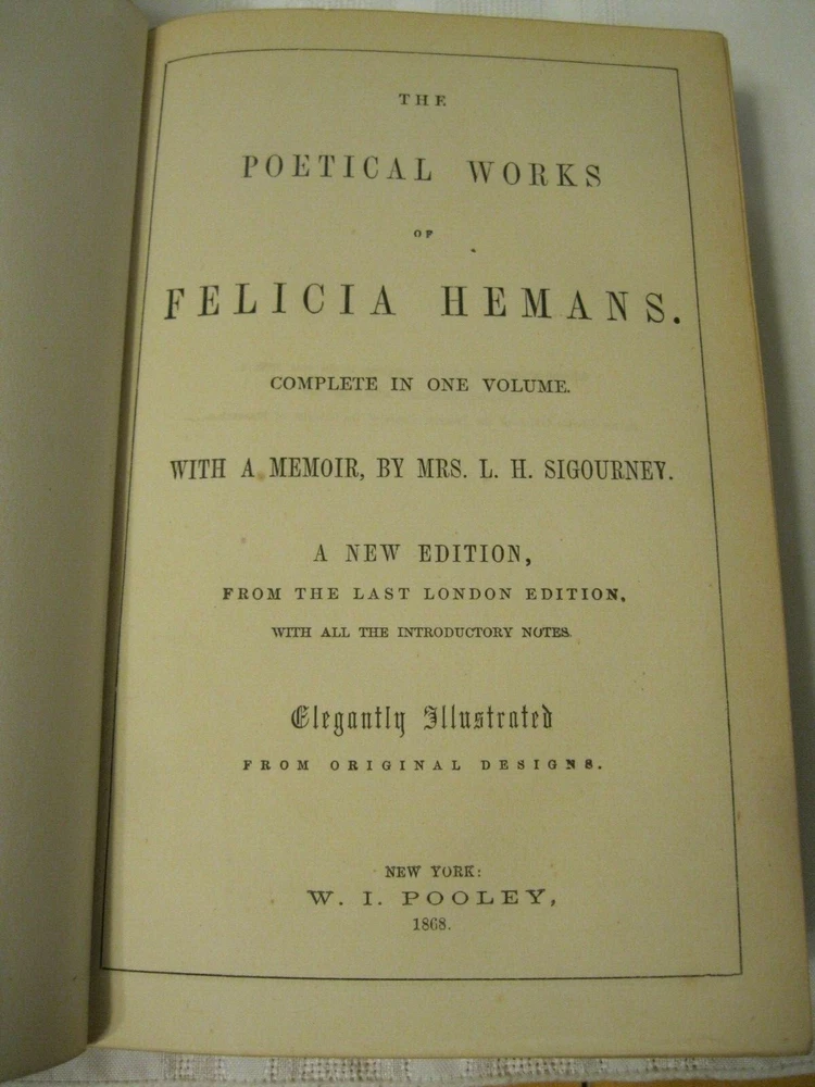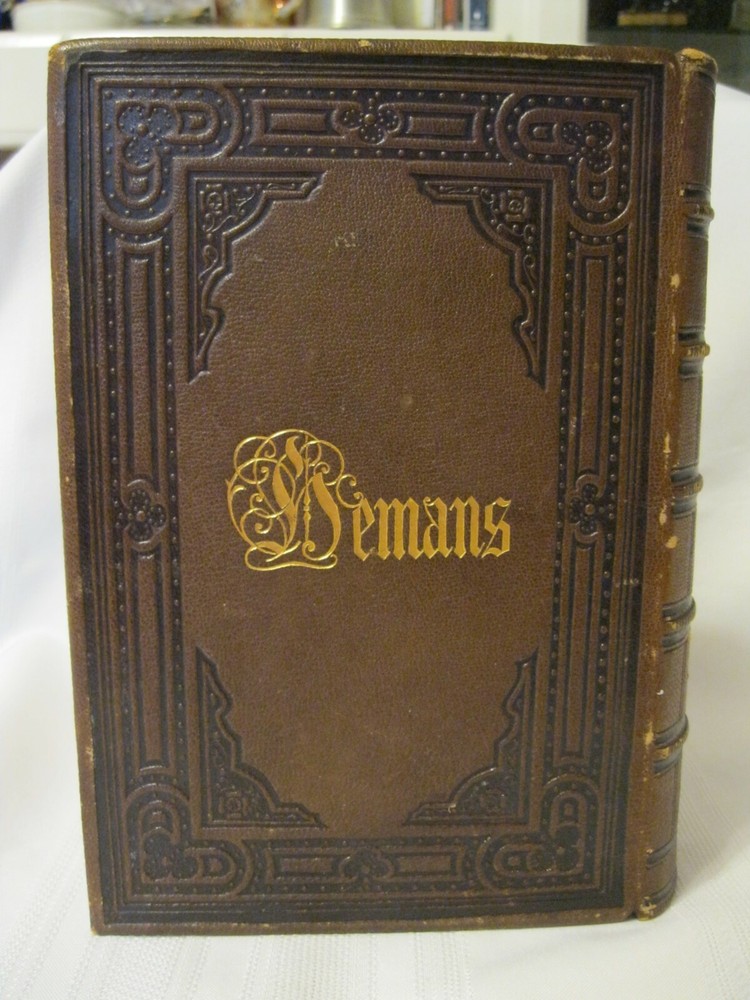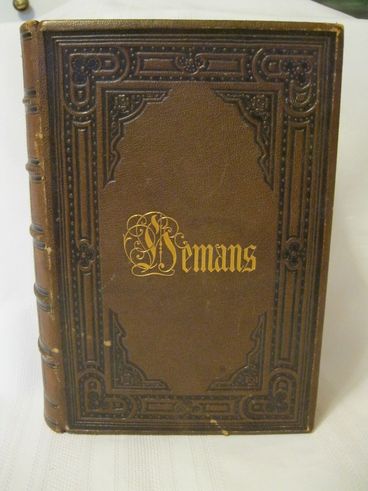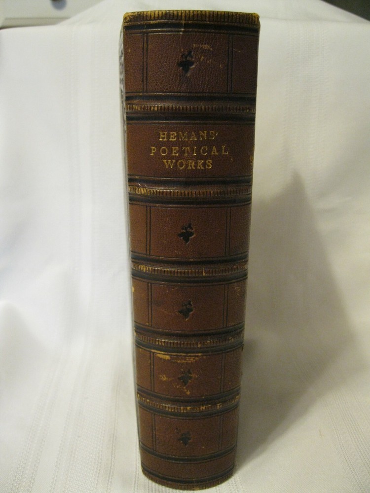 New edition originally published in 1853. The complete poetical works of Felicia Hemans in one volume with a memoir by Mrs. L.H. Sigourney. Illustrated. Beautifully bound in brown leather with blindstamped decoration on covers. Features gilt lettering on covers and gilt page edges, raised bands on spine. Some small scratches on leather. Endpapers are marbled. Previous owner's name and date on 2nd free endpaper. Tissue guard is detaching. Binding is fairly tight. Postage is expensive due to weight of book. Please look at all photos. Will combine shipping to the lowest price for the size and weight of package. Free local pick up is available Canadian residents are subject to HST/GST For orders outside of Canada there may be import charges or delays due to customs in your country. If you require a tracking number please choose the appropriate service.