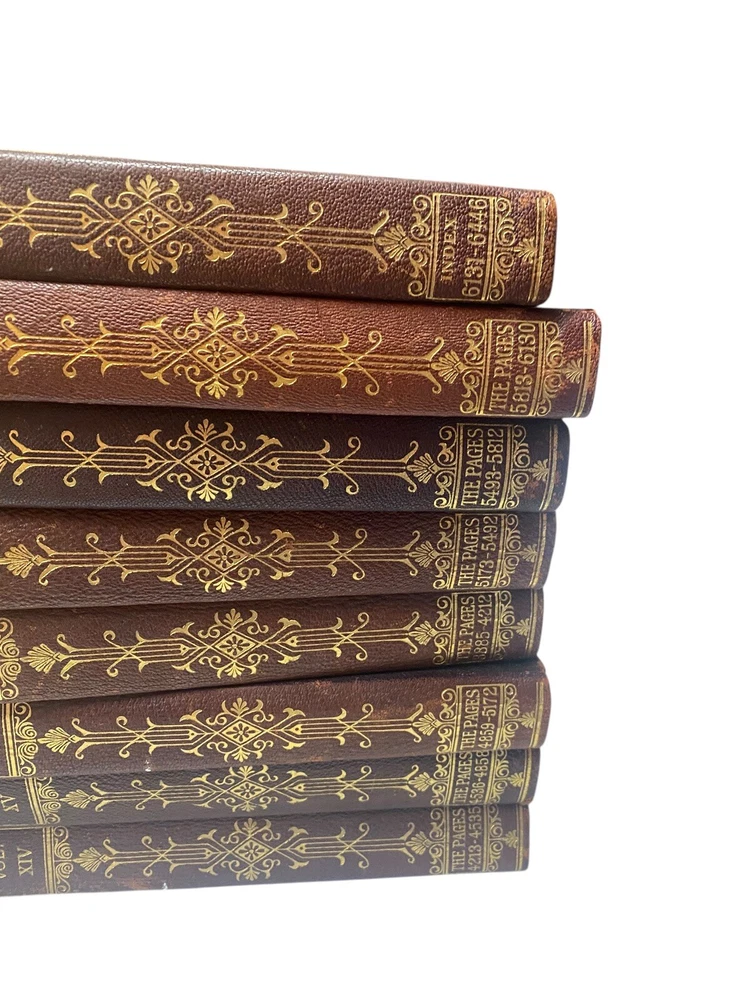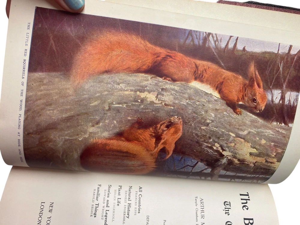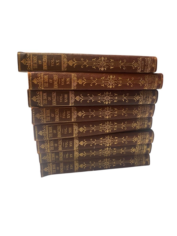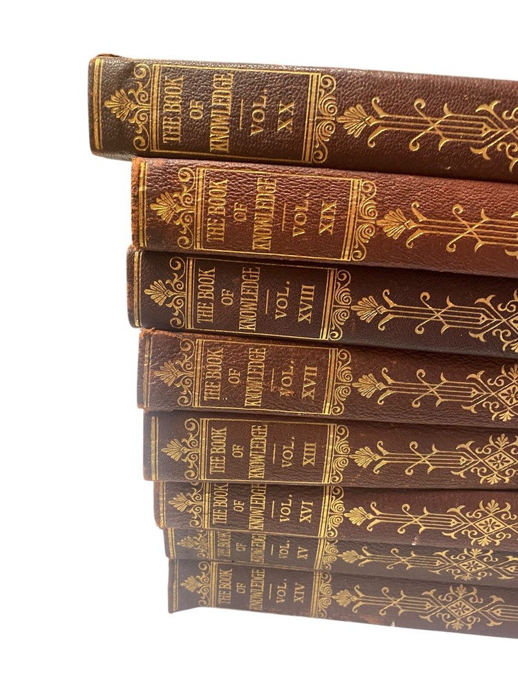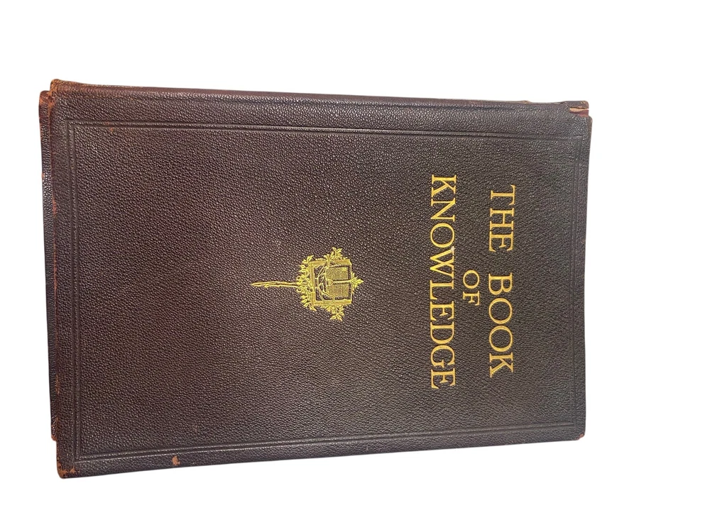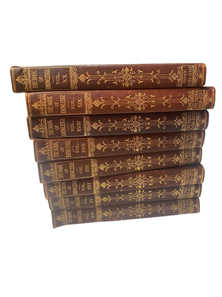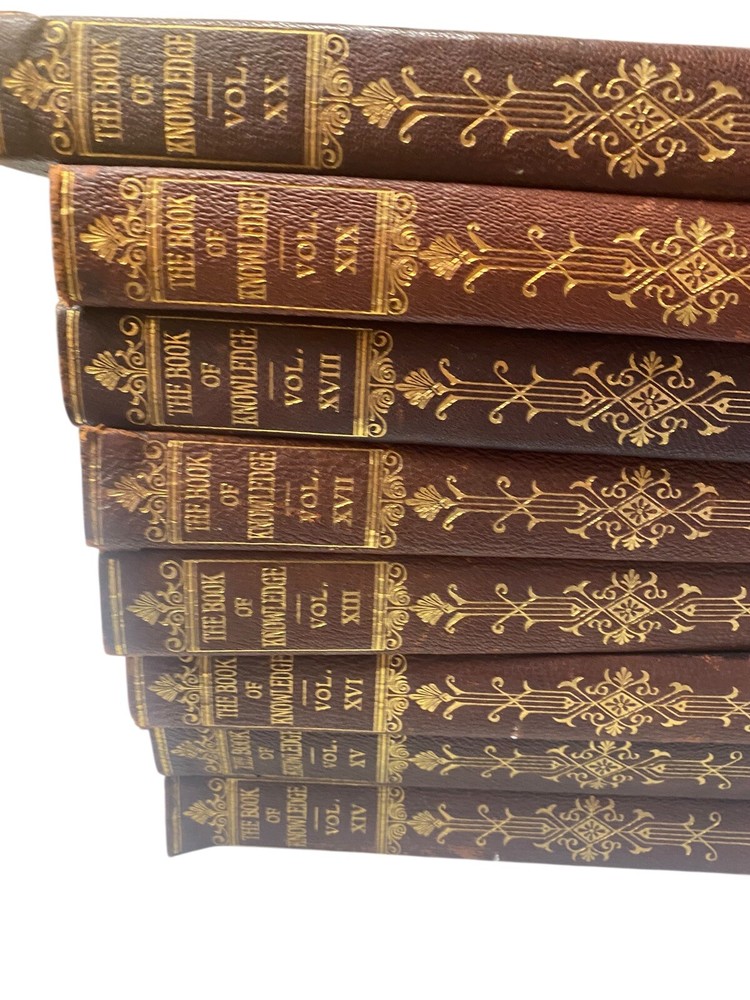 Antique The Book of Knowledge Leather Leatherette Books Set Burgundy Red wit Gold Gilt Lettering Colorful Lithographs Gorgeous Collection Set 8 Books Good gently pre-owned vintage condition with some ...