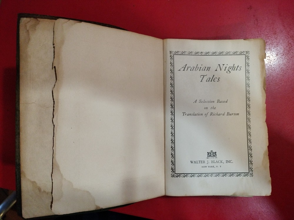 This book is a treasure trove of Arabian Nights Tales, based on the translation of Richard Burton. The leather binding adds a touch of elegance to the book, which was published by Walter J. Black, Inc. in New York, New York. The book is written in English and is an original piece, not a facsimile. The book covers a range of topics, including fairy tales and fantasy, and is perfect for collectors and enthusiasts of literature and fiction. The book is not personalized and not signed, making it a great addition to any collection. The volume is 7 5/8 inches tall, 5 1/2 inches deep and 1 1/4 inch wide. The spine is tight but the word block is separating from the cover at the front and back cover plates. Two pages are loose but the rest are whole and unfolded. Some water damage to one corner. Pages have some discoloration due to age. Leather cover is worn on the edges