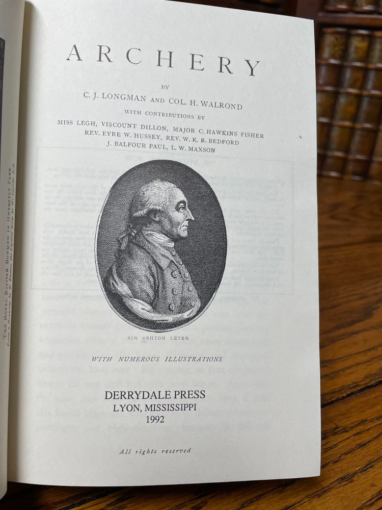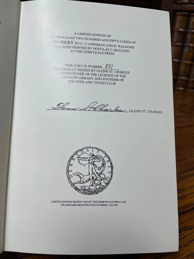 Legends of the Longbow: Archery, by C J Longman and H Walrond Signed Limited and Numbered this being #841 of 1250 published. Bound in leather, with gold gilt design and edges. Printed by Douglas C Mauldin, Derrydale Press 1993 Personally Signed by Glenn St. Charles, Commissioner of the Legends of the Longbow Library and Founder of the Pope and Young Club. Well respected classic work in Archery. Near Fine: Unmarked. Minimal handling and use wear.