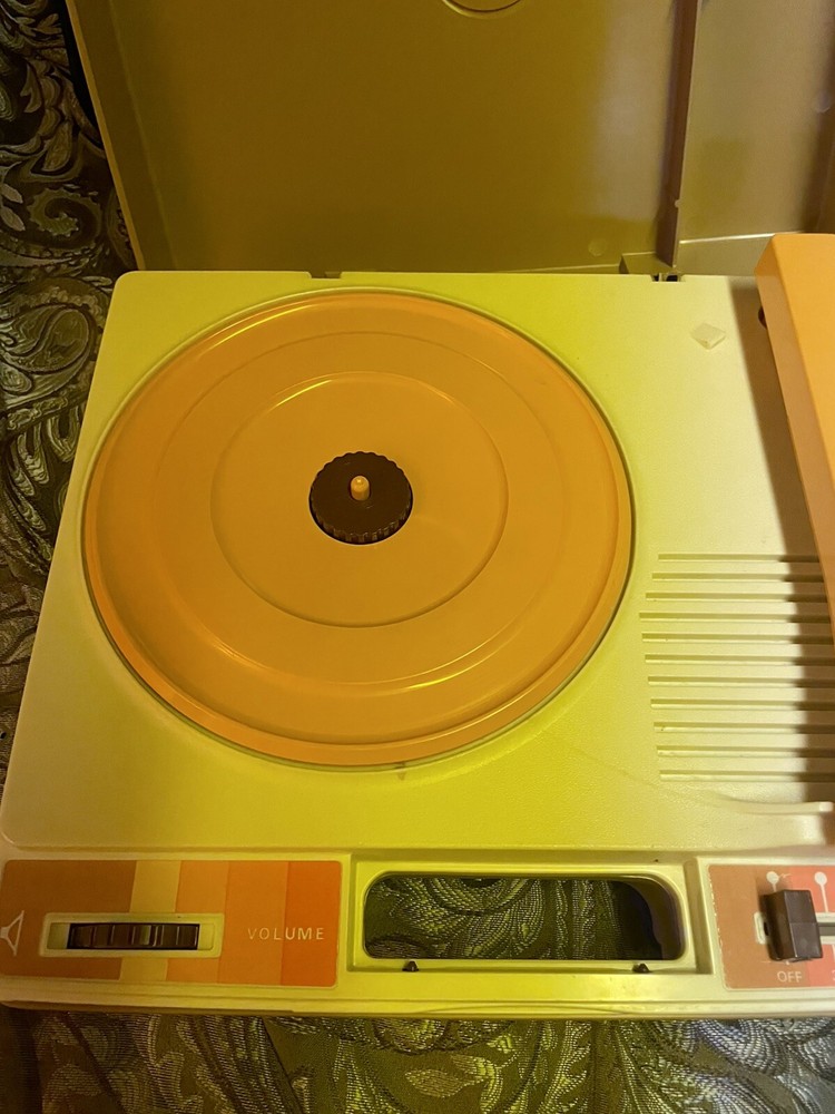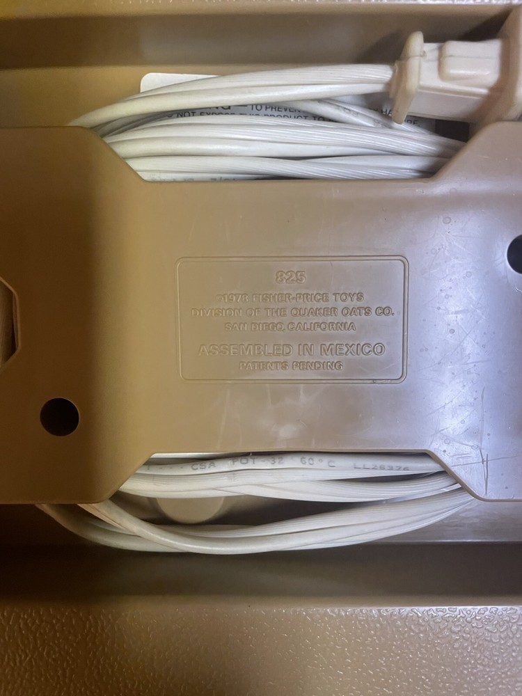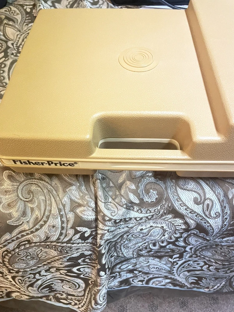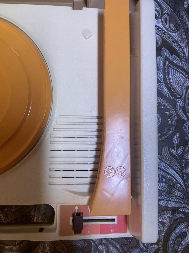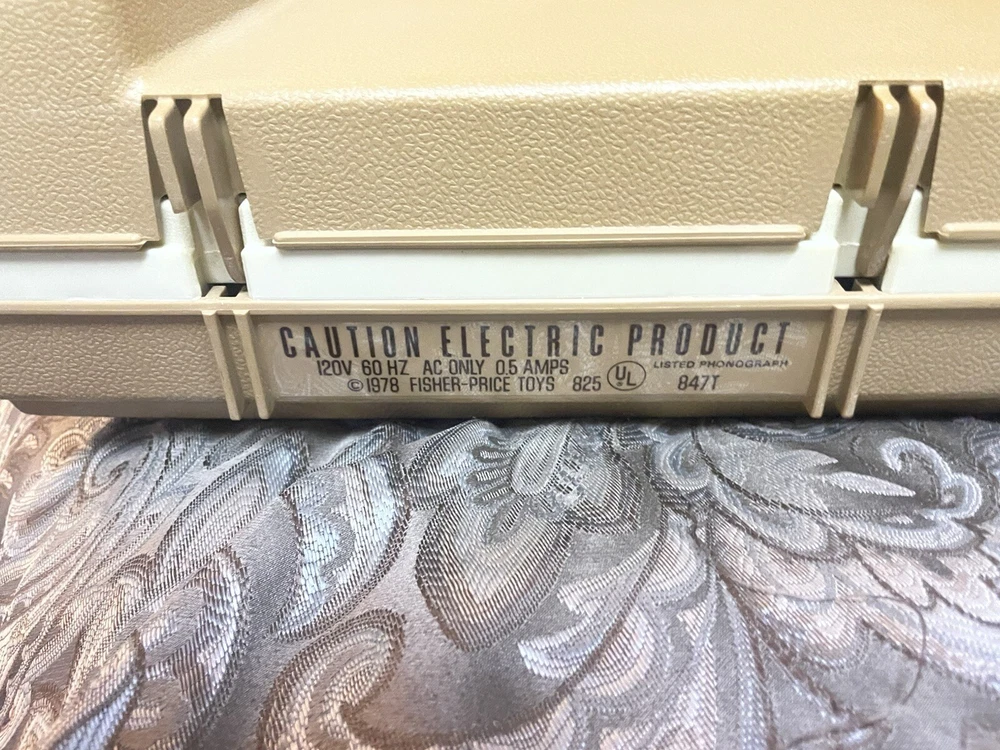 This is a 1970s Fisher-Price portable turntable record player model 825, featuring 33 and 45 RPM speeds. It is a vintage item from 1978, known for its portability and ability to play records at different speeds.