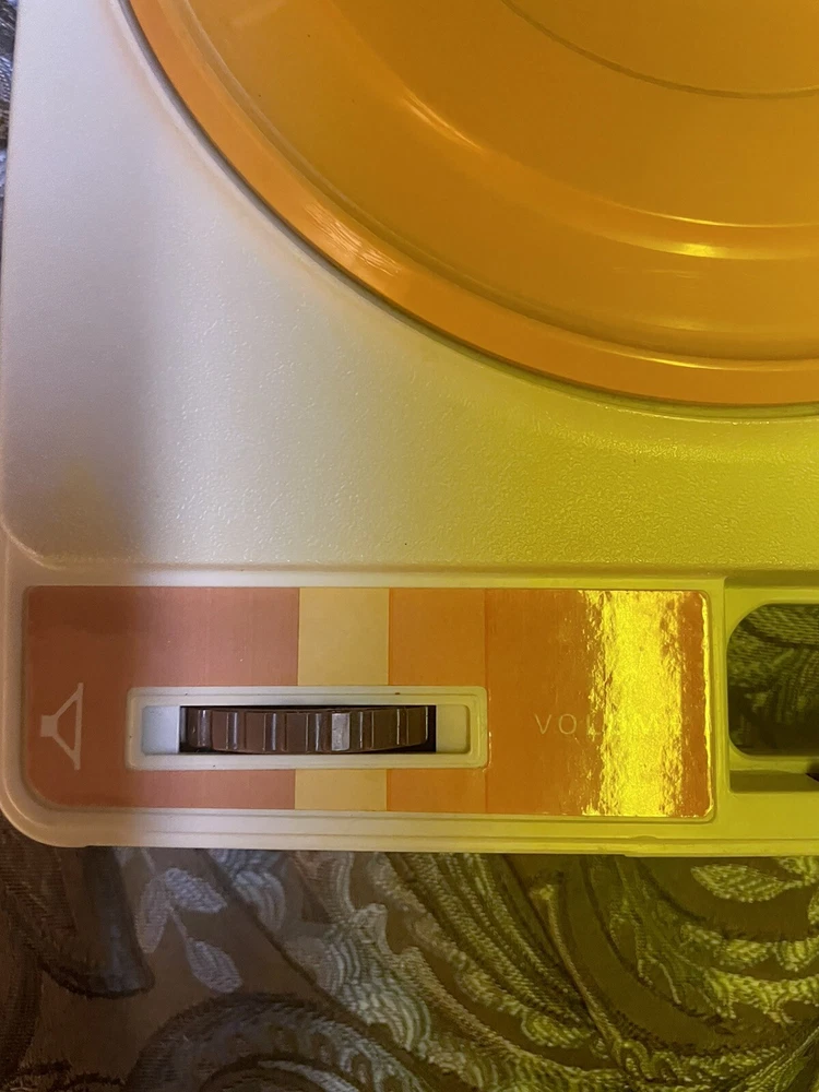 This is a 1970s Fisher-Price portable turntable record player model 825, featuring 33 and 45 RPM speeds. It is a vintage item from 1978, known for its portability and ability to play records at differ...