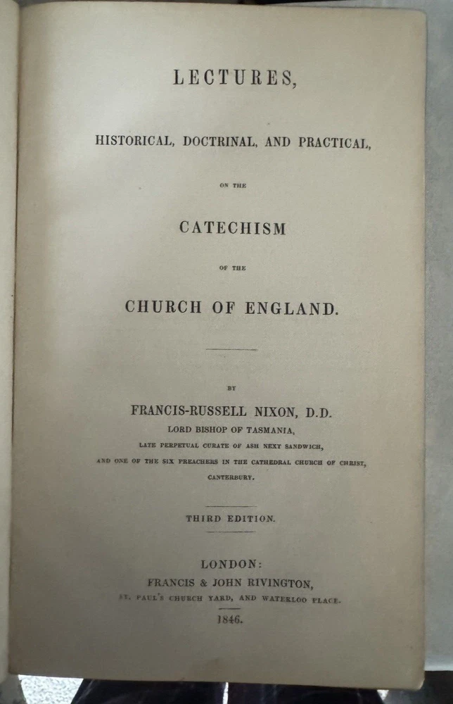 This vintage third edition of BP Nixon on the Catechism Lectures is a must-have for adults interested in religious and spiritual topics. The leather-bound book measures 8 3/4" in length, 5 1/2" in width, and 1 3/4" thick, with a total of 652 pages. The book, published by Francis & John Rivington in the 1800s, is a nonfiction narrative type that covers the topic of the Catechism, religion, and Christianity. It is authored by Francis-Russell Nixon, D.D., and Stephen Keenan, and is perfect for those who want to learn more about the historical, doctrinal, and practical aspects of the Catechism. This book is not personalized and is not intended for inscribed individuals.