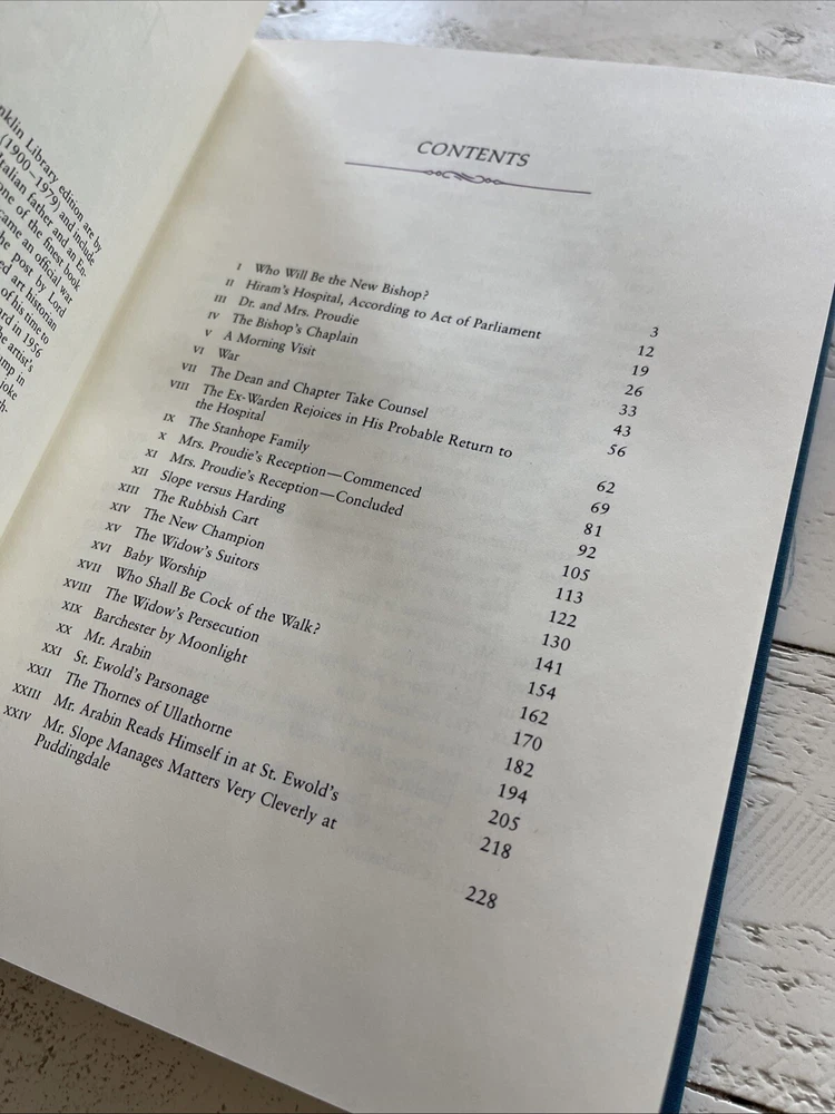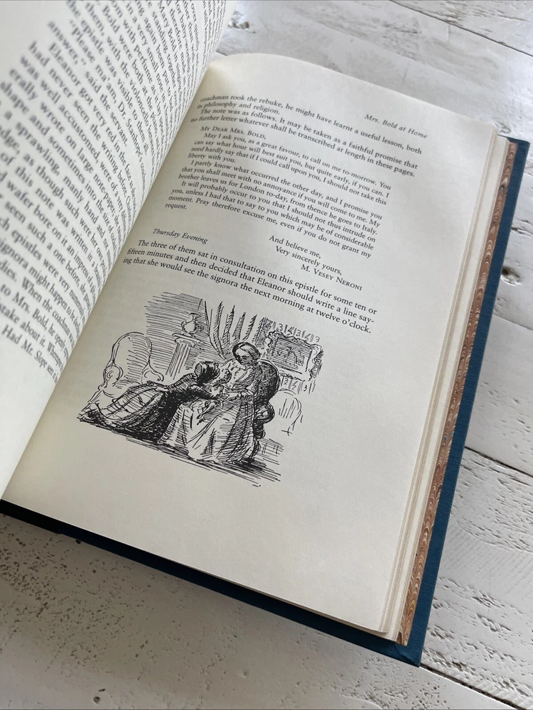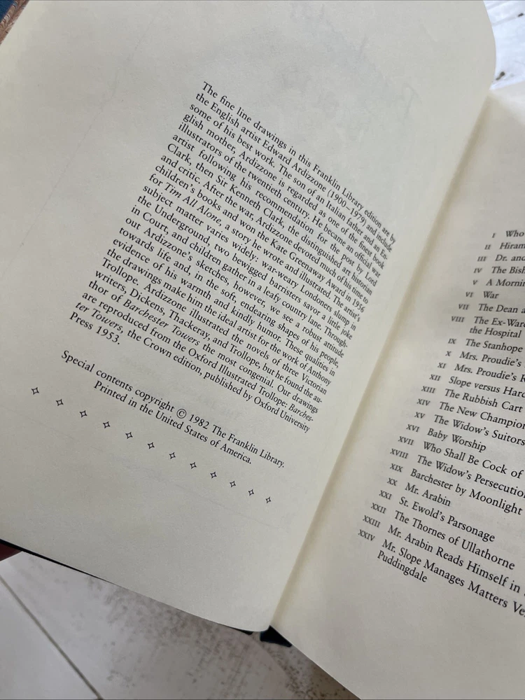 This is a **1982 Franklin Library** edition of *Barchester Towers* by **Anthony Trollope**, featuring **illustrations by Edward Ardizzone**. It is bound in **1/4 leather with gilt embellishments**, a **hubbed spine**, and **moiré endpapers** with a sewn-in ribbon marker. A beautiful collector’s edition from Franklin Library’s series of finely bound books. **Condition Notes:** - The book is in **very good condition** with only light shelf wear. - There is a **prior owner’s bookplate** affixed to the front endpaper (see photos). - The binding is tight, and pages are clean with no writing or underlining. A fantastic addition to any **Franklin Library** or **Anthony Trollope** collection. Ships securely with tracking. Please see pictures for overall condition, and details.