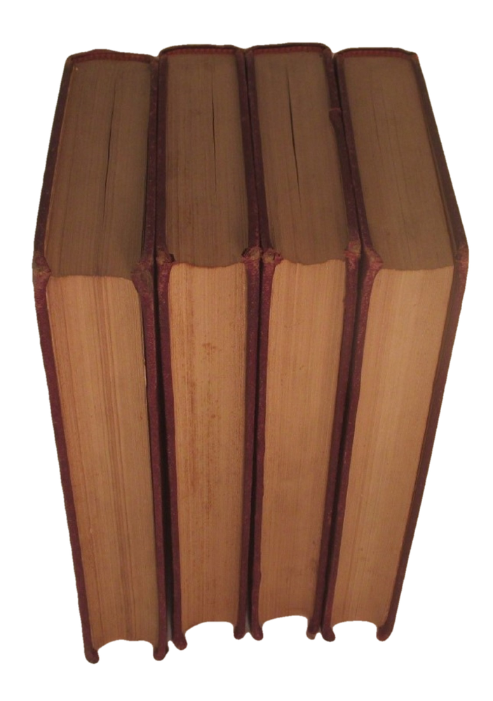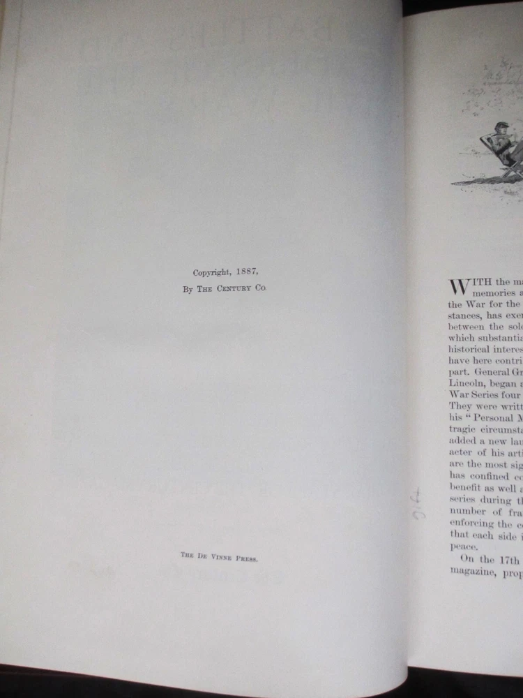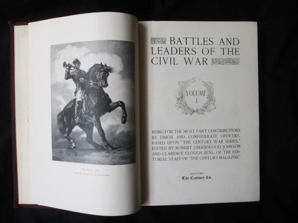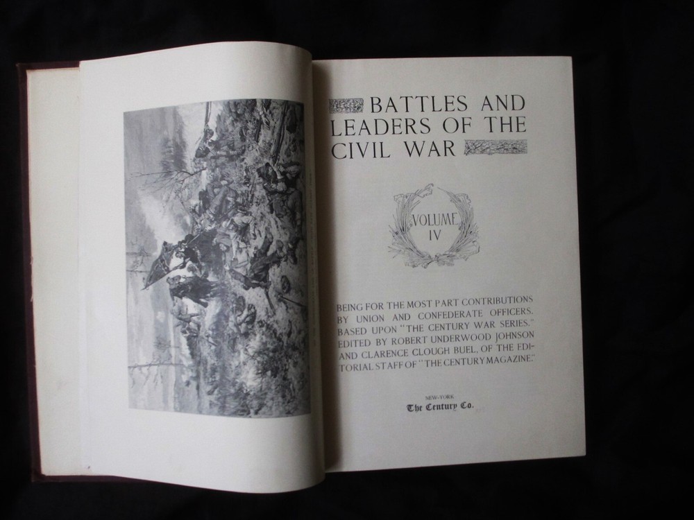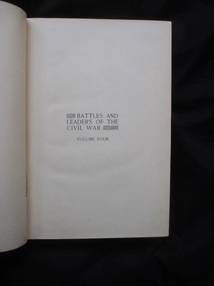 Battles and Leaders of the Civil War Four Volume Set 1887 The Century Co. De Vine Press Red Leather with deboss & black graphics ex library with limited identifiers ______________________________________________ Being for the most part contributions by Union and Confederate officers. Based upon “The Century War Series.” Edited by Robert Underwood Johnson and Clarence Clough Buel, of the editorial staff of “The Century Magazine.” With the main purpose in its origin of interesting veterans in their own memories and of instructing the generation which has grown up since the War for the Union, the “Century War Series” through peculiar circumstances has exerted an influence in bringing about the better understanding between the soldiers who were opposed in that conflict. This influence, of which substantial evidence has been given, North and South, lends additional historic interest to the present work. Many commanders and subordinates… Volume 1 750 Pages Illustrated 1887 Copyright withdrawn stamp ffep & back endpaper - pencil notes back endpaper - text unmarked - sound binding/hinges intact - moderate cover wear at edges/corners Volume 2 760 pages Illustrated 1887 Copyright withdrawn stamp ffep & back endpaper - pencil notes back endpaper - text unmarked - sound binding/hinges intact - moderate cover wear at edges/corners Volume 3 752 pages Illustrated 1884 & 1888 copyright withdrawn stamp ffep & back endpaper - pencil notes back endpaper - text unmarked - sound binding/hinges intact - moderate cover wear at edges/corners Volume 4 829 pages Illustrated - 1884 & 1888 copyright withdrawn stamp ffep & back endpaper - pencil notes back endpaper - text unmarked - front hinge pulled/back hinge intact - moderate cover wear at edges/corners