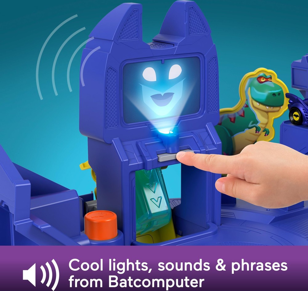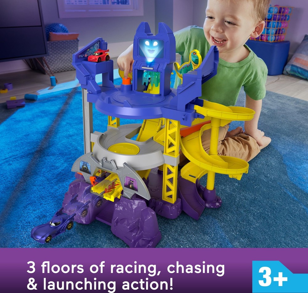 Product Page Batwheels Race Track Playset with Batcave Lights Sounds and 2 Toy Cars Description: Preschool kids can relive all the racing, chasing, and crime-fighting action of DC’s Batwheels series with this Batwheels Launch & Race Batcave playset from Fisher-Price. Styled like the Batcave from the show, this toy race track features 3 floors of play, an elevator to travel toy cars around the set, a spiral speedway, and super cool lights, sounds and phrases. Playset comes with two 1:55 scale toy cars styled like Bam the Batmobile and Redbird. Requires 3 AAA (LR03) batteries (included). Features: Kids can race & chase toy cars with this Batwheels race track playset styled like the Batcave with cool lights and sounds 3 floors of play: Kids can take vehicles up and down the elevator; comes with Bam the Batmobile and Redbird 1:55 scale toy cars Kid-controlled race & launch action: Lever lets kids launch vehicles from the Batcave or send them racing down the spiral ramp Packed with pretend play: get mission directives from the Batcomputer, ride the elevator up & down, visit the mechanic station, spin on the turntable Encourages imaginative play and storytelling for preschool kids ages 3 years and older