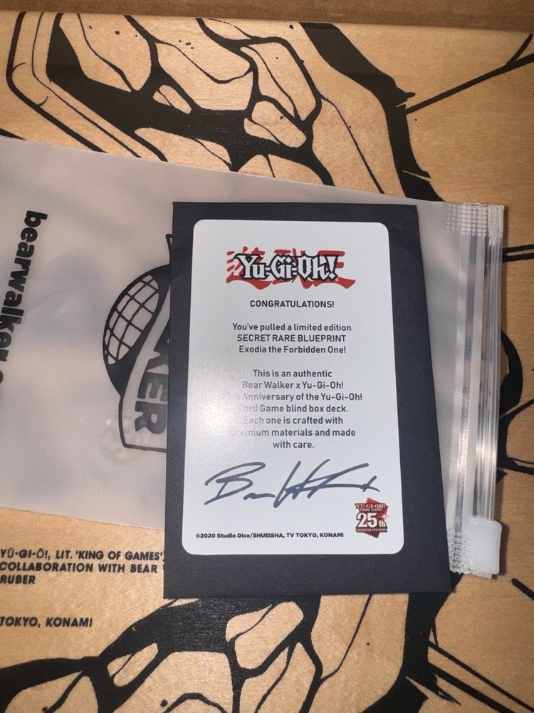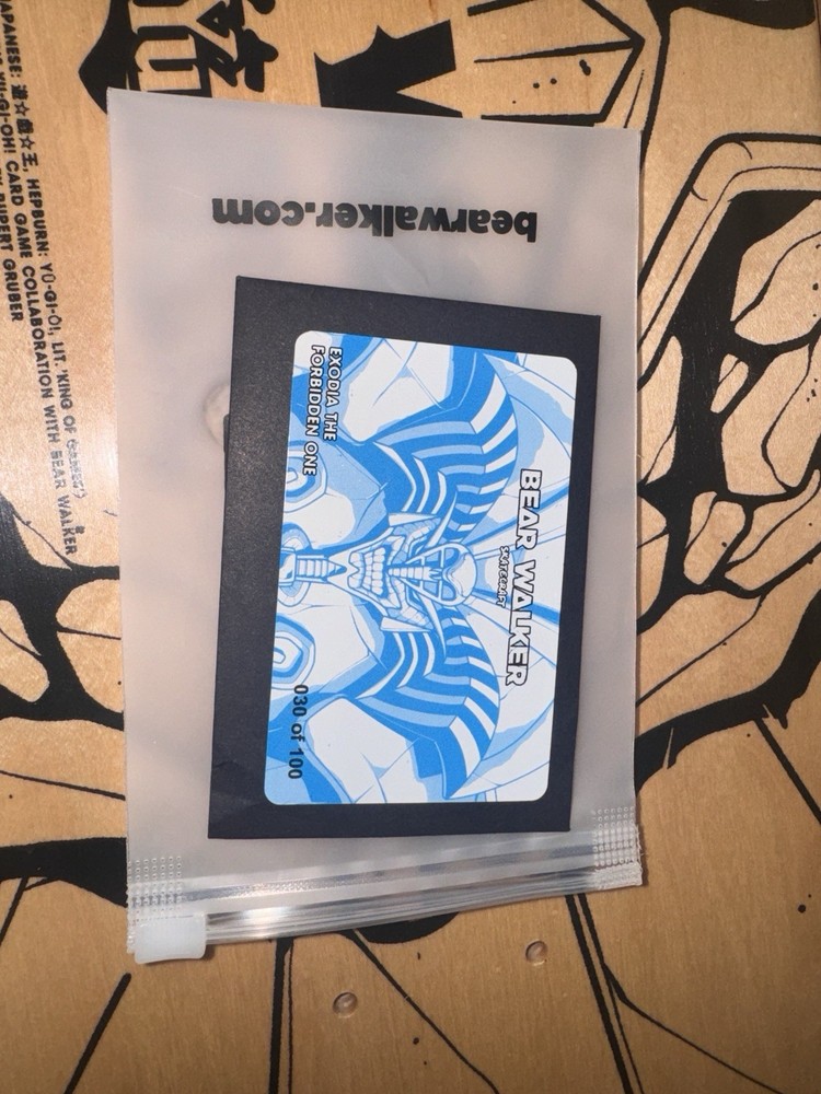 This is a limited edition 30/100 Bear Walker X Yu-Gi-Oh skateboard pulled from a blind box, all original packaging and receipt included. Exodia The forbidden One Secret Rare