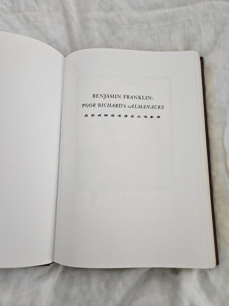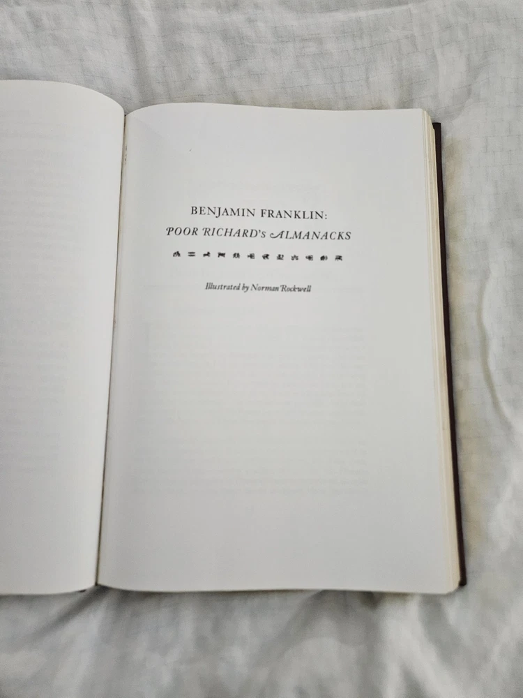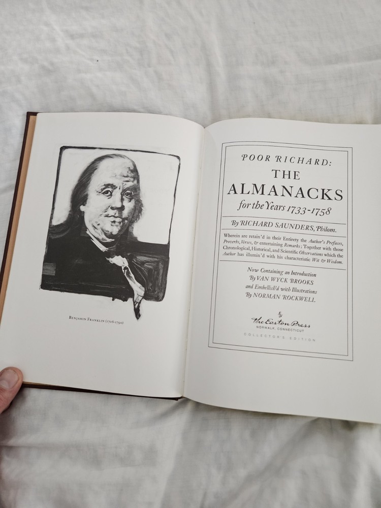 RARE Easton Press Benjamin Franklin: Poor Richard's Almanacks Leather Bound w/ Norman Rockwell Art 📚✨ A MASTERPIECE of AMERICAN HISTORY & ART — SHIPS FAST! ✨📚 Up for grabs is a stunning collector’s edition of Poor Richard's Almanacks by Benjamin Franklin , beautifully bound in genuine leather by Easton Press 🦅. This heirloom-quality volume is lavishly illustrated by the legendary Norman Rockwell 🎨—bringing Franklin’s wit and wisdom to life in vivid, heartwarming detail! ✔️ Bound in rich brown leather with 24kt gold accents ✔️ Hubbed spine with ornate gold detailing ✔️ Archival-quality paper, sewn binding, gilded page edges ✔️ Includes moiré endpapers and attached satin ribbon ✔️ Published by Easton Press in their Library of American History series This is more than just a book—it’s a treasured collector’s item for lovers of Americana, colonial history, classic literature, or fine bookbinding 🇺🇸📖 Franklin’s timeless insight paired with Rockwell’s iconic art makes this edition a joy to read and a true showpiece for any personal library! Perfect for: ⭐ History lovers ⭐ Easton Press collectors ⭐ Franklin & Rockwell fans ⭐ Libraries, offices, or scholars of American history Condition: 📦 Excellent overall! Minor signs of shelf wear only. Carefully stored in a clean, smoke-free environment. Shipping: Your book will be securely packaged and shipped with tracking to ensure it arrives safely. Don’t miss this rare and elegant edition —a unique blend of literature, history, and art! #CollectibleClassic #BenjaminFranklin #EastonPress #PoorRichardsAlmanack #NormanRockwell #AmericanHistory #FoundingFathers #WitAndWisdom #RareBooks #LeatherBoundBooks #GildedPages #LuxuryBooks #ColonialAmerica #FranklinWisdom #RockwellArt #VintageIllustration #USAFounders #EastonCollector #RockwellCollector #PatrioticReads #HistoricalBooks #PhilosophyOfLife #FranklinSayings #OldWorldCharm #18thCenturyAmerica #LimitedEditionBook #ElegantLibrary #AntiqueVibes #GoldStamped #TimelessReads #WisdomThroughTheAges #FranklinQuotes #MoralsAndMaxims #RockwellMasterpieces #AmericanTreasure #IllustratedEdition #RareFind #BookCollectorsUnite #PrestigeBooks #HeirloomLibrary #GiftsForReaders #LuxuryGiftIdeas #BooksThatMatter #HistoricVoices #ArtLoversBook #RareAndBeautiful #AmericanGenius #CollectorShelf #ClassicLiteratureLovers #RockwellInBooks #FranklinLegacy #BeautifulBinding #BooksWithSoul #IntellectualGifts #BookshelfGoals #InspirationalReads #FoundersWisdom #EnlightenmentEra #ColonialGenius #ArtInBooks #RevolutionaryReads #BooksWorthReading #FranklinFanClub #IllustratedTreasures #CulturalIcons #LibraryGoals #GiltEdgeBooks #FranklinAlmanack #RareAmericanBooks #KnowledgeIsPower #BooksThatInspire #FranklinCollectors #EastonPressCollectors #LimitedEditionReads #FineBindingBooks #IconicAuthors #LuxuryBookshelf #RockwellAmericanStyle #LegacyInLeather #PhilosophicalGems #TreasuredVolumes #AmericanIcons #BooksOfSubstance #RareEditionAlert