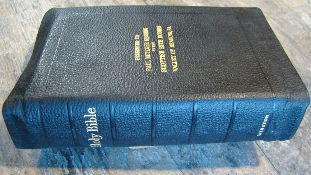 Undated. Freemasonry Presentation Copy. Scottish Rite Bodies, Valley of Reading, Pennsylvania. ࿇ KJV. Leather Bound with original vintage retail box. Box shows heavy wear with scuffing, chipping and fraying at edges and corners. Two box corners split (see photo). Bible binding tight. Text is clean, unmarked. Covers, corners and page edges show no shelf wear. Looks like never used. Very good condition.